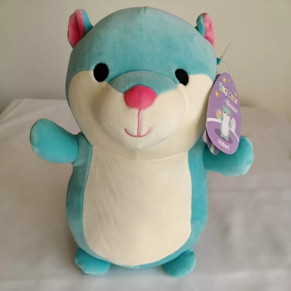 This adorable Squishmallow HugMees plush toy is perfect for Easter! Meet Hobart, the lovable Easter Hamster, and give him a big hug. He's made of soft, plush material and is perfect for snuggling with. Plus, he's washable, making him easy to clean and keep clean. Hobart is 12 inches tall and comes in a teal color. He's recommended for children ages 3 and up, and is part of the Kellytoy character family. Made in China, this toy is perfect for Easter and any other occasion. Bring home Hobart today and give him a big hug!