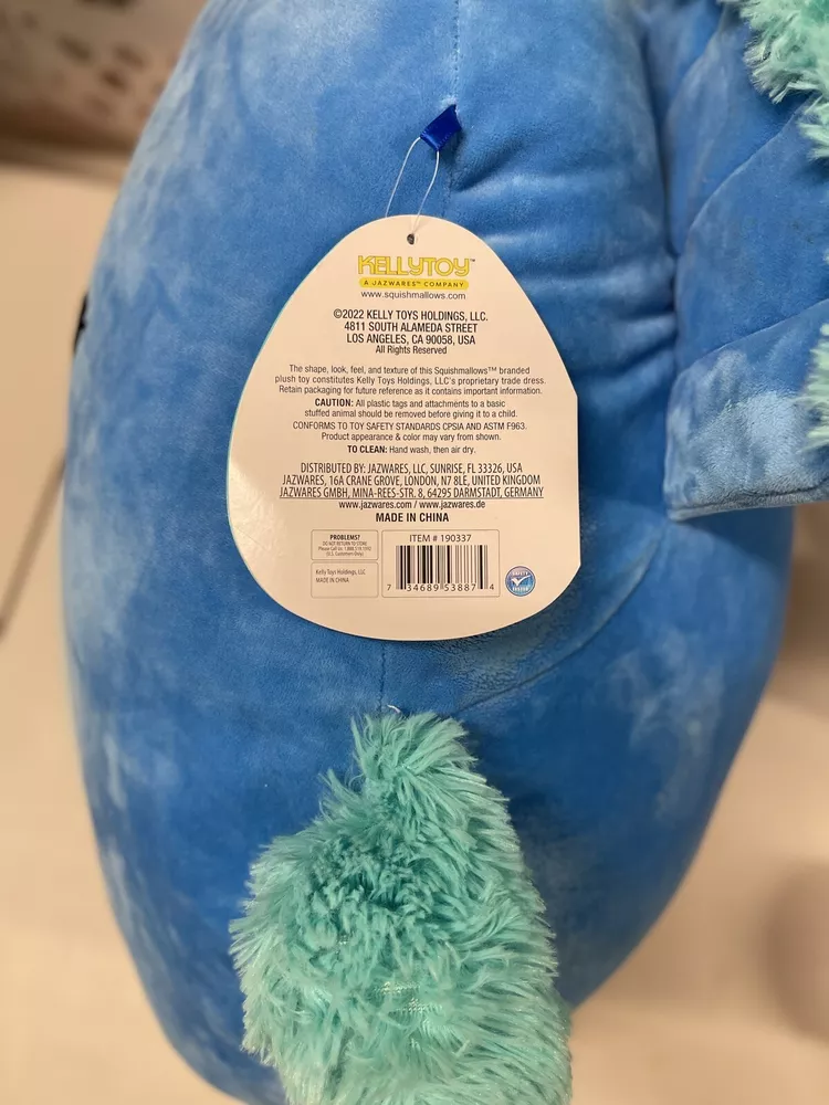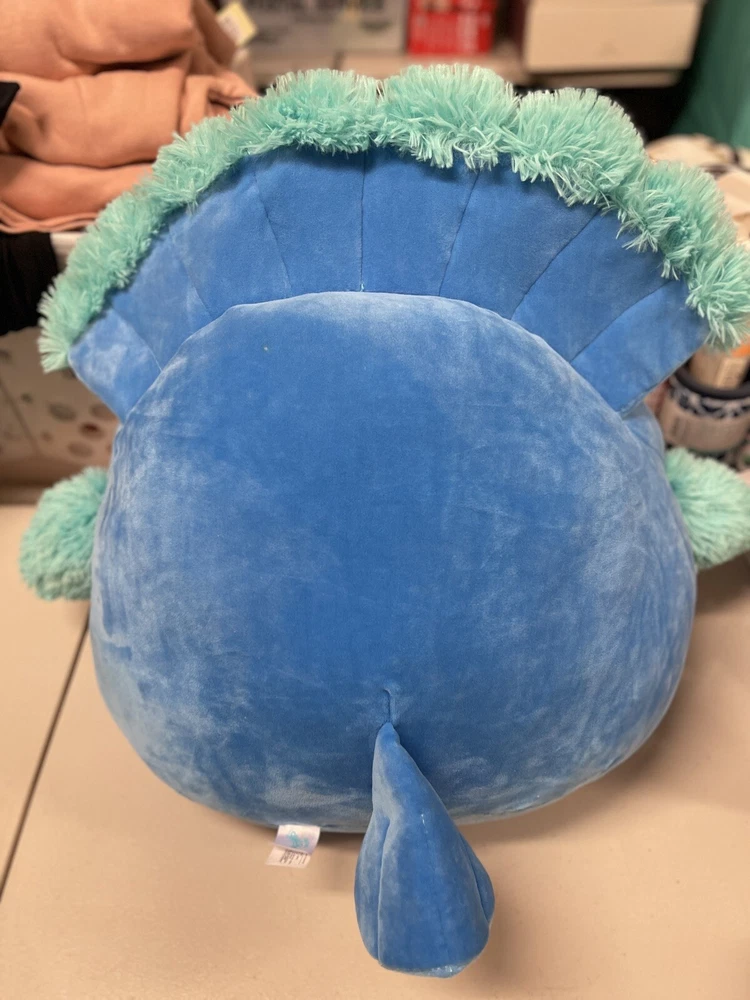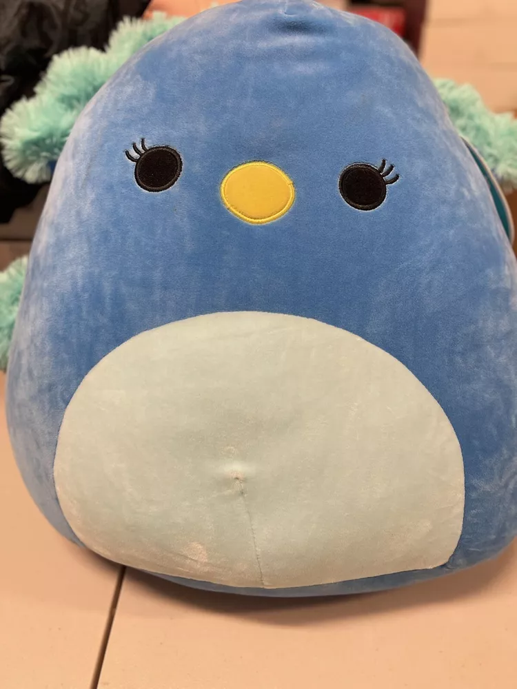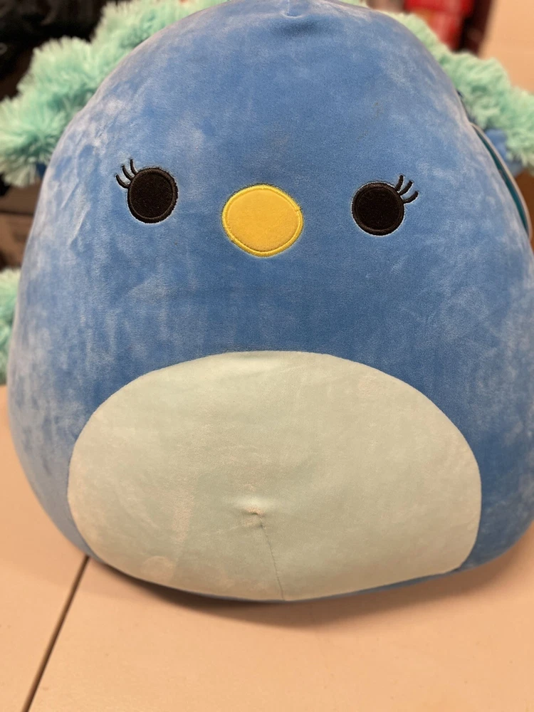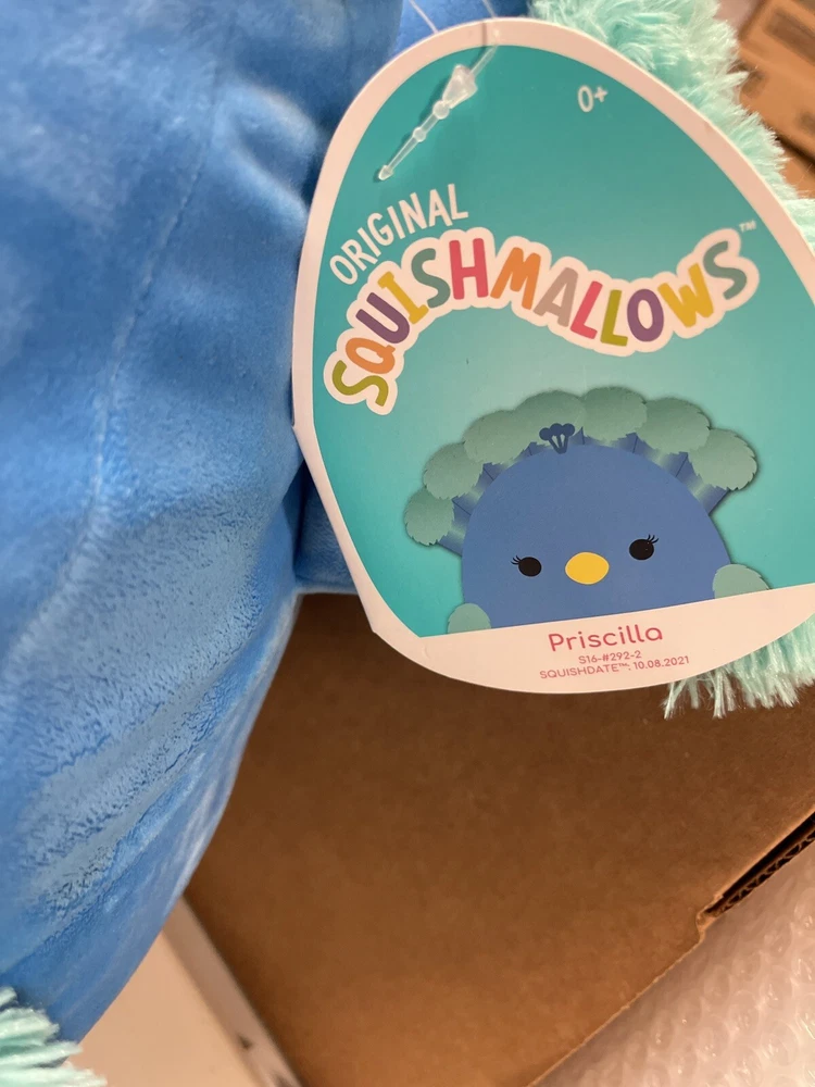 This Squishmallows Priscilla Blue Peacock is a medium-sized plush toy that is perfect for all occasions. It features a beautiful blue color and is part of the Squishmallows character family. This plush toy is washable and has a recommended age range of 6-100 years old. The toy is made by Kellytoy and was manufactured in China in 2021. It is a great gift for children and adults alike, and its soft and squishy texture makes it perfect for snuggling. This plush toy is not part of a custom bundle and has not been modified. It comes brand new with tags attached.
