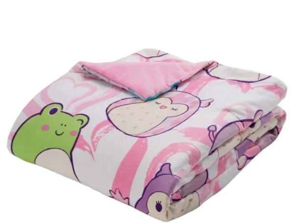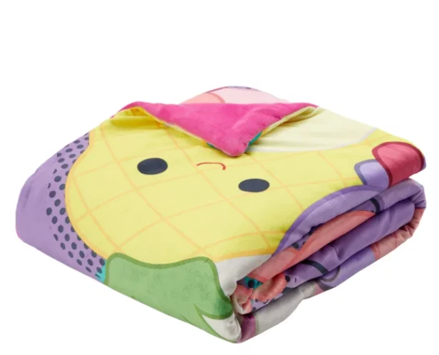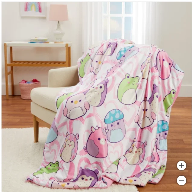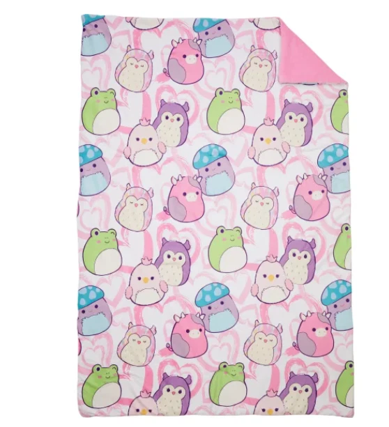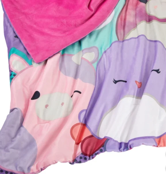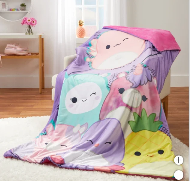 Our Snuggle™ throw was designed to have the super soft feel you get from the original Squishmallows plush. These Squishmallow throws feature patterns of iconic Squishmallows characters. They are super squishy and very snuggly. Enjoy the warmth and character they will bring to your home. Features : Super soft & squishy Vibrant printed designs of favorite characters Machine washable Made in : China Content : Shell: 95% Polyester / 5% Spandex Fill: 100% Polyester Dimensions : 50 in. x 70 in. (127 cm x 177 cm) Care Instructions : Machine wash cold separately, gentle cycle Use only non-chlorine bleach, when needed Tumble dry separately on low setting Remove promptly Do not iron. OUR POLICY We sell ONLY Authentic items. We do not sell fake or counterfeit. SHIPPING We ship your orders within 1-2 business days using standard shipping service. Delivery will take 1-5 business days (usually much faster), depending on the purchased item and location. RETURNS Returns are accepted within 30 days of the item being delivered. We must be notified of an incorrect, damaged, or defective shipment within three (3) business days from the date of delivery. Please contact us before any returns. ALL returns MUST include a Label provided by us! All returns are subject to a 20% restocking fee . The item must be returned in the same condition as it was received (including the original packaging).