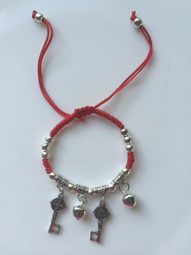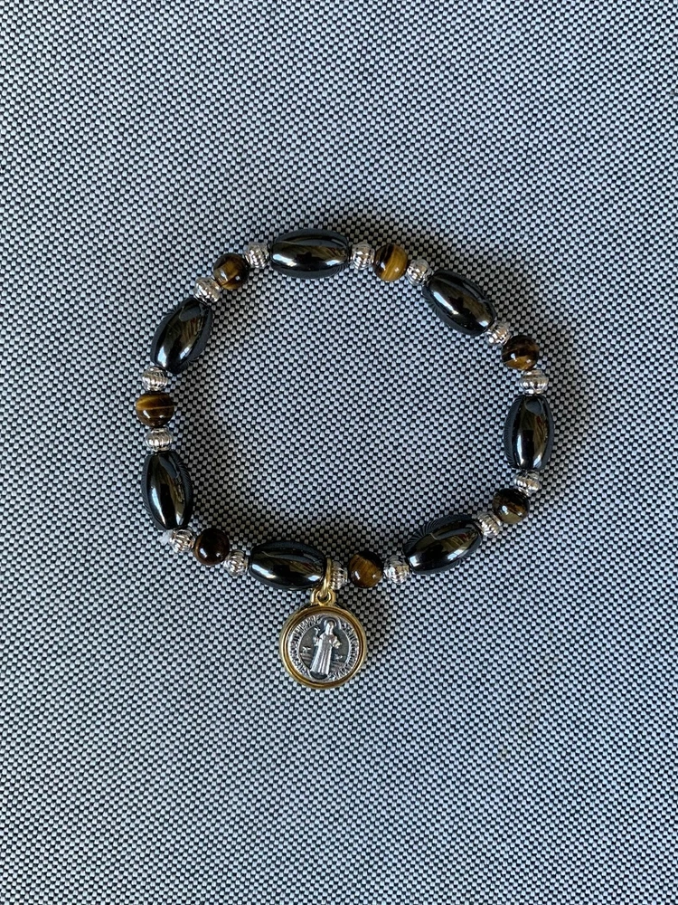 This is a very nice St. Benedict Stretch Bracelet, hematite and tiger eye beads. The medal is two tone. Measurements: Medal - 1/2 inch The Saint Benedict medal wards off all evil and converts sinners and serves as an armor against sin. A great bracelet for daily spiritual and physical protection against evil. Pulsera de San Benito hecha a mano con cuentas de hematita y ojo de trigre. La medalla mide 1/2".