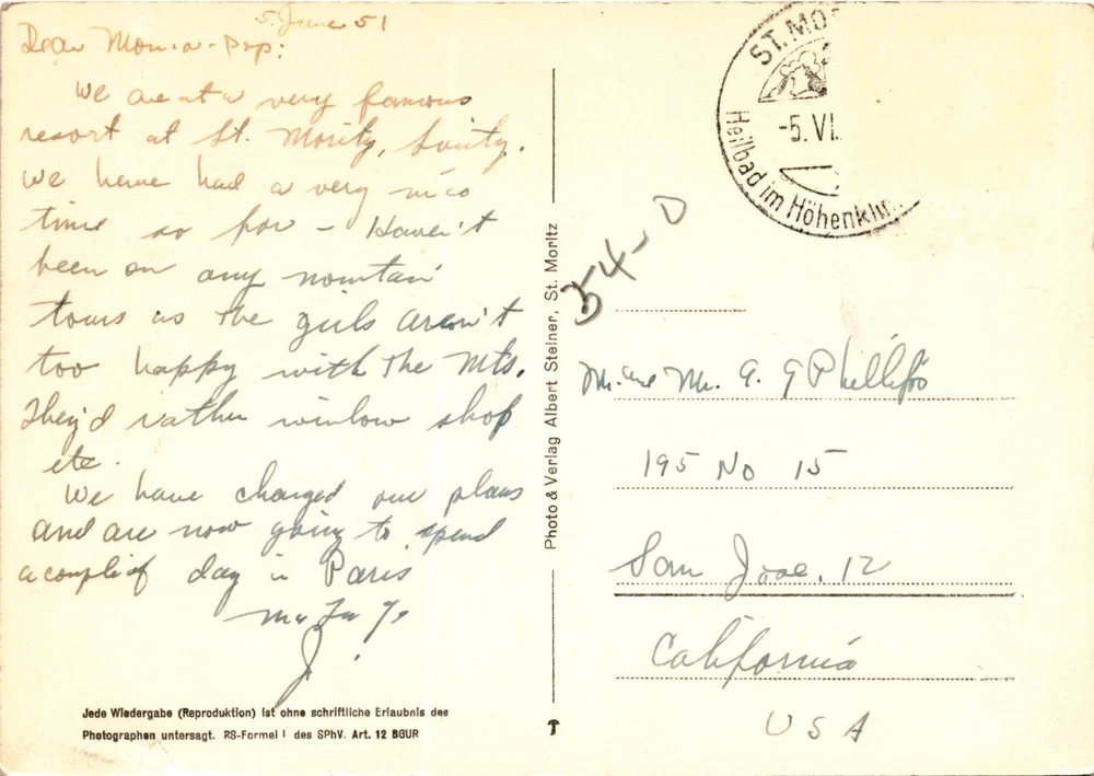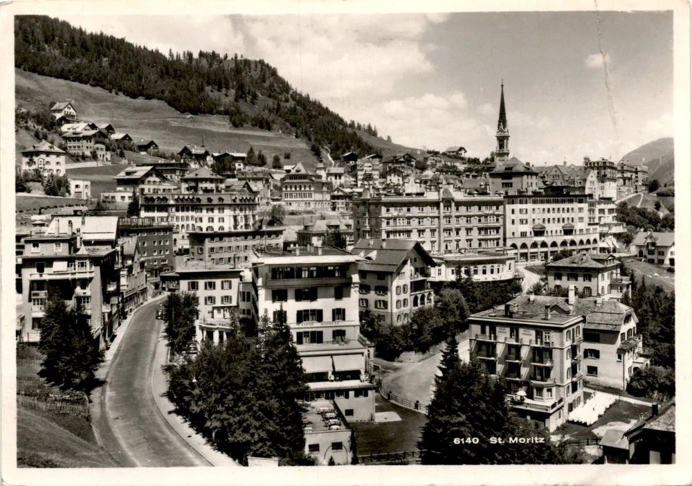 MAKE AN OFFER. THE MORE YOU BUY THE BETTER DEAL I WILL ACCEPT The postcard is from St. Moritz, a famous resort town in Switzerland. The sender mentions enjoying their time at the resort and not going on tours as planned, possibly due to the mountains not being to the liking of the girls in the group.