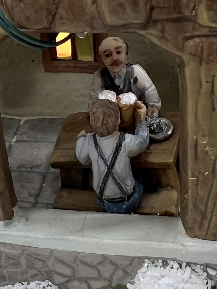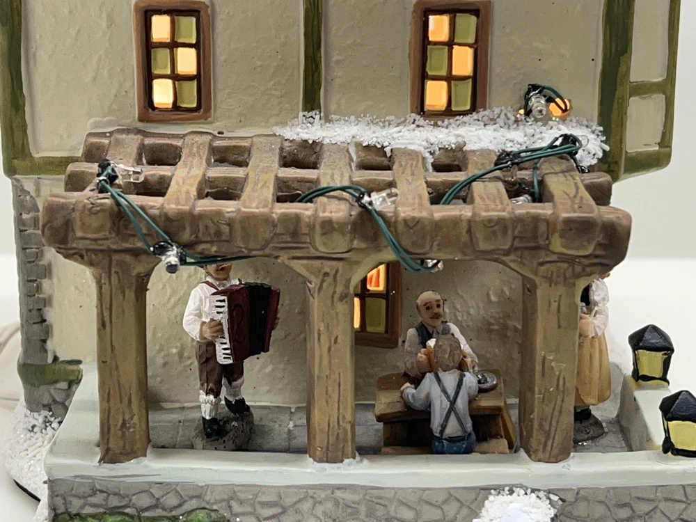 This St. Nicholas Square "Biergarten" Limited Edition Village Collection item from 2018 is a medium-sized ceramic beer garden house, hand-painted in a whimsical Mediterranean style. It features illuminated 3D effects and comes boxed. Ideal for a seasonal village display, this retired piece is perfect for Christmas and any room decor. It includes an adapter and is part of the St. Nicholas Square Village Collection, adding a festive touch to your holiday decorations. Absolutely incredible perfect pristine condition! Comes with all original perfect packaging, box like brand new , comes with A/C adapter and bulb . Lights over outdoor patio blink on & off . Beautiful item to add to your village!