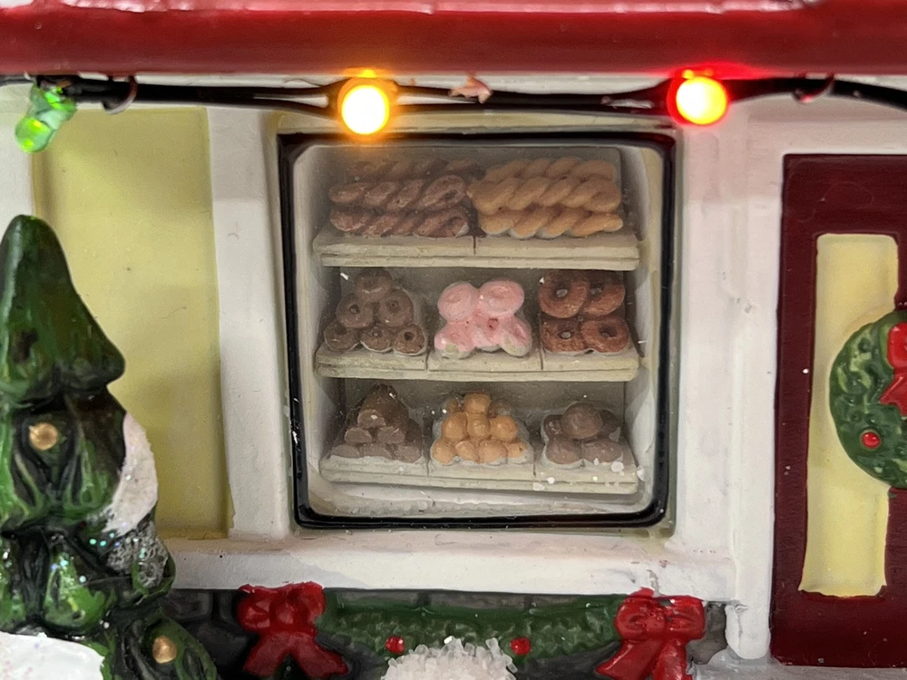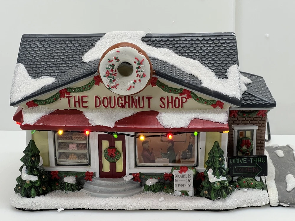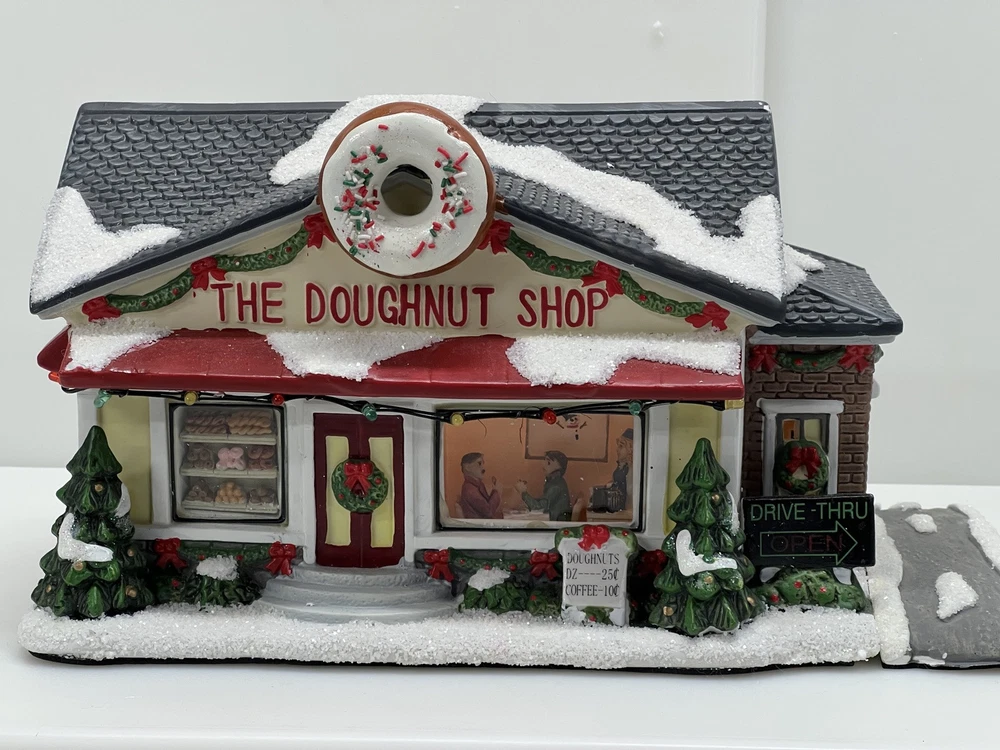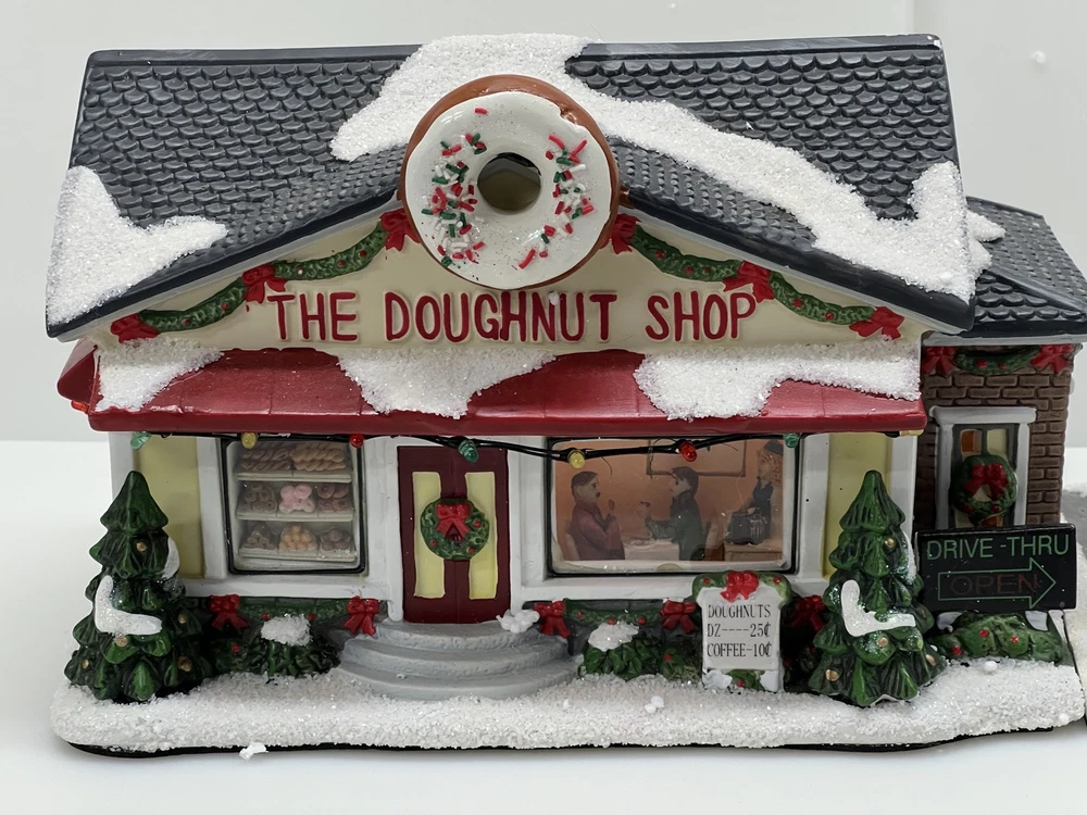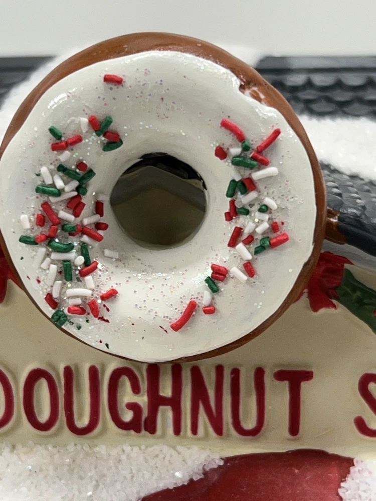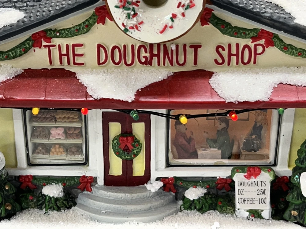 This St. Nicholas Square "The Donut Shop" Christmas village piece from 2011 is a large, asymmetrical, illuminated decoration featuring a whimsical donut shop design. It is suitable for a seasonal village display and includes LED lights with an A/C adapter. The hand-painted, American-style piece has a 3D effect and glitter accents. It is part of the St. Nicholas Square Village Collection and is designed for adults to enjoy in any room. Incredible detail and color ! Perfect pristine condition with all original packaging including light & cord and A/C Adapter