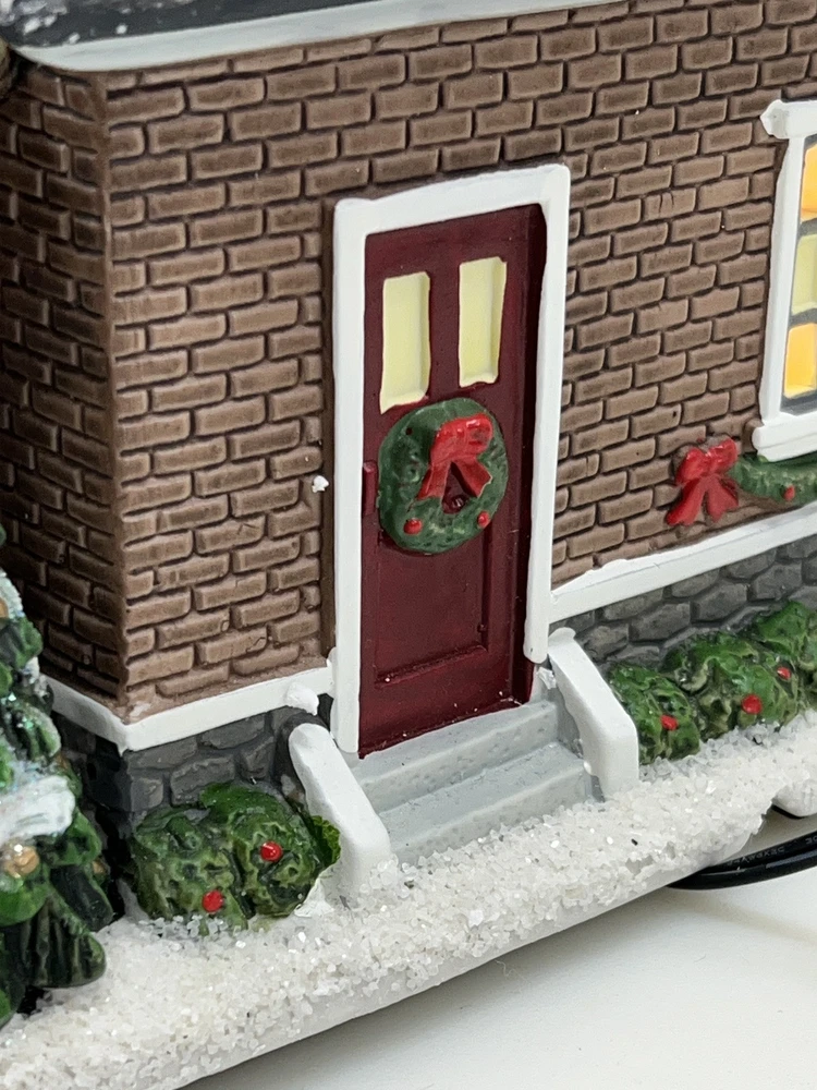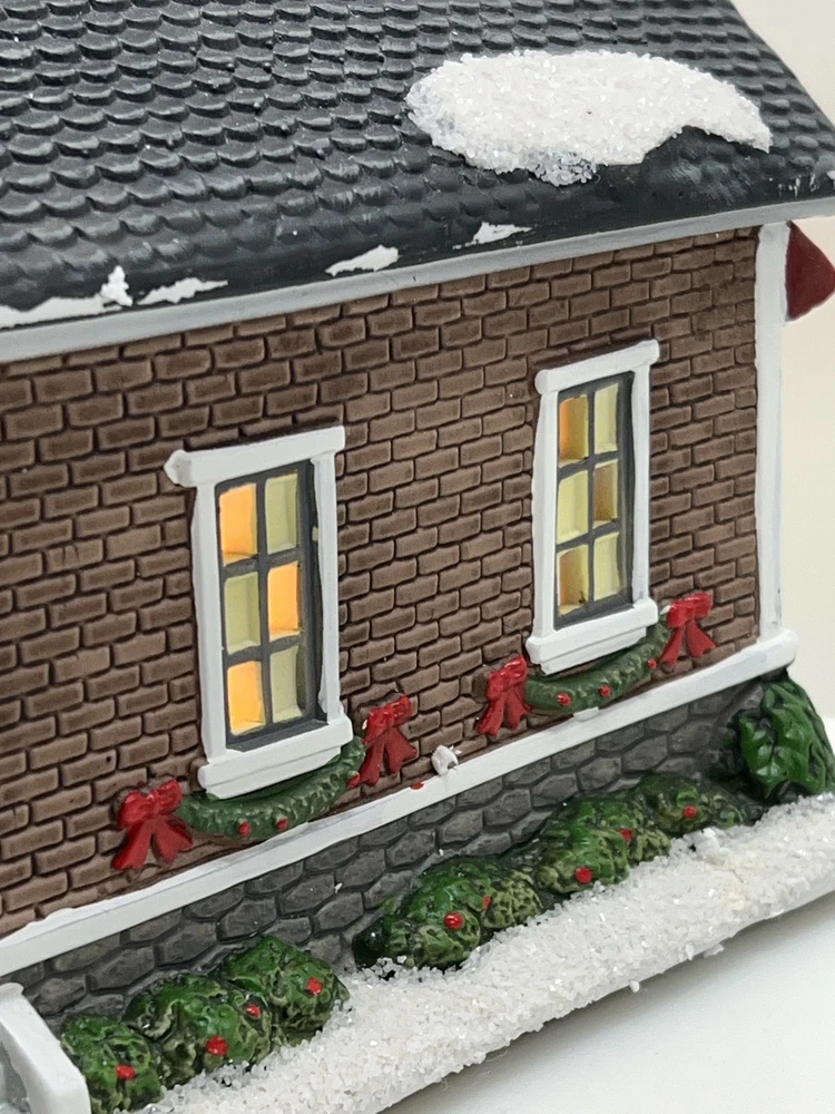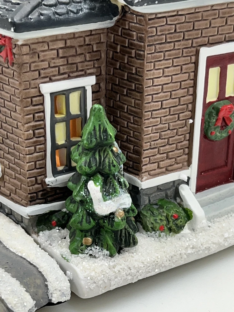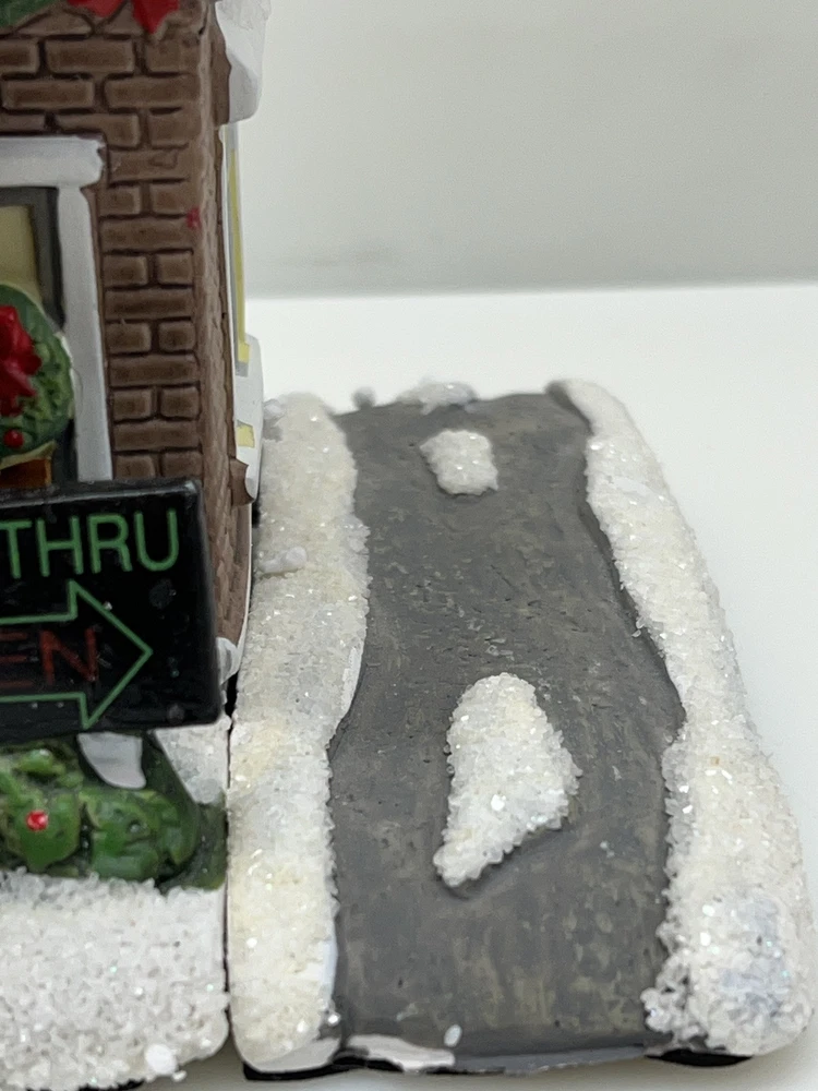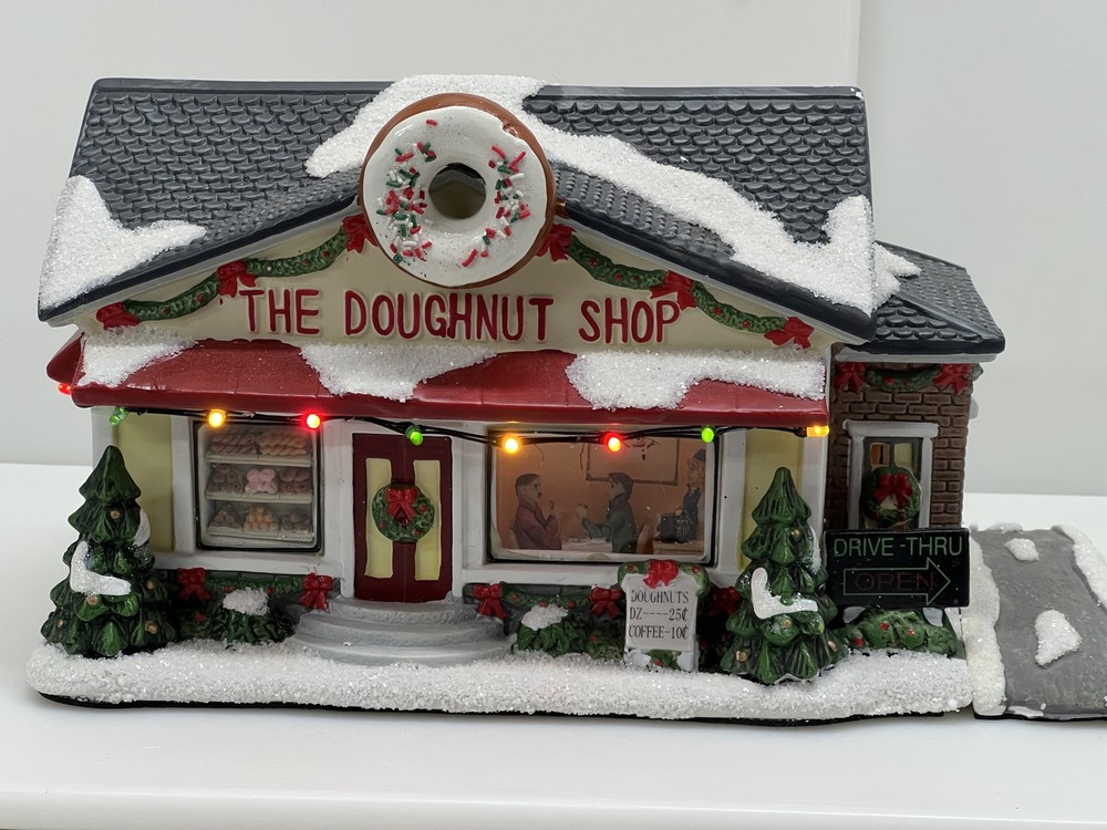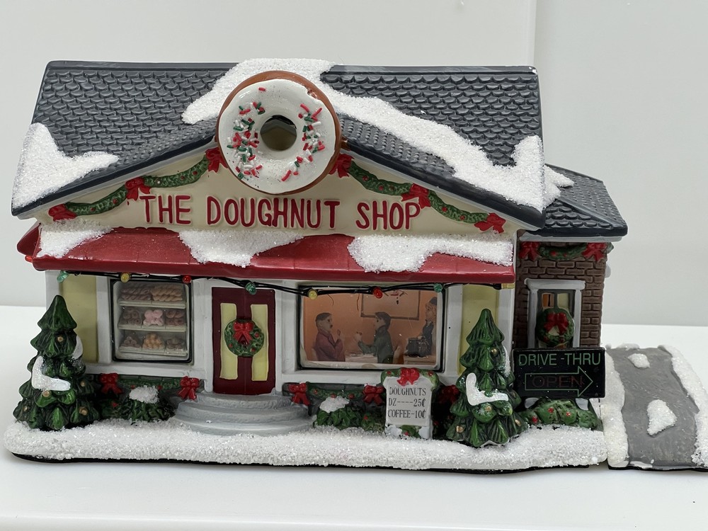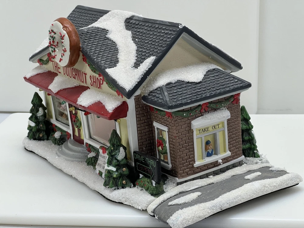 This St. Nicholas Square "The Donut Shop" Christmas village piece from 2011 is a large, asymmetrical, illuminated decoration featuring a whimsical donut shop design. It is suitable for a seasonal village display and includes LED lights with an A/C adapter. The hand-painted, American-style piece has a 3D effect and glitter accents. It is part of the St. Nicholas Square Village Collection and is designed for adults to enjoy in any room. Incredible detail and color ! Perfect pristine condition with all original packaging including light & cord and A/C Adapter
