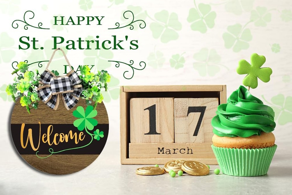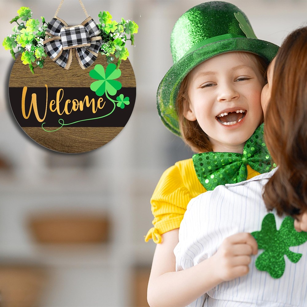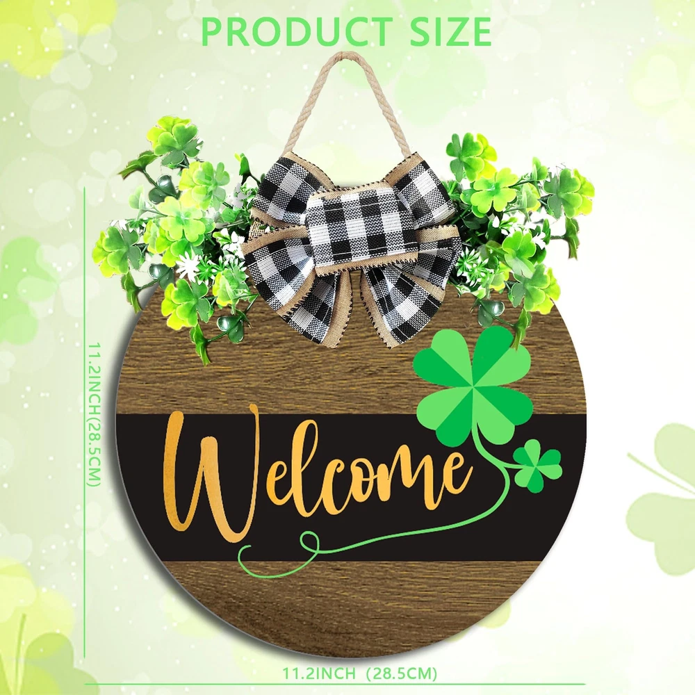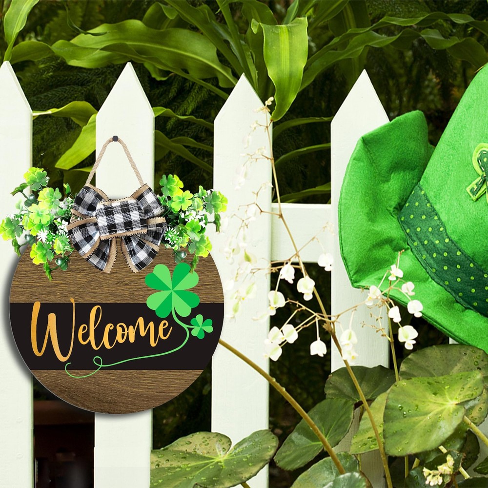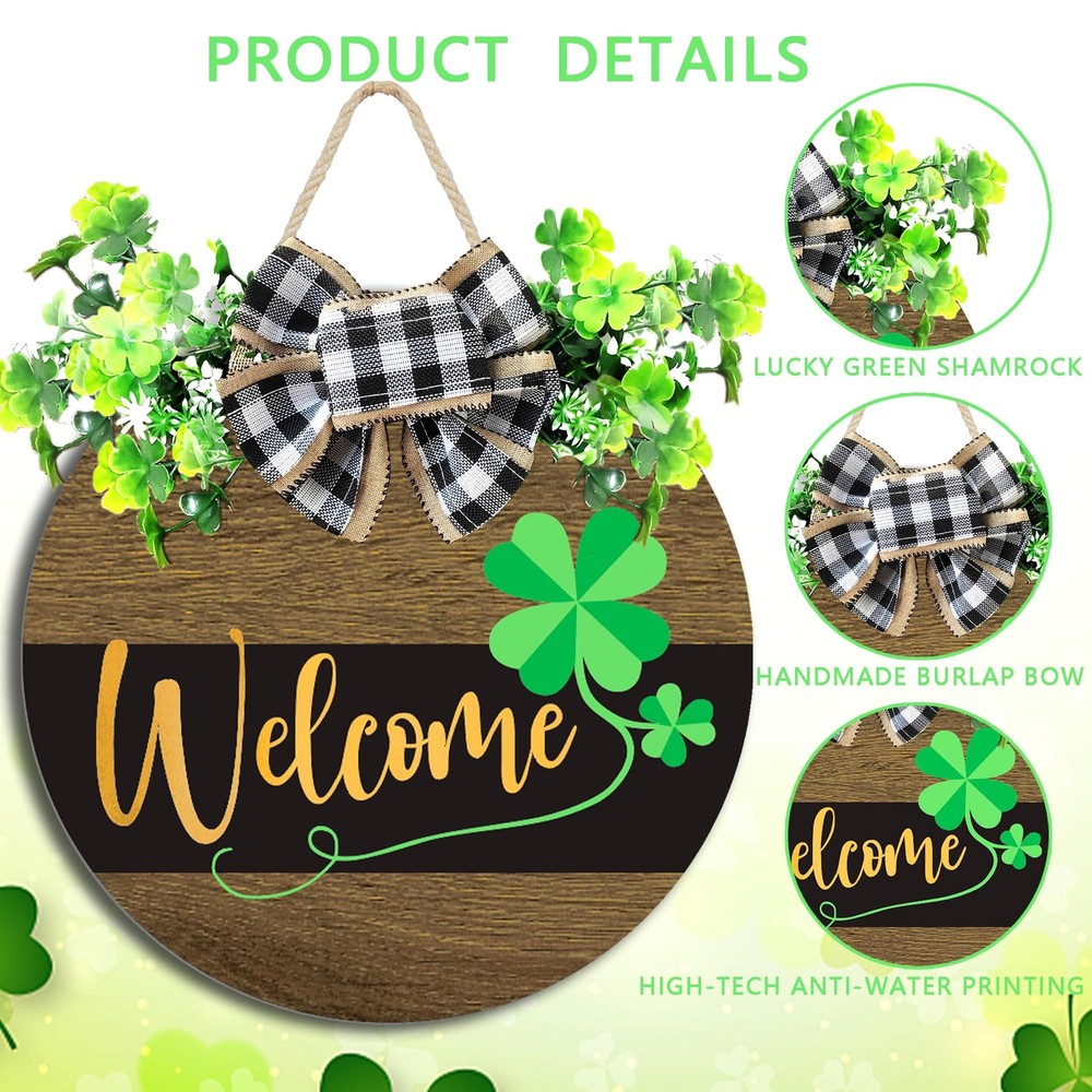 wreath 【St Patrick Welcome Sign】Decorated with lucky shamrock and buffalo plaid bows, this St Patrick welcome hanging sign is perfect for St Patrick decoration. 【Nicely Made Shamrock Wreath】Believe this shamrock wreath will bring you good luck. The greenly clover shamrock with blooming flowers, bring us breath of spring. Lucky shamrock goes around gold welcome sign, it’s a necessary front door wreath to welcome the friends or family. 【Ready to Hang】The strong string is already attached, you can hang it easily without any more handwork. Made by natural wood, this shamrock wreath is ultra lightweight, will not damage any holder. 【A Lot Occasions】Not only a St Patrick welcome sign for front door, but also St Patrick wreath for yard, window, office or home. Besides, it’s a great Irish party accessory or shamrock themed party decor that nobody should miss! 【Gift Idea】Let’s share this Irish lucky sign to our family or friends, believe they will get lots of good luck and healthiness at the year.