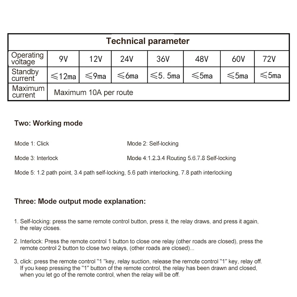 Product Description Stable 8 Channel Wireless RF433MHz Remote Control Switch Relay Module DC8-86V Features: 1. Compact Product, With Working Indicator Light 2. Simple Operation, Wiring Without Disassembling The Shell Direct Wiring 3. Wide Voltage Power Supply, Safe And Reliable, Stable Performance, Low Power Consumption 4. Loss Of Remote Control, Can Clear The Information Stored In The Acceptance Of The Controller 5. Wide Range Of Use: Applied To Electric Doors, Windows, Lifting Equipment, Gates, Elevators And Other Fields Specifications: Working Voltage: DC8-86V Operating Temperature: -10℃-+55℃ Coding Mode: Learning Type Controller Size: 120mm* 90mm* 35mm Remote Control Battery: 2* AAA Battery(Not Included) Operating Frequency: 433mhz Maximum Current: 10A Remote Control Distance: 100m-200m Working Mode: Mode 1: Tap Mode 2: Self-Locking Mode 3: Interlock Mode 4: 1. 2. 3. 4-Way Tap 5. 6. 7. 8 Self-Locking Mode 5: 1. 2-Way Tap, 3. 4-Way Self-Locking, 5. 6-Way Interlocking, 7.8-Way Interlocking Mode 6: Tap + Total Open Mode 7: Self-Locking + ALL ON ALL OFF Explanation Of Mode Output: Self-Locking: Press The Same Remote Control Button, Press It Once, The Relay Will Absorb, Press It Again, The Relay Will Turn Off. Interlocking: Press The Remote Control 1 Key, One - Way Relay Will Be Engaged (The Other Way Will Be Closed), Press The Remote Control 2 Key, Two - Way Relay Will Be Engaged (The Other Way Will Be Closed). Tap: Press The Remote Control "1" Key, The Relay Will Absorb, Release The Remote Control "1" Key, The Relay Will Turn Off. If You Keep Pressing The Remote Control "1" Key, The Relay Is Always Active, When To Let Go Of The Remote Control, When The Relay Is Off. +: Connect To The Positive Terminal Of The Power Supply -: Connect To The Negative Pole Of Power Supply Nc: Normally Closed Terminal Com: Common Terminal No: Normally Open Terminal Learning Code: 1. Mode 1 (Pointing) Learning Method: Press The Control Panel Code Button Once, Wait For The Led Indicator To Light Up And Then Press Any Key Of The Remote Control That Needs To Be Coded, And The Led Indicator Of The Control Panel Will Blink 3 Times In A Row For The Code To Be Successfully Coded. 2. Mode 2 (Self-Locking) Learning Method: Continuously Press The Control Board 2 Times To The Code Button, Wait For The Led Indicator Is Lit, Press Any Key Of The Remote Control That Needs To Be Coded, The Control Board Led Indicator Blinks 3 Times In A Row To The Code Successfully. 3. Mode 3 (Interlock) Learning Method: Continuously Press The Control Board 3 Times To The Code Button, Wait For The Led Indicator Is Lit, Press Any Key Of The Remote Control That Needs To Be Coded, The Control Board Led Indicator Blinks 3 Times In A Row To The Code Successfully. 4. Mode 4 (Point + Self-Locking) Learning Method: Continuously Press The Control Board 4 Times The Code Button, Wait For The Led Indicator Light Up And Then Press Any Key Of The Remote Control Need To Code, The Control Board Led Indicator Flashes 3 Times To Code Successfully. 5. Mode 5 (Tap + Self-Locking + Interlocking) Learning Method: Continuously Press The Control Board 5 Times The Code Button, Wait For The Led Indicator Light Up And Then Press Any Key Of The Remote Control That Needs To Be Coded, The Control Board Led Indicator Flashes 3 Times In A Row To The Code Successfully. 6. Mode 6 (Tap+Total) Learning Method: Press The Control Panel Code Button 11 Times In A Row, Wait For The Led Indicator To Light Up And Then Press Any Key Of The Remote Control That Needs To Be Coded, The Led Indicator Of The Control Panel Will Flash 3 Times In A Row And The Code Will Be Successfully Coded. 7. Mode 7 (Self-Locking + ALL ON ALL OFF) Learning Method: Continuously Press The Control Board 12 Times To Code Button, And So On The Led Indicator Light, Light, Press Any Key Of The Remote Control That Needs To Code, The Control Board Led Indicator Blinks 3 Times In A Row To Code Successfully. Clear Data Press The Learning Button On The Control Board For 11 Consecutive Times, It Will Automatically Clear All The Remote Controls That Have Learned The Code. After Clearing, The Original Remote Control Will No Longer Be Controlled. Packege Included: 1* Relay Module 1* Remote Control If you have any questions, please feel free to contact us via ebay. We usually respond within 24 hours. Payment Shipping Returns Contact Us We accept all verified payments from ebay. Orders will be shipped after receiving cleared payment. Payment due within 7 days after auction ends and for buy it now listings. We ship most of our orders within 24 hours, and may up to 48 hours for. If you want faster shipping way. Please contact us before making payment. Sometimes due to problems with our transportation company system, your shipping information may be delayed to update. We recommend that you try again after 3-4 days. If you still haven't checked the shipping information, you can contact us by ebay message. Always believe we can figure things out with communication, if it comes to return, the pacakge must be intact and the same as you receive. If you have any questions, please feel free to email our service specialists 24 Hours a Day, 7 Days a Week. We will reply you ASAP. Return/refund is accepted within 30 days after the buyer receives the item. NO exchange will be accepted after 30 days from the date when the item is received. Please contact us first before returning your product!!! If you have any questions, our Customer Service staffs welcome you to email us. We strive to answer all questions and resolve any problems as quickly as possible. You can contact us 7*24, we will reply at the first time, and we will surely solve your problems. Note: 1.We try our best to reply to your emails as soon as possible, however, due to high volume of daily incoming emails and time zone difference, we may not be able to reply your emails immediately. Please allow 1 business days for us to response. If you do not receive any reply from us