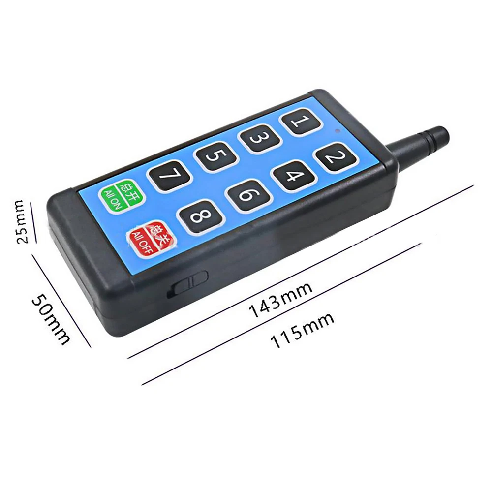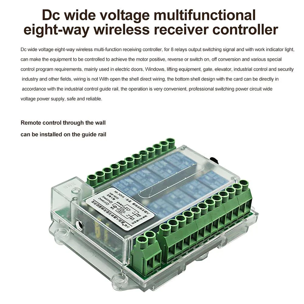 Product Description Features: 1. Compact Product, With Working Indicator Light 2. Simple Operation, Wiring Without Disassembling The Shell Direct Wiring 3. Wide Voltage Power Supply, Safe And Reliable, Stable Performance, Low Power Consumption 4. Loss Of Remote Control, Can Clear The Information Stored In The Acceptance Of The Controller 5. Wide Range Of Use: Applied To Electric Doors, Windows, Lifting Equipment, Gates, Elevators And Other Fields Specifications: Working Voltage: DC8-86V Operating Temperature: -10℃-+55℃ Coding Mode: Learning Type Controller Size: 120mm* 90mm* 35mm Remote Control Battery: 2* AAA Battery(Not Included) Operating Frequency: 433mhz Maximum Current: 10A Remote Control Distance: 100m-200m Working Mode: Mode 1: Tap Mode 2: Self-Locking Mode 3: Interlock Mode 4: 1. 2. 3. 4-Way Tap 5. 6. 7. 8 Self-Locking Mode 5: 1. 2-Way Tap, 3. 4-Way Self-Locking, 5. 6-Way Interlocking, 7.8-Way Interlocking Mode 6: Tap + Total Open Mode 7: Self-Locking + ALL ON ALL OFF Explanation Of Mode Output: Self-Locking: Press The Same Remote Control Button, Press It Once, The Relay Will Absorb, Press It Again, The Relay Will Turn Off. Interlocking: Press The Remote Control 1 Key, One - Way Relay Will Be Engaged (The Other Way Will Be Closed), Press The Remote Control 2 Key, Two - Way Relay Will Be Engaged (The Other Way Will Be Closed). Tap: Press The Remote Control "1" Key, The Relay Will Absorb, Release The Remote Control "1" Key, The Relay Will Turn Off. If You Keep Pressing The Remote Control "1" Key, The Relay Is Always Active, When To Let Go Of The Remote Control, When The Relay Is Off. +: Connect To The Positive Terminal Of The Power Supply -: Connect To The Negative Pole Of Power Supply Nc: Normally Closed Terminal Com: Common Terminal No: Normally Open Terminal Learning Code: 1. Mode 1 (Pointing) Learning Method: Press The Control Panel Code Button Once, Wait For The Led Indicator To Light Up And Then Press Any Key Of The Remote Control That Needs To Be Coded, And The Led Indicator Of The Control Panel Will Blink 3 Times In A Row For The Code To Be Successfully Coded. 2. Mode 2 (Self-Locking) Learning Method: Continuously Press The Control Board 2 Times To The Code Button, Wait For The Led Indicator Is Lit, Press Any Key Of The Remote Control That Needs To Be Coded, The Control Board Led Indicator Blinks 3 Times In A Row To The Code Successfully. 3. Mode 3 (Interlock) Learning Method: Continuously Press The Control Board 3 Times To The Code Button, Wait For The Led Indicator Is Lit, Press Any Key Of The Remote Control That Needs To Be Coded, The Control Board Led Indicator Blinks 3 Times In A Row To The Code Successfully. 4. Mode 4 (Point + Self-Locking) Learning Method: Continuously Press The Control Board 4 Times The Code Button, Wait For The Led Indicator Light Up And Then Press Any Key Of The Remote Control Need To Code, The Control Board Led Indicator Flashes 3 Times To Code Successfully. 5. Mode 5 (Tap + Self-Locking + Interlocking) Learning Method: Continuously Press The Control Board 5 Times The Code Button, Wait For The Led Indicator Light Up And Then Press Any Key Of The Remote Control That Needs To Be Coded, The Control Board Led Indicator Flashes 3 Times In A Row To The Code Successfully. 6. Mode 6 (Tap+Total) Learning Method: Press The Control Panel Code Button 11 Times In A Row, Wait For The Led Indicator To Light Up And Then Press Any Key Of The Remote Control That Needs To Be Coded, The Led Indicator Of The Control Panel Will Flash 3 Times In A Row And The Code Will Be Successfully Coded. 7. Mode 7 (Self-Locking + ALL ON ALL OFF) Learning Method: Continuously Press The Control Board 12 Times To Code Button, And So On The Led Indicator Light, Light, Press Any Key Of The Remote Control That Needs To Code, The Control Board Led Indicator Blinks 3 Times In A Row To Code Successfully. Clear Data Press The Learning Button On The Control Board For 11 Consecutive Times, It Will Automatically Clear All The Remote Controls That Have Learned The Code. After Clearing, The Original Remote Control Will No Longer Be Controlled. Packege Included: 1* Relay Module 1* Remote Control Payment Shipping Returns Contact Us We accept all verified payments from ebay. Orders will be shipped after receiving cleared payment. Payment due within 7 days after auction ends and for buy it now listings. We ship most of our orders within 24 hours, and may up to 48 hours for. If you want faster shipping way. Please contact us before making payment. Sometimes due to problems with our transportation company system, your shipping information may be delayed to update. We recommend that you try again after 3-4 days. If you still haven't checked the shipping information, you can contact us by ebay message. Always believe we can figure things out with communication, if it comes to return, the pacakge must be intact and the same as you receive. If you have any questions, please feel free to email our service specialists 24 Hours a Day, 7 Days a Week. We will reply you ASAP. Return/refund is accepted within 30 days after the buyer receives the item. NO exchange will be accepted after 30 days from the date when the item is received. Please contact us first before returning your product!!! If you have any questions, our Customer Service staffs welcome you to email us. We strive to answer all questions and resolve any problems as quickly as possible. You can contact us 7*24, we will reply at the first time, and we will surely solve your problems. Note: 1.We try our best to reply to your emails as soon as possible, however, due to high volume of daily incoming emails and time zone difference, we may not be able to reply your emails immediately. Please allow 1 business days for us to response. If you do not receive any reply from us, please check your email ensuring your mailbox has not reached full size. 2.Due to some ISP SPAM filter settings, you may not be able to receive our replies; if you have problems re