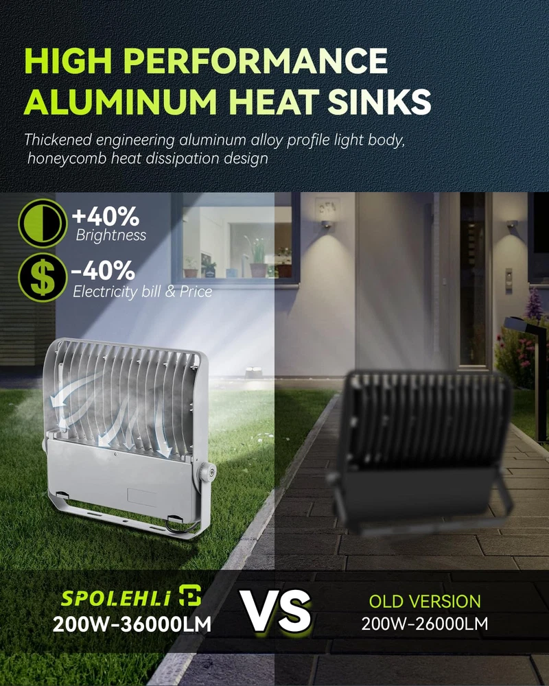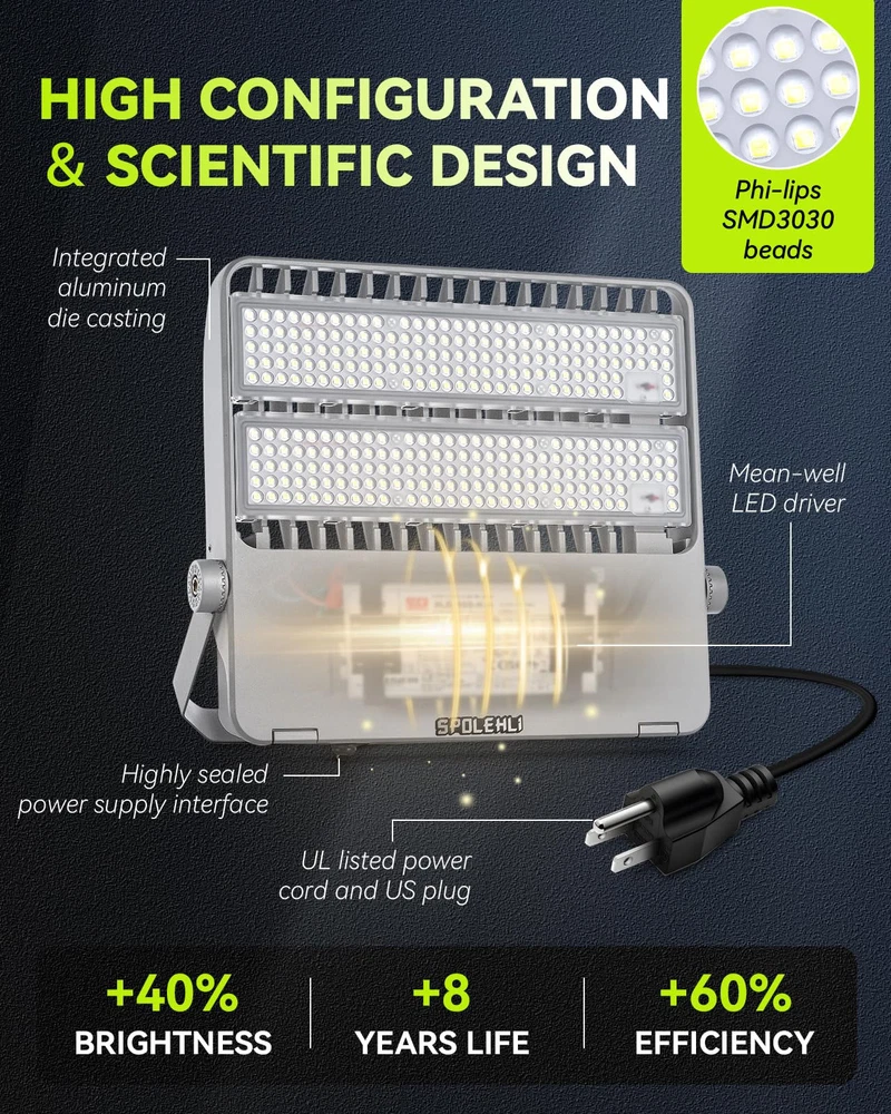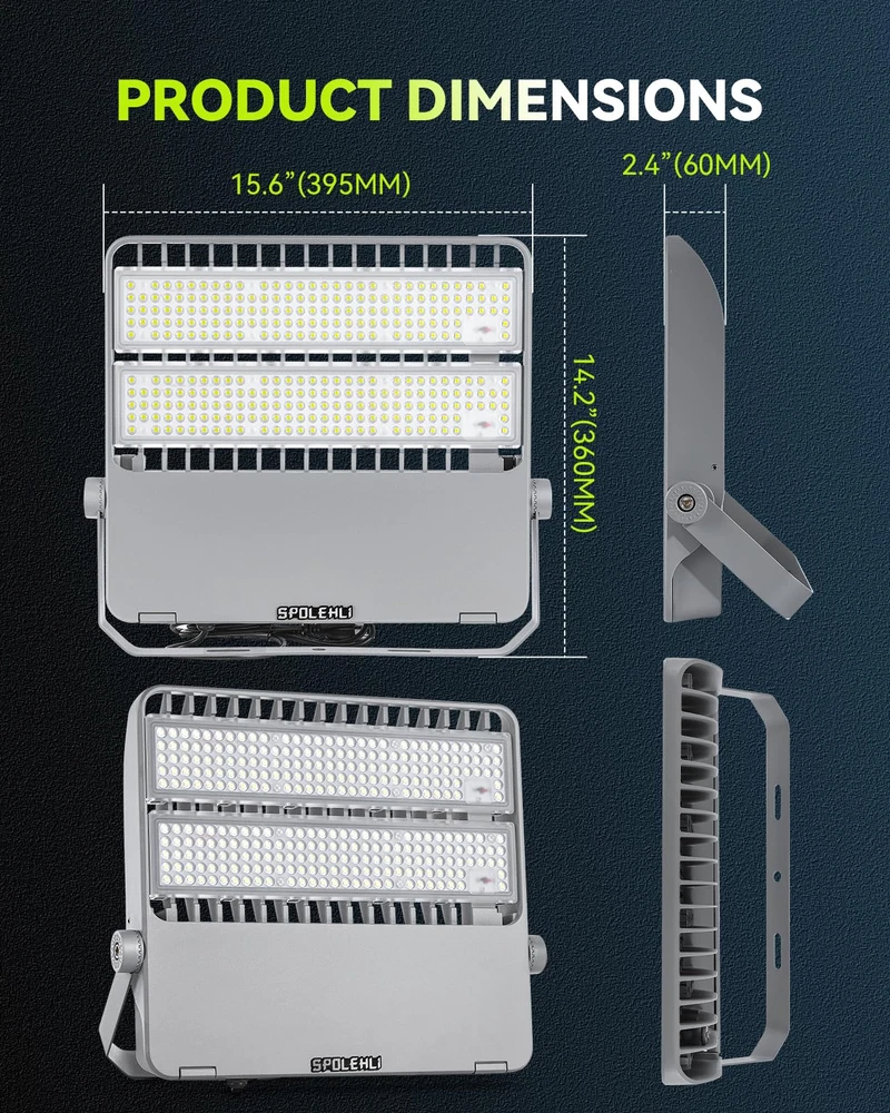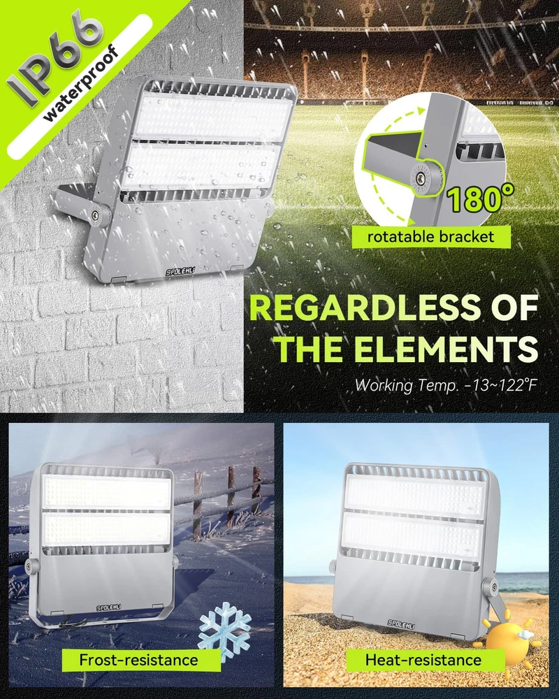 HIGH CONFIGURATION & LOW USE: This stadium light is equipped with Phi-lips 3030 high light beads with brightness up to 180LM/W and Mean-well LED driver, plus UL listed power cord and US plug, which significantly improves the service life and lighting efficacy, with guaranteed quality. Brightness 36000LM with low power consumption of only 2.0 Amp, saving 90% of your electricity bill. SCIENTIFIC DESIGN & GREAT VALUE: This flood light is integrated aluminum alloy die-casting molding, using high-quality engineering-type materials and parts, it is backed by a thickened finned radiator design, which means it acts like a heat sink to dissipate heat, ensuring good heat dissipation and long-lasting performance with a lifespan of over 50,000 hours, save on maintenance. EXTRA LARGER LIGHTING RANGE: With 294pcs high brightness Phi-lips 3030 led chip, 120° beam angle, Anti-UV optical polycarbonate lens with light transmittance over 95%, this daylight white flood light will literally light up the world around you, it can highlight the beauty of your outdoor space, your garden or the architectural features of your home. Color temperature 5500K, like midday daylight. Recommended installation height 26.2~39.4Ft (8~12m). READY FOR ALL WEATHER: Our LED Stadium Light are specifically designed to illuminate sports fields and other outdoor locations, they are IP66 waterproof, heat and frost resistant, and can work properly in temperatures ranging from -13 to 122°F(-25 to 50℃). They are brighter than typical outdoor flood lights and provide a more focused beam of light that can be pointed exactly where it is needed. CONVENIENT INSTALLATION: This floodlight comes with a 180° adjustable angle bracket that can be installed in many mounting positions at almost any angle, it can be ceiling mounted, wall mounted and floor mounted. Easy and convenient installation means you don't need to be a professional electrician to install our outdoor floodlights, you can do it yourself with a few basic tools that included in the package, which saves you time and cost.