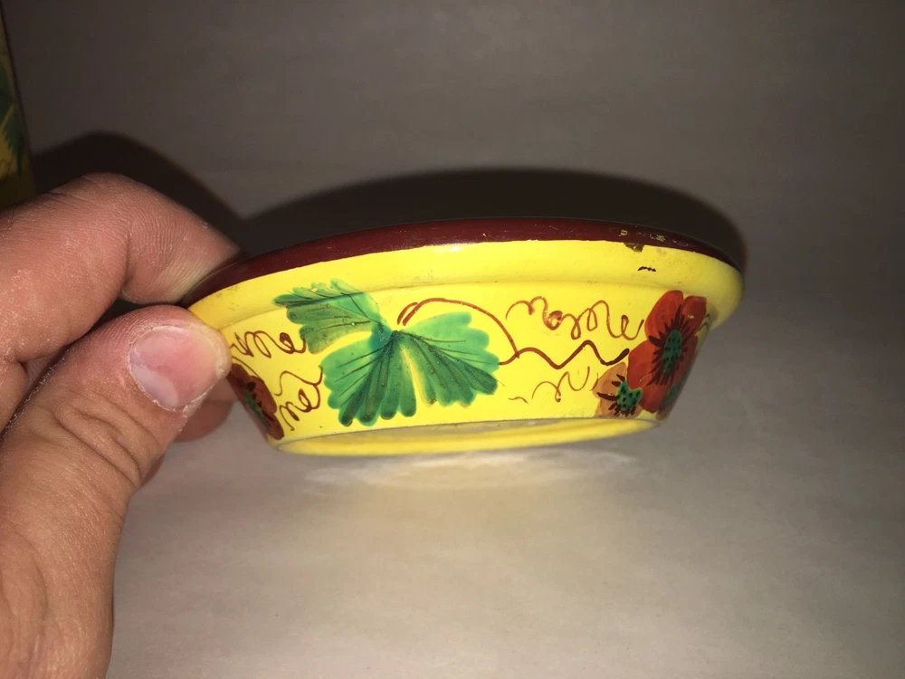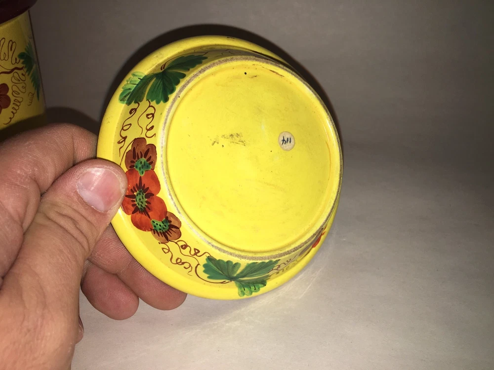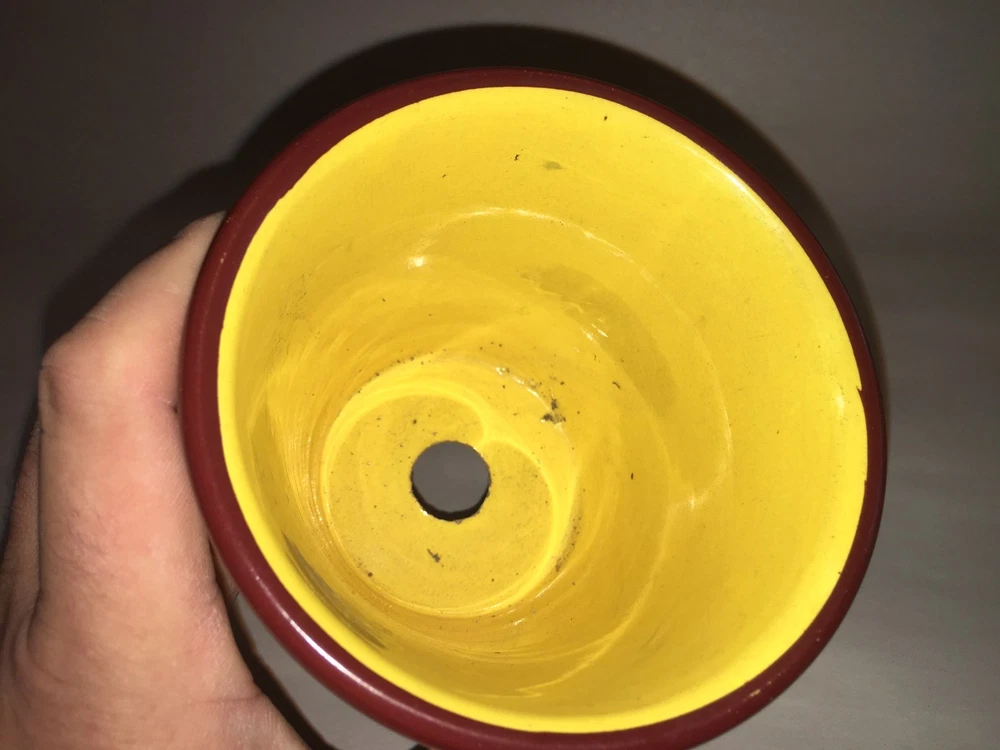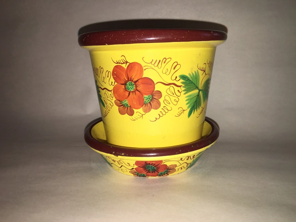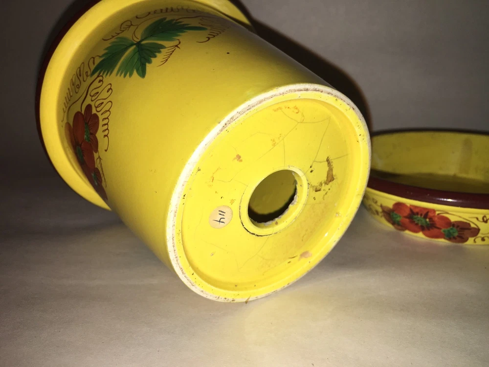 Up for auction we have this Staffordshire Canary flower pot with enamel floral decorations. Really in quite nice condition with no chips,cracks or repairs. There is some minor staining on the tray and some grazing on the base of the pot that doesn't go through. Really nothing in my opinion. This is as clean as I have seen one of these in quite sometime. The tray measures 4 1/2" in diameter and the pot stands 4" tall. This set dates circa 1820. Please view my pictures for further condition and feel free to ask me any questions. Satisfaction guaranteed.