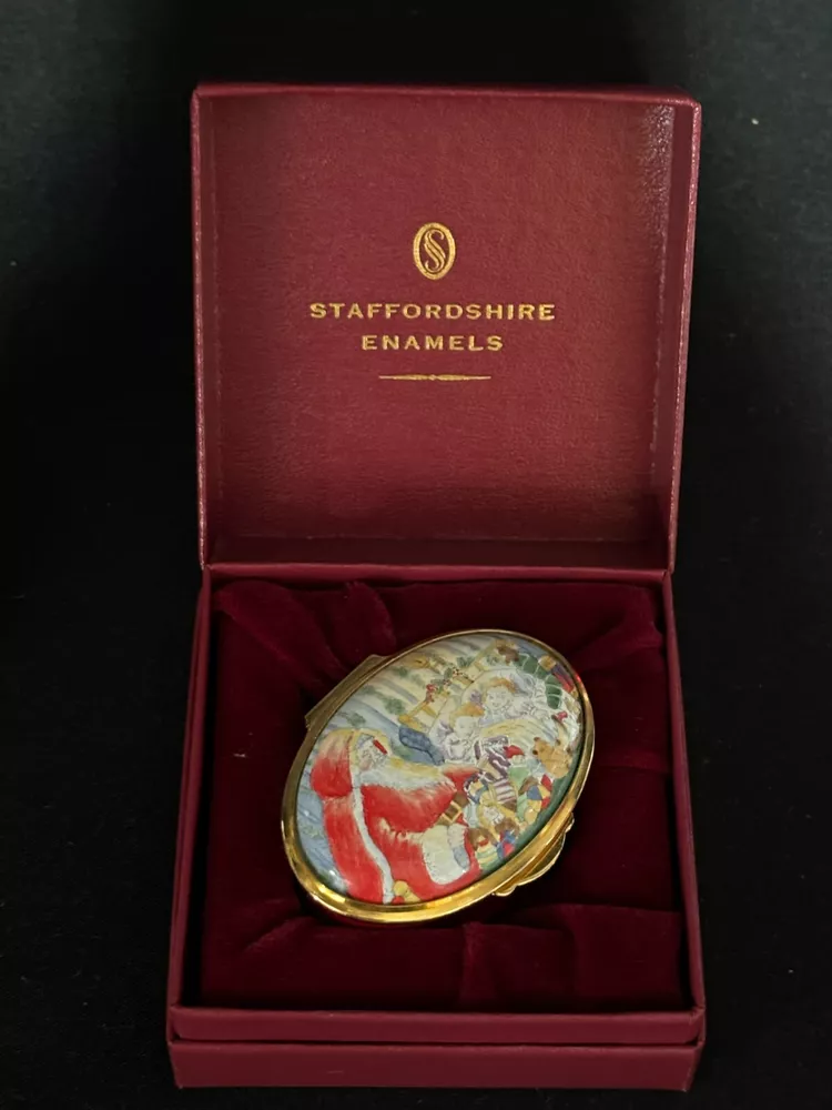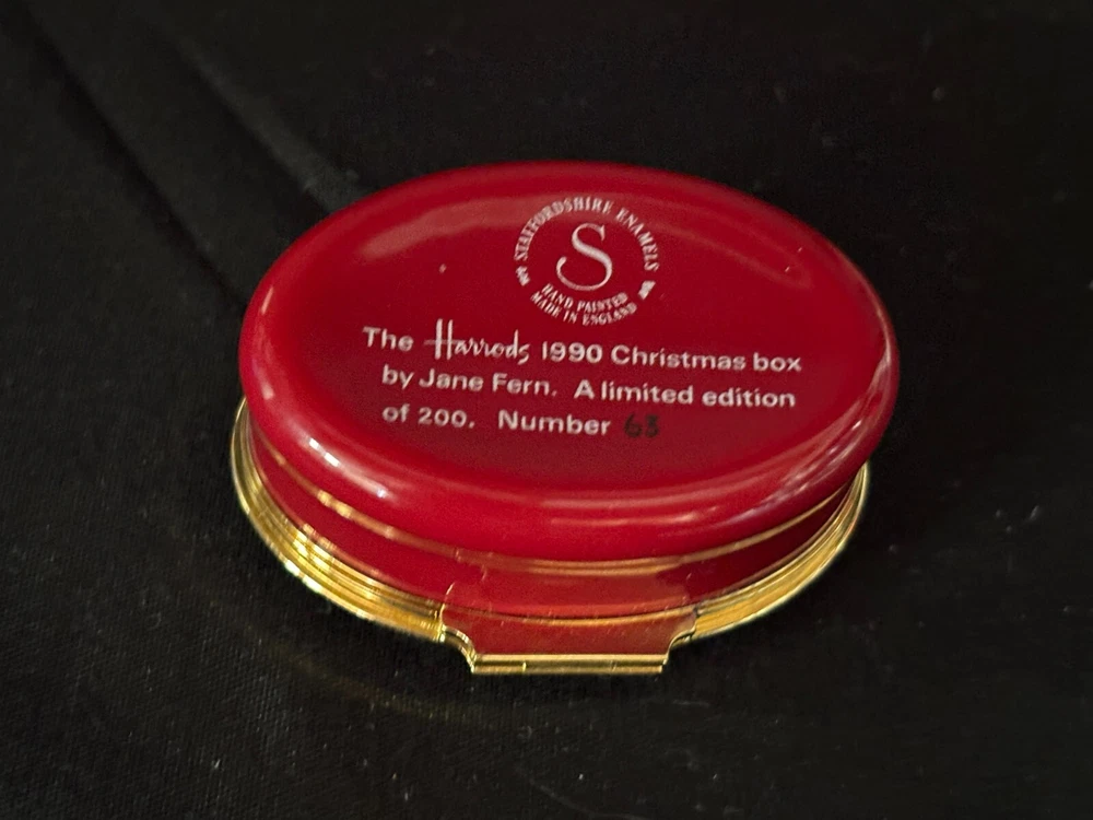 Staffordshire Enamel Trinket Box "1990 CHRISTMAS BOX ~ HARRODS" ~ LE 63/200 L & M Landing Store Terms We make every attempt to show our listings as they truly are. If the pictures or descriptions are not clear, please contact me. Positive Feedback is very important to us. We strive to always have repeat customers that have a great experience shopping at our store. If for any reason you are not completely satisfied with your purchase, please contact me and we can resolve the issue together. Buy Now – Payment is due immediately ***PLEASE BE SURE YOUR SHIPPING ADDRESS IS UPDATED*** Auctions – Payment due within 3 Days We do offer combined shipping for multiple purchases. All overpaid shipping costs will be refunded at the time of shipping. We are a member of the Global Shipping Program in order to accommodate customers in other countries. SHIPPING TIME: Your item will be shipped the next business day after cleared payment has been received. You will receive shipping notification through eBay shipping or through PayPal shipping when your item is mailed. PLEASE be sure your shipping address is correct. Most of the items listed come from estate sales, auctions, garage sales, consignments and/or private sales. As such, I normally don't know the history of the item nor how it was stored.