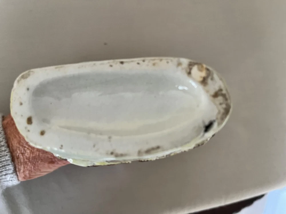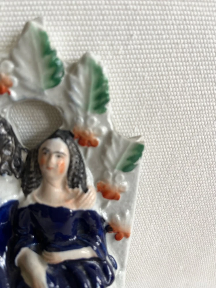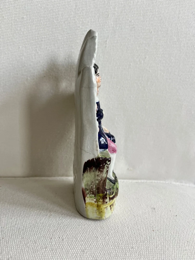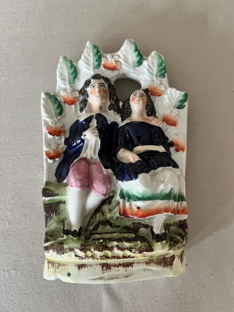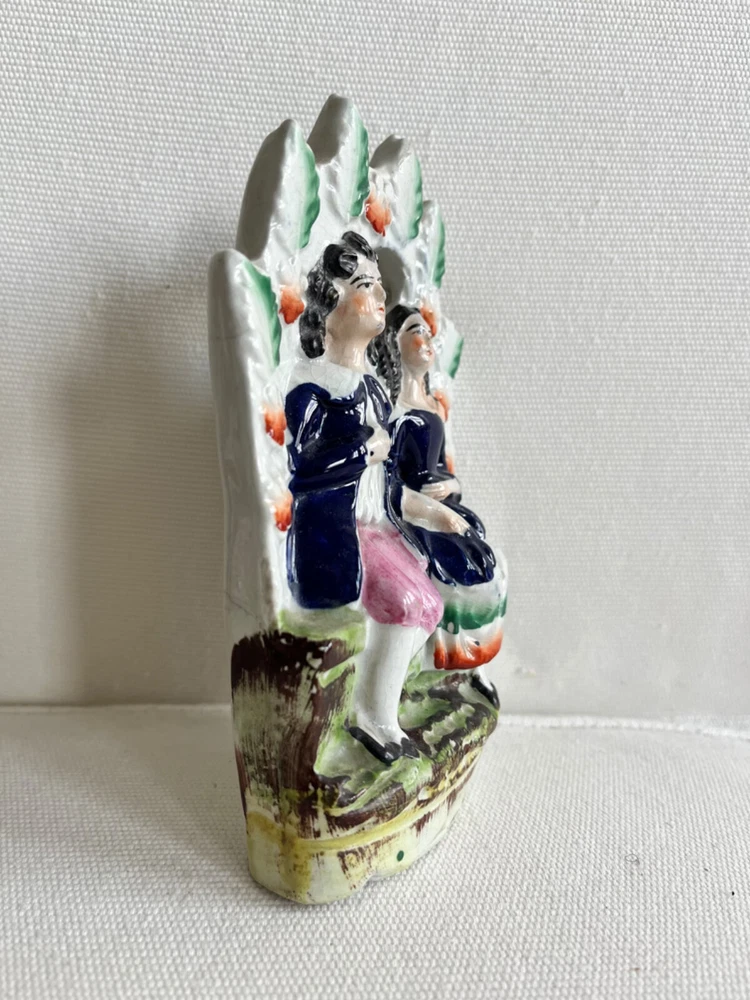 Staffordshire figures of man and woman on bench, 6" x 4", notice missing right leaf tip