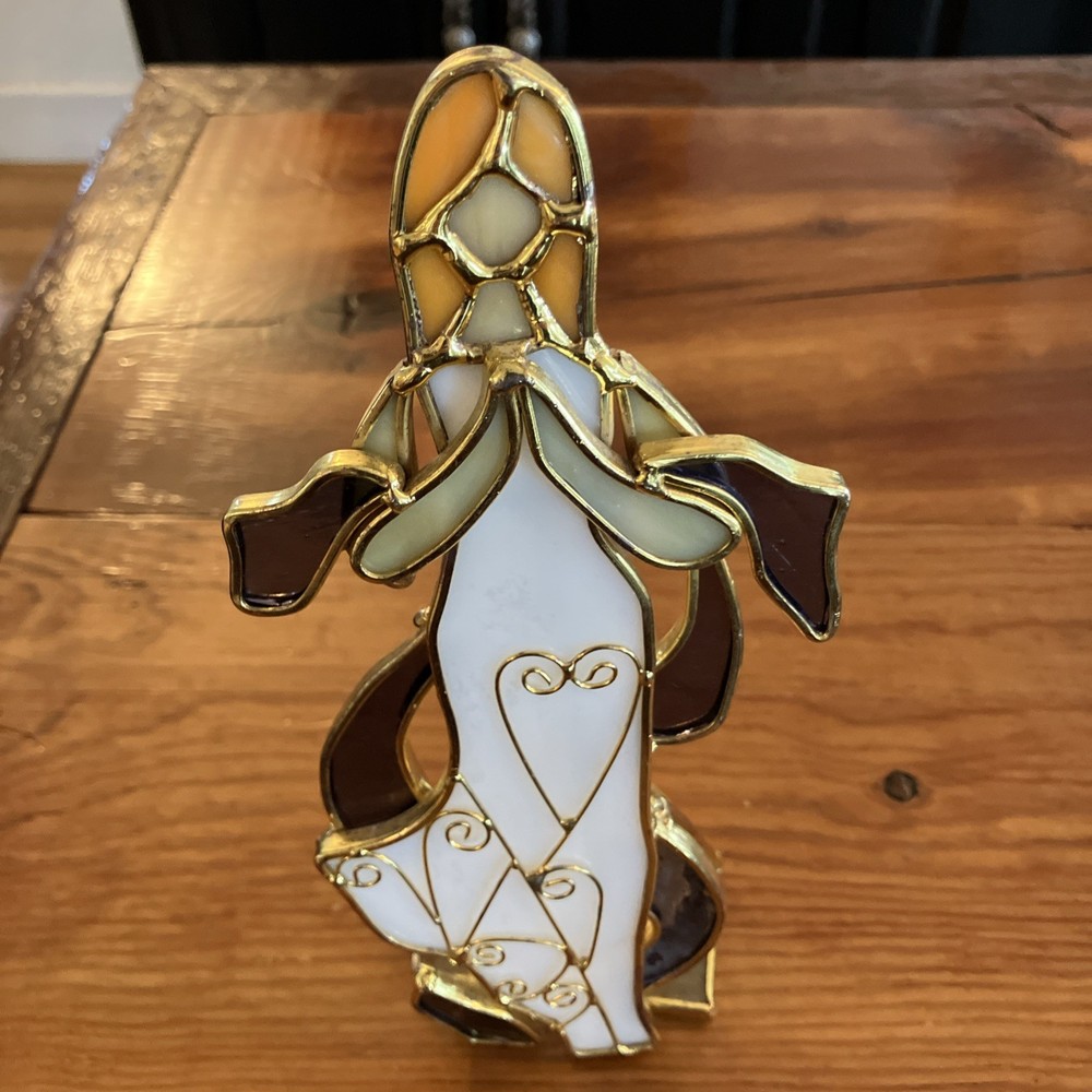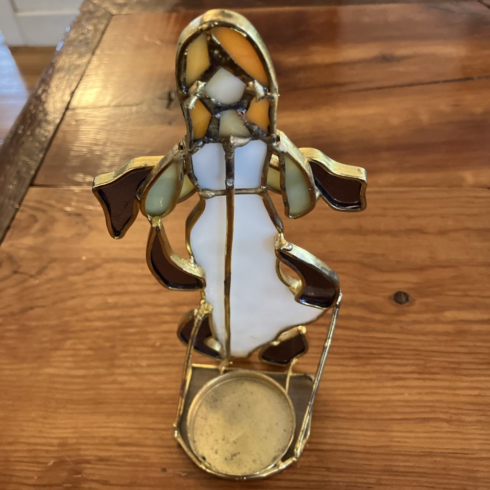 Add a touch of serenity to your home decor with this exquisite Stained Glass Angel Tealight Candle Holder. Standing at 5.5 inches tall, this beautiful piece features a white and red sash design that exudes a warm and inviting ambiance. The angelic shape and glass and metal materials make it an ideal choice for anyone who wants to add a celestial touch to their living space. This free-standing votive holder is perfect for tabletop use and suitable for holding a tealight candle. Its stunning design and high-quality materials make it a great gift for loved ones or a charming addition to your own home. With its elegant theme and exquisite craftsmanship, this Stained Glass Angel Tealight Candle Holder is sure to be a conversation starter.