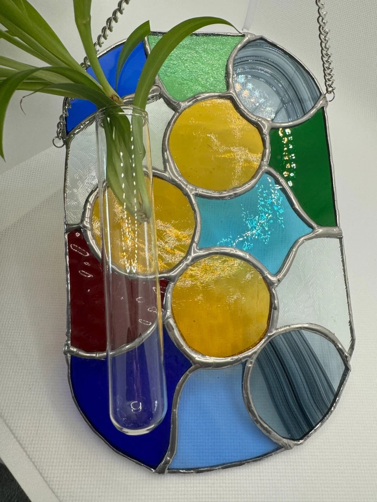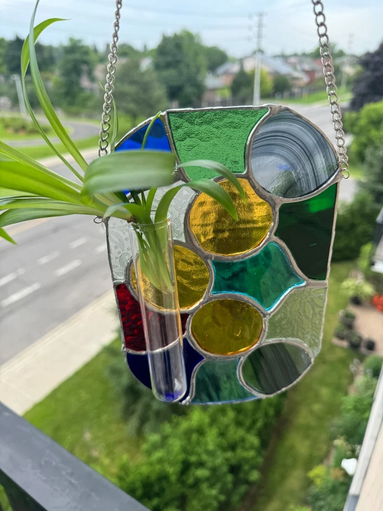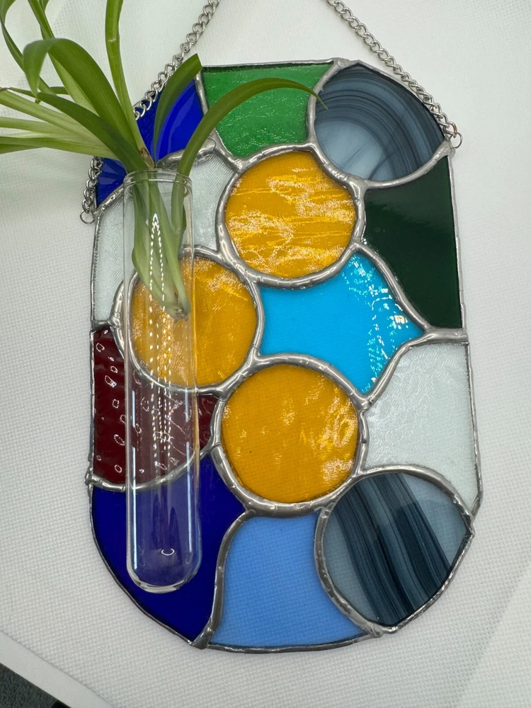 Enhance your living space with this stunning Stained Glass Tiffany Abstract Handmade Panel. Handcrafted in Canada, this large suncatcher features a vibrant multicolour design with intricate cuttings that create a beautiful abstract pattern. Made from high-quality stained glass, this suncatcher has a shiny finish that adds a touch of elegance to any room. Perfect for adding a pop of color and style to your home decor, this unique piece is sure to be a conversation starter.Ideal for those who appreciate handmade craftsmanship and unique home accessories, this suncatcher is a true work of art. Bring a touch of creativity and sophistication into your home with this one-of-a-kind stained glass piece, showcasing a blend of traditional Tiffany style with a modern twist. Perfect for hanging in a sunny window or as a decorative accent on any wall, this suncatcher will brighten up your space and infuse it with charm and personality. Measurements are approximate: W 5.5" x H 8.5". 14 cm x 22 cm. Chain. 15" 38 cm