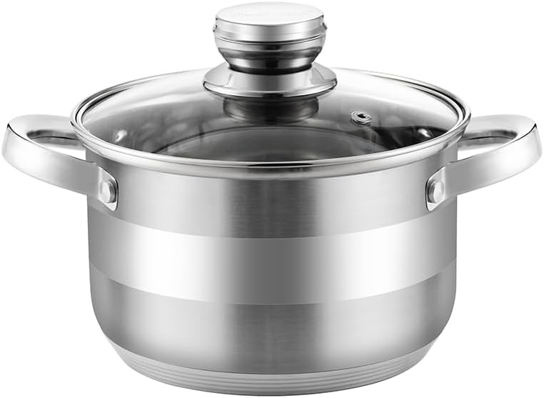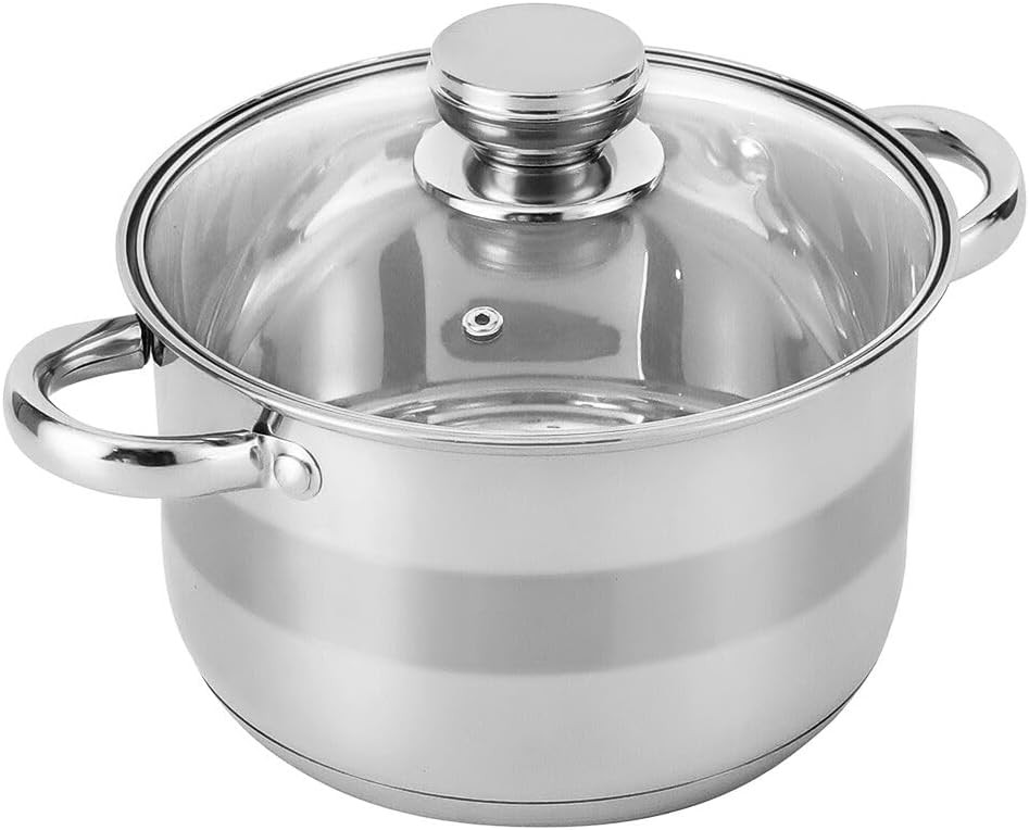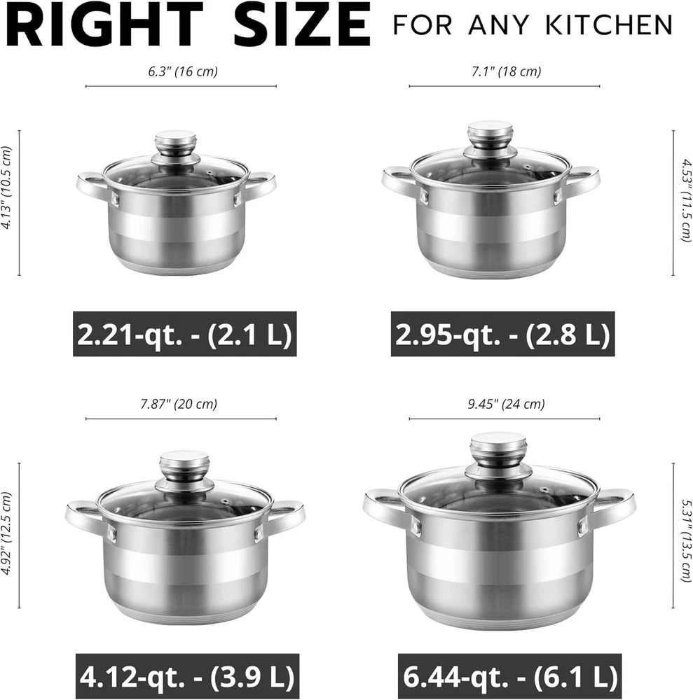 Stainless Steel Cooking Pot with Glass Lid Set of 4, Stock Small, Silver Product Details Material: Stainless Steel Finish Type: Brushed Brand: OrganicClub Color: Silver Capacity: 6.86 Quarts Product Dimensions: 6.3"D x 6.3"W x 4.13"H Coating Description: Ceramic Is Oven Safe: No Manufacturer: OrganicClub Size: Small Item Weight: 10.5 pounds Item model number: 469070 Materia: Made from stainless steel Versatile Sizes: Set includes four pots in different sizes to meet various cooking needs: 2.21 QT, 2.95 Qt, 4.12 Qt, 6.44 Qt. Glass Lids: Each stockpot comes with a transparent glass lid, allowing you to monitor your cooking without lifting the lid. Induction Safe: Compatible with all stovetops, including induction, gas, electric, and glass-ceramic. Dishwasher Safe: Easy to clean and maintain, these casseroles are dishwasher safe for added convenience. Design: The lightweight and shiny stainless steel surface gives the products a modern and beautiful look. Versatile Set: Perfect for a variety of cooking needs, from boiling and simmering to sautéing and stewing. Stainless steel is recognized among the most suitable surfaces for cooking and processing food. Upgrade your kitchen with our Stainless Steel Stockpot with Glass Lid Set of 4. Crafted from high-quality stainless steel, this cooking pot set offers exceptional durability and performance, making it a reliable addition to your kitchen. This versatile set is perfect for a wide range of cooking tasks, from boiling and simmering to sautéing and stewing. Whether you are preparing a hearty soup, a delicate sauce, or a flavorful stew, these stainless steel casseroles are designed to meet all your culinary cookware pot features a transparent glass lid, allowing you to easily monitor your cooking without having to lift the lid and release heat.Designed for ease of use, these stock pots are dishwasher safe, making cleanup quick and effortless. They are also induction safe, ensuring compatibility with all types of stovetops, including induction, gas, electric, and glass-ceramic.Durable and sturdy, the stainless steel cooking pots set is a must-have addition to any set includes four pots in different sizes to meet various cooking needs:– Small Pot: Diameter 6.3" (16 cm), Height 4.13" (10.5 cm), Capacity 2.21 qt. (2.1 L);– Medium Pot 1: Diameter 7.1" (18 cm), Height 4.53" (11.5 cm), Capacity 2.95 qt. (2.8 L);– Medium Pot 2: Diameter 7.87" (20 cm), Height 4.92" (12.5 cm), Capacity 4.12 qt. (3.9 L);– Large Pot: Diameter 9.45" (24 cm), Height 5.31" (13.5 cm), Capacity 6.44 qt. (6.1 L).