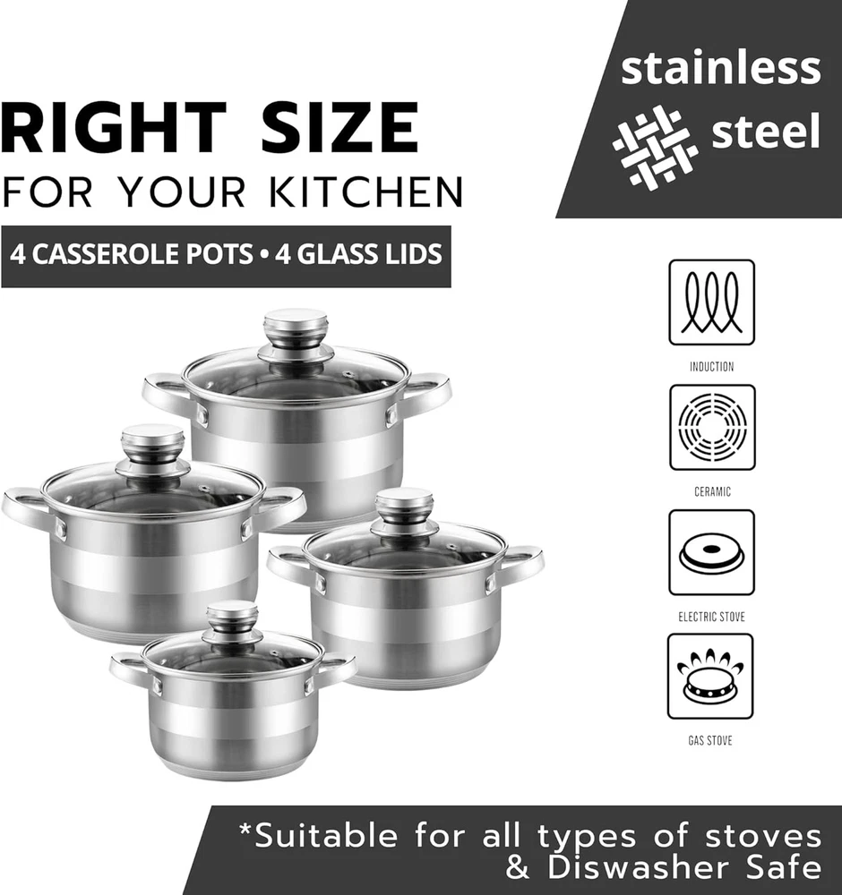 Stainless Steel 4-Piece Cooking Pot Set with Glass Lid Stock Small Silver