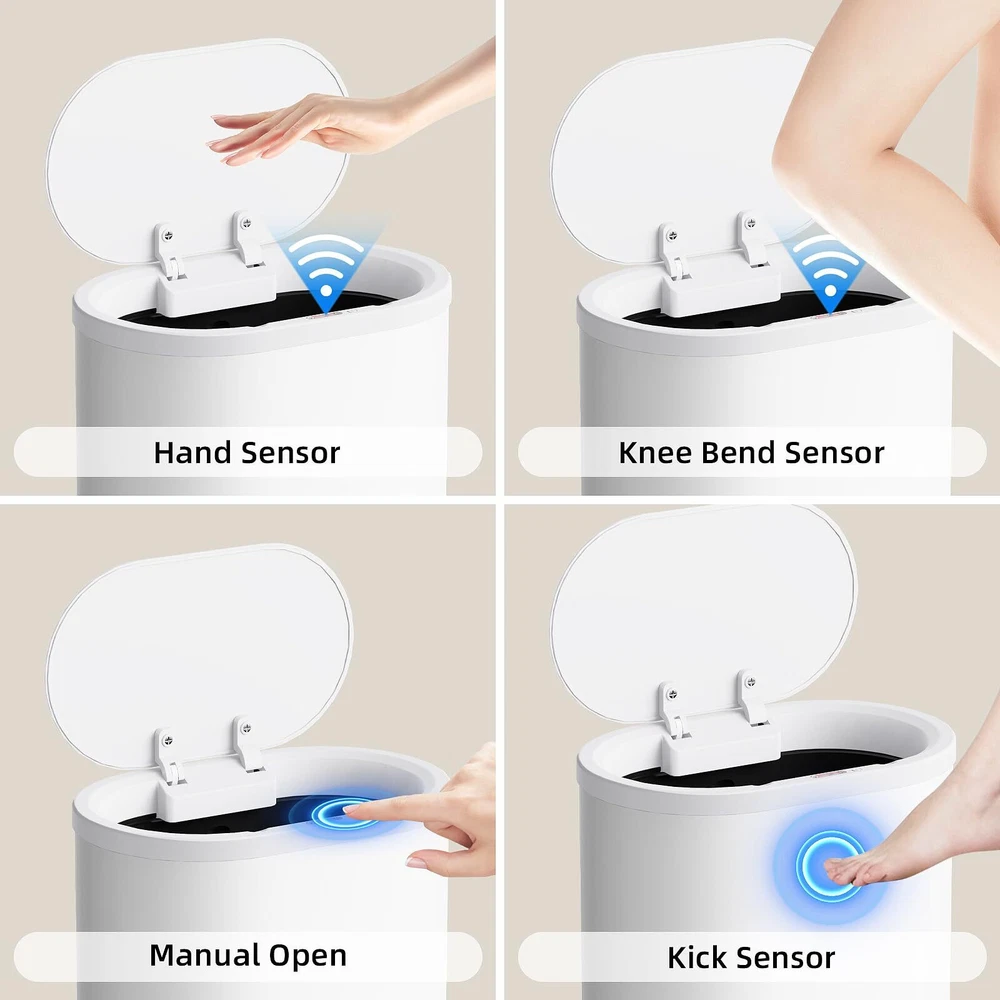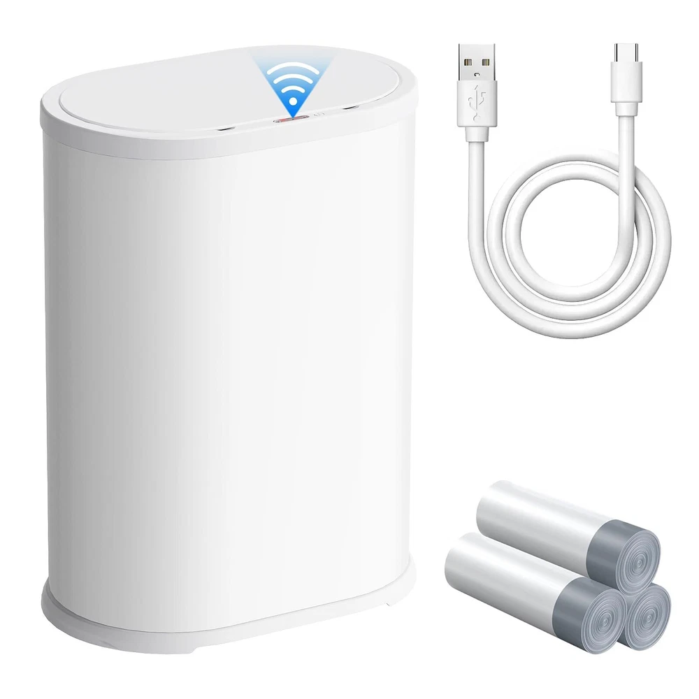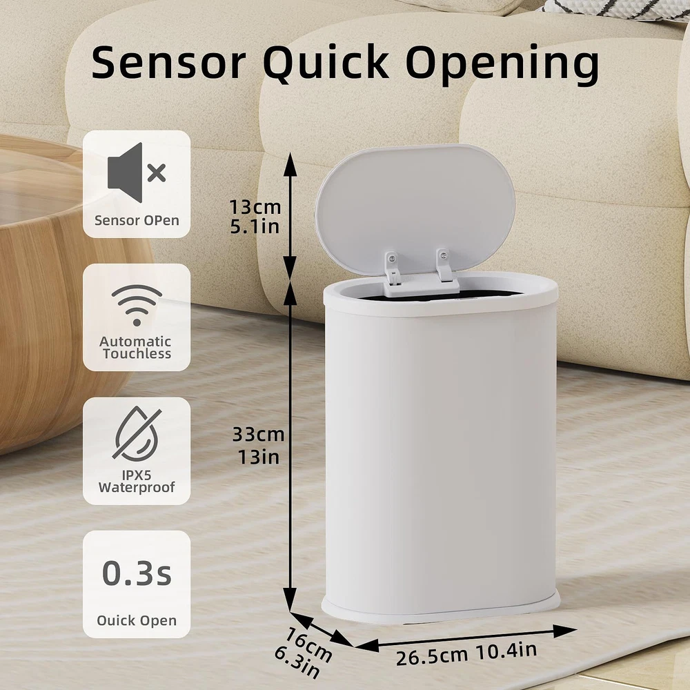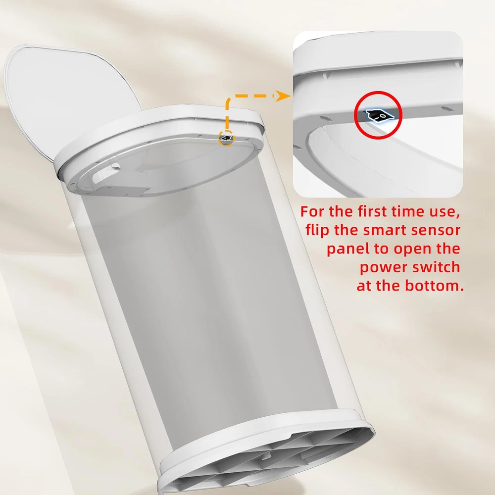 NOTICE BEFORE USING: This product comes with a built-in rechargeable lithium battery. When using it for the first time, you need to switch on the power switch at the bottom of the front cover, wait for 3-5 seconds, then you can wave your hand, bend your knees, kick the trash can, or use the manual button to open the lid. If you have any questions during the use, please feel free to contact us. SMART SENSOR TRASH CAN:Advanced automatic sensor technology applied in this smart trash can. The lid stays open if you keep your hands above the infrared motion sensor, which improves user experience greatly. Lid closes after 5 seconds automatically if none movement is detected by sensor. Product contains rechargeable battery, ready for use. WATERPROOF AND QUALITY ASSURANCE:Advanced IPX5 waterproof technology prevents water or humid environment from damaging the unit. High quality Stainless Steel material with a high strength for durable use. MANUAL MODE:In cases that You want the lid to stay open, you can manually press the up button; after use, manually press the down button to close the trash can. Save Space at Home:10.4''L×6.2'W×13''H. Slim shape perfectly fits narrow spaces, and 1.6 gallon vlome ensure adequaty storing capciaty. Control the Spread of Odors:This Smart trash can has very good airtightness and can seal the odor of garbage. It is the perfect companion for restrooms, bedrooms, offices, children's rooms, toilets, campers, RVs and other small spaces.