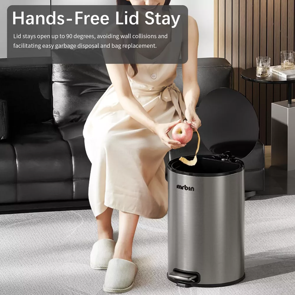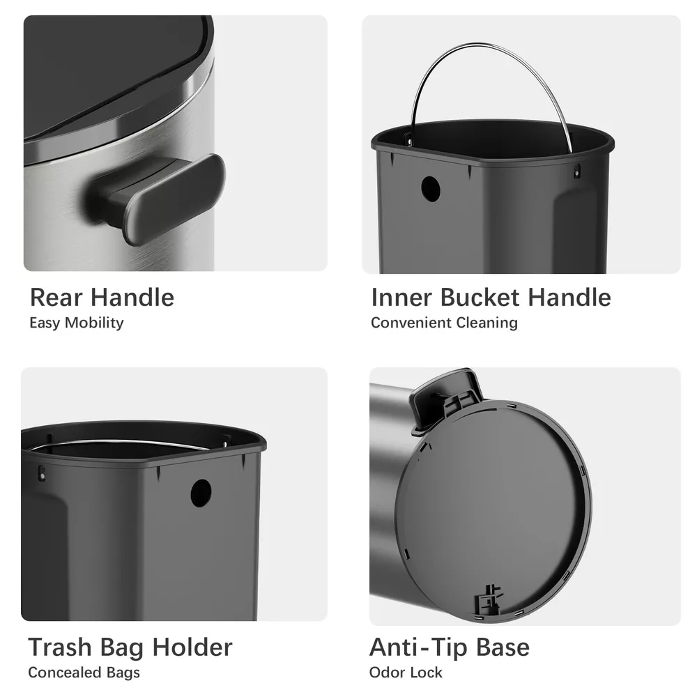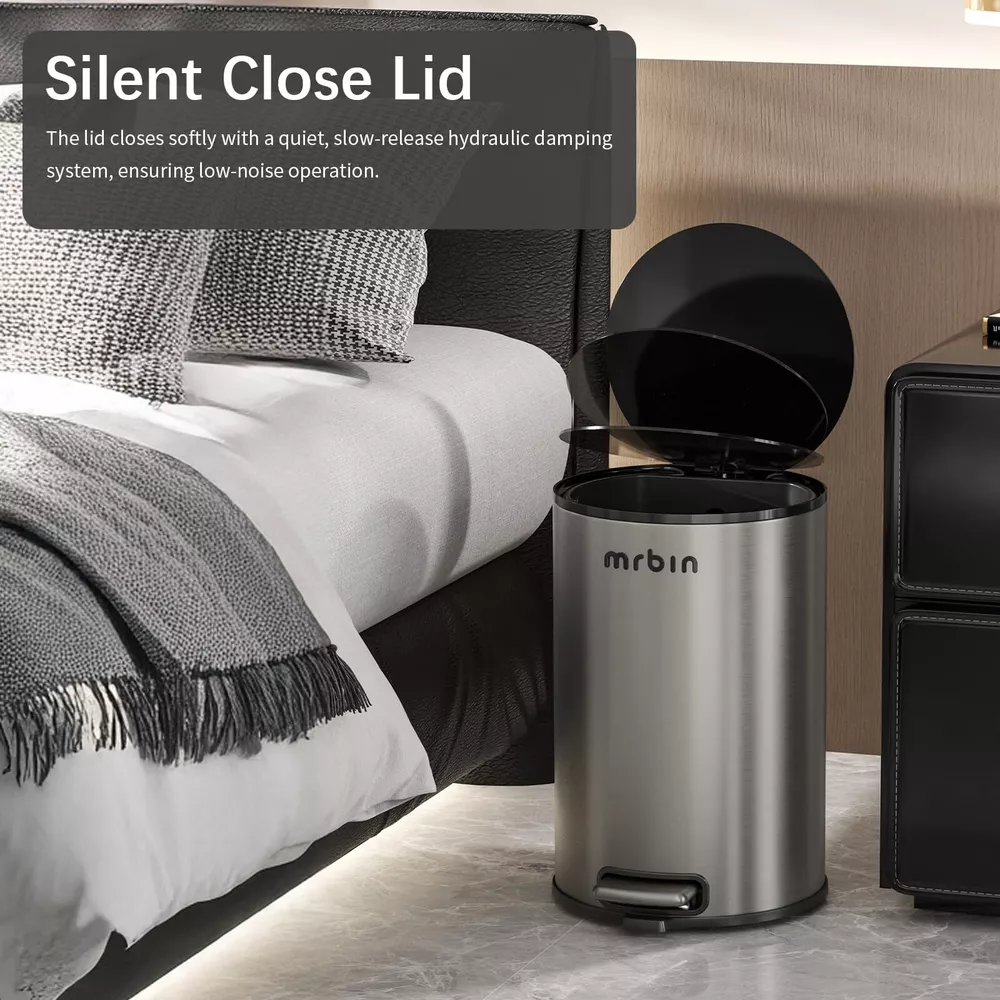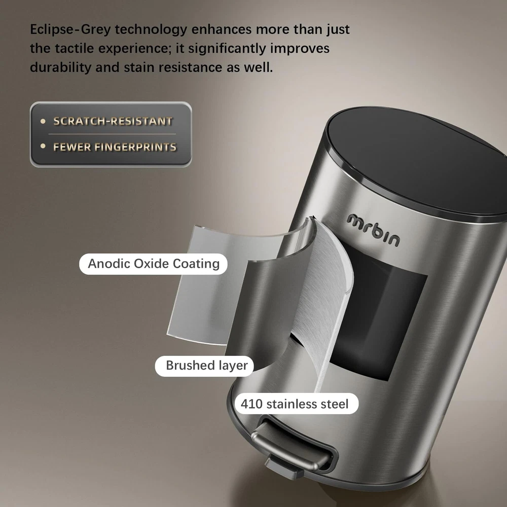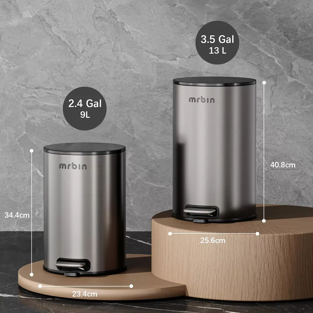 Elegant Art-Inspired Decor Accessory: This decorative trash can enhances your home decor with a minimalist design and a tungsten grey steel construction. Its matte oxidized finish and super-thin lid offer a sophisticated touch, elevating the aesthetic of any space with a high-end accessory. Durable and Rust-Resistant Wastebasket: Crafted with a fortified metal construction, this wastebasket offers unmatched durability and rust resistance for your bath or toilet. Its advanced surface technology eliminates stains and fingerprints, ensuring a pristine and reliable waste solution for long-term use. Silent Covered Disposal: Enjoy the tranquility with our covered trash can, designed with a quiet closure system that offers low-noise, slow lid descent, ensuring a peaceful environment. Premium Plastic Inner Bucket: This waste container boasts a removable premium plastic inner bin with a built-in handle for easy cleaning and disposal. The retention hole keeps trash bags tidy and concealed, ensuring your can remains clean and presentable. Portable Compact Design: Equipped with a convenient rear handle for easy movement, this 2.4 gallons capacity waste container, with its compact dimensions of 9.2 * 9.2 * 13.58 inches, serves as an ideal accessory for restroom essentials and a practical office trash can for placement near desks.