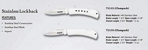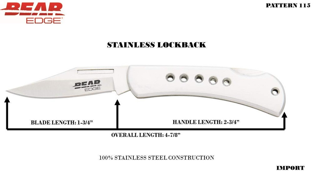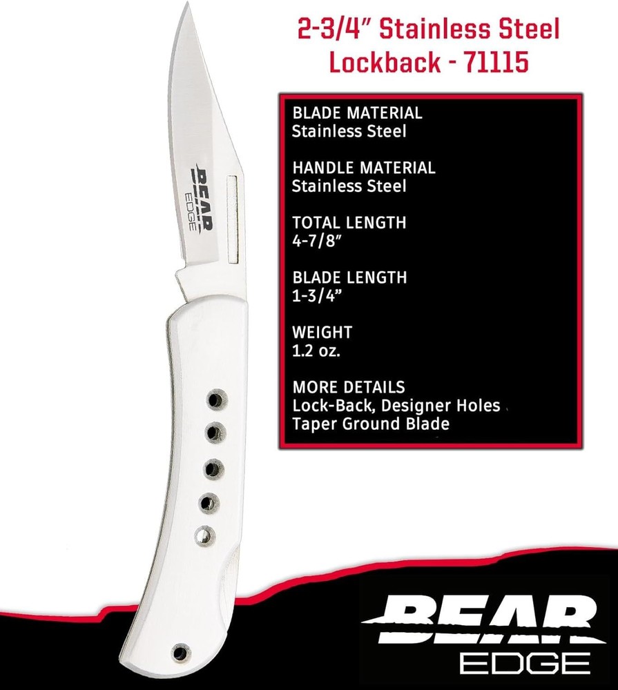 The Bear edge 71115 440 stainless steel lock back with Designer holes knife features stainless steel handles with 440 stainless steel blade, stainless steel construction. The Bear & Son Stainless Steel Lockback is a high-quality folding knife that features a sharp high carbon stainless steel blade and handle for a firm grip. RAZOR SHARP 440 STAINLESS STEEL BLADE – 440 stainless steel is known for its strength and wear resistance. The clip point blade has a thickness of .09” and a hardness of 57-60 HRC ensuring a lost lasting edge that is easy to sharpen. COMPACT AND LIGHTWEIGHT – With a closed length of 4-7/8", open length of 4-7/8”, blade length of 1-3/4", and weight of only 1.2 oz, this knife is compact, lightweight, and a great everyday carry knife. DURABLE DESIGN - The Stainless Steel Lockback features a durable stainless steel handle with designer holes to provide great grip in the worst conditions. FULL LIFETIME WARRANTY - Bear & Son, Inc. warrants to each original purchaser of its knives for such purchaser’s lifetime, that its knives are free from any defect in material and workmanship. This knife is proudly built in the USA.