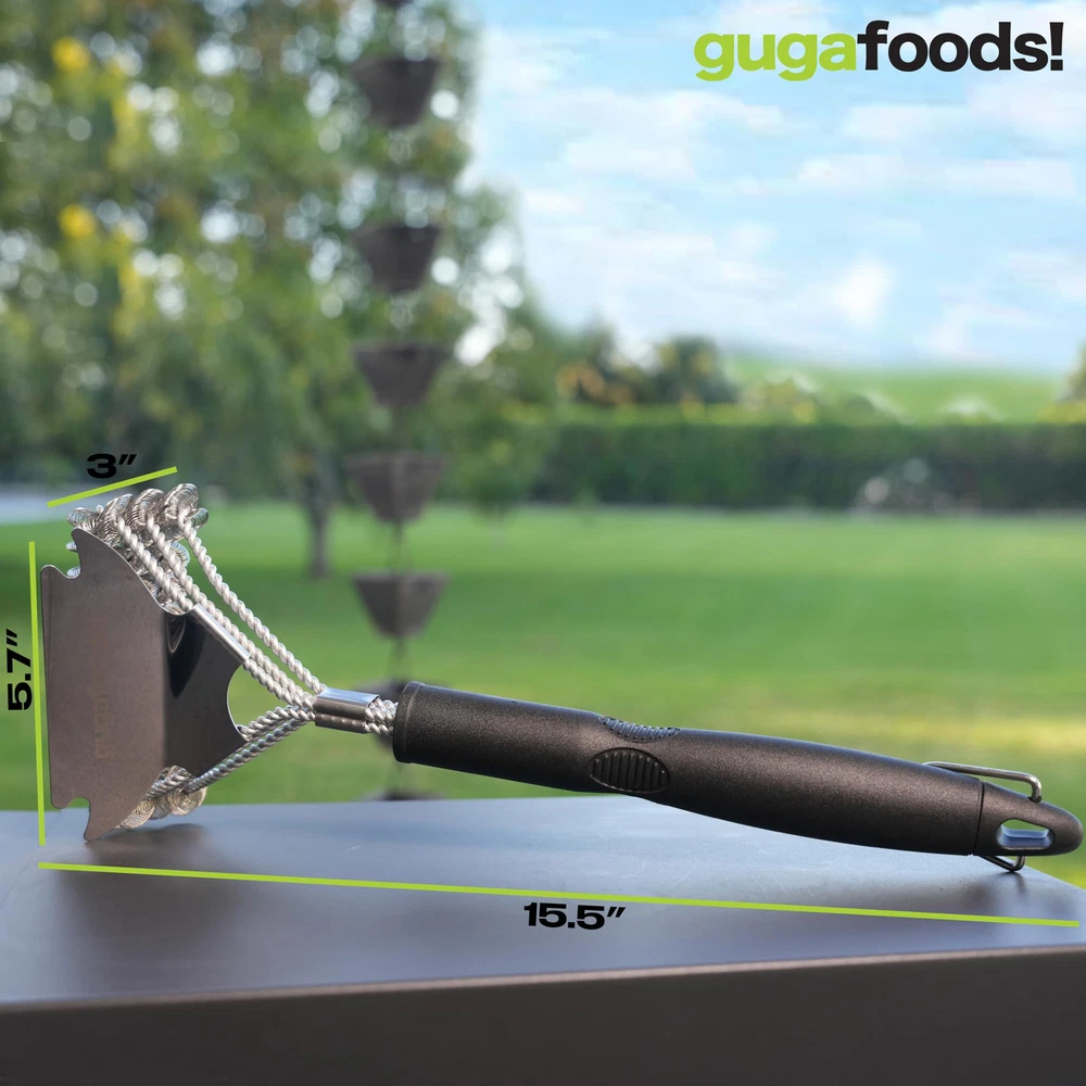 Elevate your grilling with Grill Brush, featuring durable stainless-steel bristles and a sturdy polypropylene handle. Crafted for top-notch quality and safety, it ensures efficient cleaning without the risk of metal bristles. Constructed from food-safe materials, it's both reliable and effective. Preheat your grill, scrape off stains with the scraper, and clean between grates with the wire brush for worry-free cooking every time. GRILL BRUSH Elevate your grilling experience with Grill Brush, featuring a durable stainless-steel brush & scraper with a strong polypropylene plastic handle. This premium grill brush is designed for those seeking top-notch quality and performance. Guga Grill Brush provides increased surface area for quicker and more efficient cleaning of grills. 2-in-1 Design This versatile grill tool features both a wire brush and scraper, allowing you to tackle tough grime and residue with ease. Effortlessly remove stubborn debris and grease for a pristine bbq cooking surface. The wire brush is designed to reach all areas of your grill. BRISTLE FREE SAFETY Embrace worry-free grilling with our bristle-free safety feature, crafted with a spiraled stainless steel wire design that eliminates the risk of metal bristles breaking down in with your meals, to have a secure and enjoyable cooking experience. STAINLESS STEEL Crafted with a stainless-steel brush & scrapper for a durable yet lightweight design that is built to last. It's rust-resistant and durable, providing reliable performance for countless grilling sessions and withstands outdoor elements. Equipped with a built-in hook, our grill brush is designed for easy storage when not in use. Hang it on your grill or kitchen utensil rack for quick access whenever you need it. ENHANCE YOUR GRILLING EXPERIENCE Keep your grill grates clean and maintain optimal performance with our bristle-free grill brush & scraper. Perfect for use on all grill types, from gas and to and more. For best performance Preheat the grill for 15 minutes, use the scraper to gently scrape off the stubborn stains and fat off the grill. Use the wire brush side to clean the top, and in between the grates.