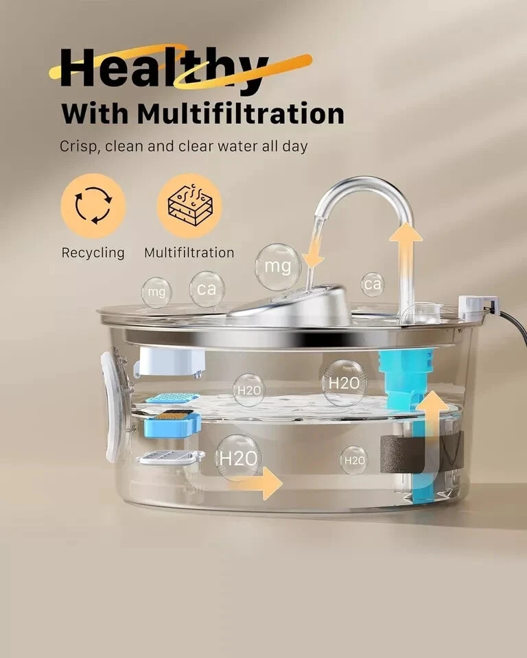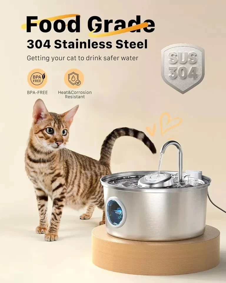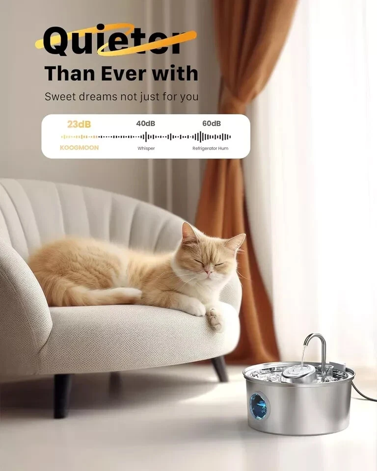 Stainless Steel Cat Water Fountain 3.2L Pet Drinking Fountain Dispenser for Cats 😸No Need for Frequent Water Refills: With a capacity of 3.2L/108oz, this cat water dispenser ensures your pets have access to water throughout the day - making it perfect for busy, pet-loving families. 😸Crisp, Clean and Clear Water All Day: The KOOGMOON dog water fountain is the perfect way to keep your furry friends hydrated with fresh, filtered water whenever they need it. This pet water fountain's multiple filtration system that removes impurities and hair, ensuring your cat and dog have access to clean and healthy water. 😸Make Water Monitoring Easier: This pet water fountain with visualized water level window make Water volume at a glance at any time. Simultaneously, the cat water fountain has a blue light so pets can find the water source themselves when thirsty at night. 😸Quieter Than Ever with: The sound of this water fountain's pump is almost 23dB when running. Sweet dreams not only you but also your pet. And the lower-voltage, more efficient water pump provide a steady flow of fresh water for your furry friend to drink whenever they please. 😸Entice Them to Drink More: With multi-drinking angle and the design of faucets, this cat fountains for drinking is sure to catch your pet's attention and encourage them to drink more water throughout the day. 😸0 Hard-To-Clean Area: Easier to clean and safer than plastic water dispensers, it is made from food grade 304 stainless steel. The split design of the water cooler can be completely washed down. 😸Customer service: 2 years pump warranty, if you have any problem, contact us for replacement. You can buy from our store if you need more parts.
