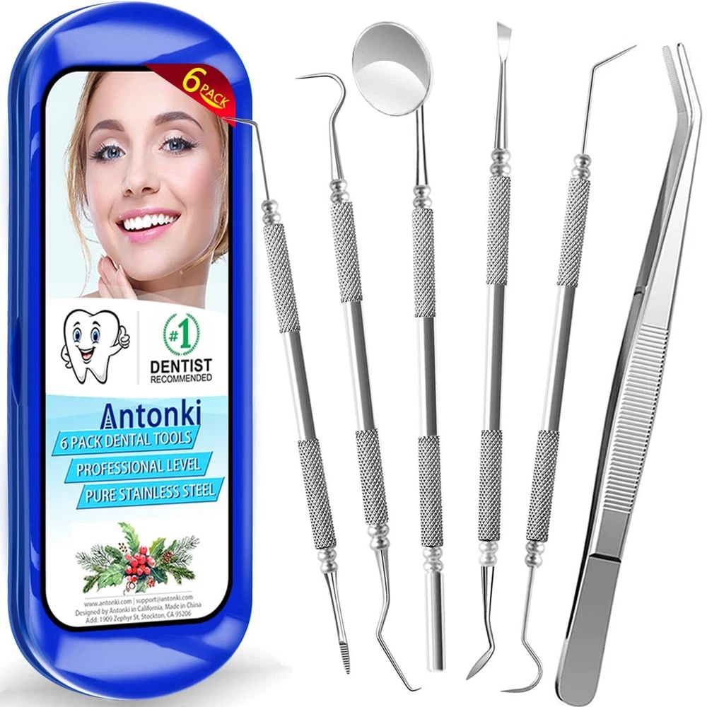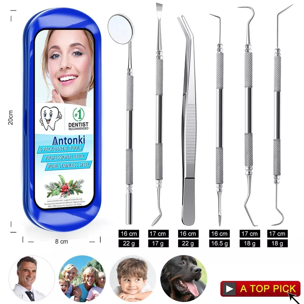 Many times you don't want to waste much money on seeing dentist. Now, this dental tools set can easily help you to care the teeth as a pro at home. The most useful teeth cleaning tools, your best choice! This dental tools set is the newest version in 2022. Its unique carved handle can ensure easier use. Sharp dental pick is packed perfectly by silicone cover. Never worry hurt by the sharp tips. The plaque remover is made of duty stainless steel. Great quality and durable for years. Bad quality? Full refund! Each dental tools are position in slot of a great carrying box. It is easy to carry and store. BEST PROFESSIONAL DENTAL TOOLS KIT WITH GREAT CARRYING BOX [ UPGRADED VERSION ] You deserve best here! This upgraded version professional dental tools set is design to maximum your dental cleaning. It can help you to become a pro to care your teeth at home. You don't need to visit a dentist and will save a lot of money! A perfect dental hygiene kit is the best remedy to remove plaque and fresh your breath. This item is made of top quality stainless steel, which is build to last for years. Instead of old version, this teeth cleaning tools is sharp and protected with silicone cover. No worry the sharp tips to hurt your hands. And the carved handle design is more easier to handle while using. Come with a high quality plastic carrying box. Each tool has a unique slot. Very easy to carry and store. This great box can keep the tools clean. YOU WILL GET: 6 PACK* STAINLESS STEEL DENTAL TOOLS; 1 PACK* ORGANIZED CASE; 1000+ DAYS USING! WORTH EVERY PENNY! DON'T MISS THIS GREAT PRODUCT! SURGICAL STAINLESS STEEL Durable rustproof surgical grade stainless steel ensures these teeth cleaning tools will last for years. Easy to disinfect with hot water. EASY TO ORGANIZE Comes with a plastic case, all the tools are well organized into individual slot, keeping them clean and safe. Not like metal case, the plastic case is washable and rustproof. Portable to carry on the journey. PROTECTIVE SILICONE COVERS Silicone cover protects the sharp tools from dust, keep them clean to use in mouth. No worries about the sharp tips hurting your hands. ANTISKID GRIP HANDLE Carved handle allows you holding the dental tools stable. Mouth mirror help you see the inner side of mouth and clean the teeth by yourself at home. It's also a perfect choice for professional dentist. You will get: 6 pcs * Basic dental tools; 1 pc * Plastic organized case. Each tool is positioned in the individual slot; The sharp needles are protected by silicone covers; Perfect for pros and home use. SIMPLE STEPS, BIG BENIFITS! Show your smile to the world It's time to choose an affordable additional tool for dental cleaning at home. Made of surgical grade stainless steel, it will long last for years to make deeply clean of the teeth where brushing can not reach. These oral hygiene kit are suitable for dentist, adults and pets. Simple steps to use: Step 1: Gargling to start the process; Step 2: Disinfect the tools with hot water; Step 3: Choose correct tool accordingly; Step 4: Gargling with salt water again; Step 5: Wash & dry all the tools after using; Product Details Product name: 6 Pack Basic Dental Tools Kit Brand name: Antonki Version: Upgraded Version Material: Surgical Stainless Steel Origin: Design in California, Made in China Used for: Plaque and tartar removal, Food cleaning, Gum stimulating, Teeth whitening Organized case included: √ Dishwasher safe: √ Rustproof: √ Apply to: Dentist, Family, Pets. Package include: 6 pcs * Basic dental tools; 1 pc * Plastic organized case. Use warning: Keep it away from childrens; Clean the tools with hot water before and after each use; Gargling with salt water will work better; Wash the mirror with hot water will help to avoid fogs up.