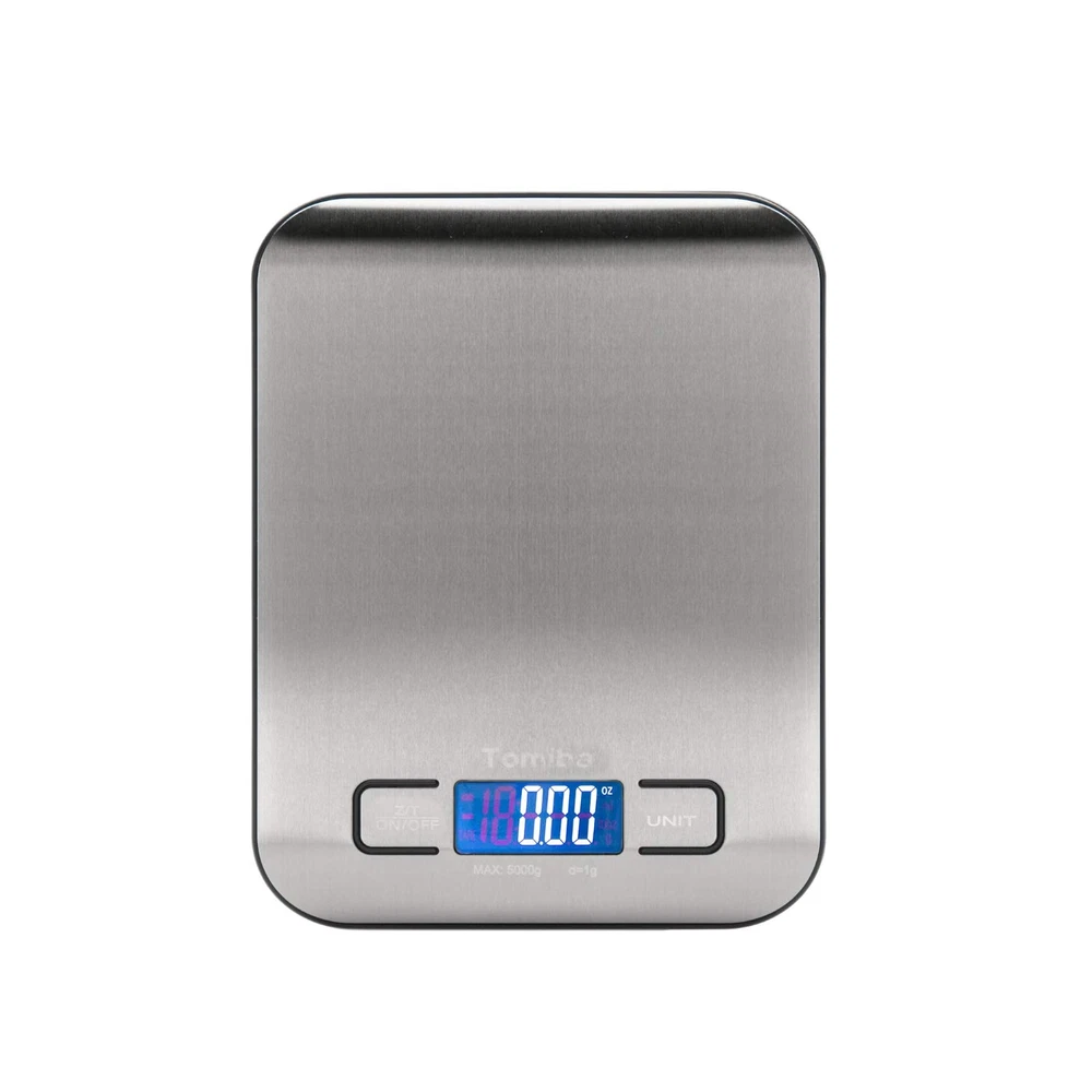Stainless Steel Platform, 5kg/11lb capacity, 0.05oz/1g division, Perfect for baking, cooking, and postage TARE Function can reset the current weight on the scales to zero, quick unit conversion, Volume Measurement Supported, Easy-to-read display features Large Digital Numbers with optional back-light Space-Saving Design: Thin profile allows for easy storage and lightweight portability, batteries included Auto Shut-Off: The scales switch off after 2 minutes of inactivity if you forget to turn them off or your hands are all gooey with food Meet CE/ROHS certification, 2 x AAA batteries included Product Description Troubleshooting: -'EEEE': Overload, remove the object from the scale to avoid damage. -'Lo': Low voltage. Please install new batteries. -'UnSE': Calibration error, please turn off and turn the scale back on to retry measurement. Package Contents: 1 x Digital Kitchen Scale 2 x AAA batteries 1 x User Manual TOMIBA Digital Kitchen Scale Easily measure your garnishes and ingredients by grams, milliliters, pounds, and ounces with the quick unit conversion button. The digital scale features a handy auto-tare function so you can easily measure ingredients in a dish. The scale is designed with a smooth stainless steel platform for easy cleaning and maintenance. Weight Capacity:176 oz | 5000 g | 11 lbs Units:g | ml | oz | lb'oz Division Value: 0.05 oz | 1 g Auto-Off Function Tare Function Precise Measurement TOMIBA is a professional engaged in electronic weighing, tableware, kitchen utensils and other household products design, development, production and sales enterprises. TOMIBA have own product R & D Design Center, and in-depth cooperation with the Design Studio form Italian and USA, offering more than 20 new designs each year. With professional team, modern design, superior quality, standard management.