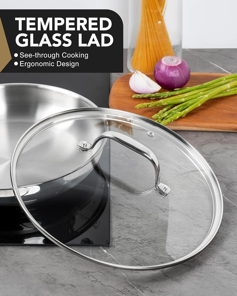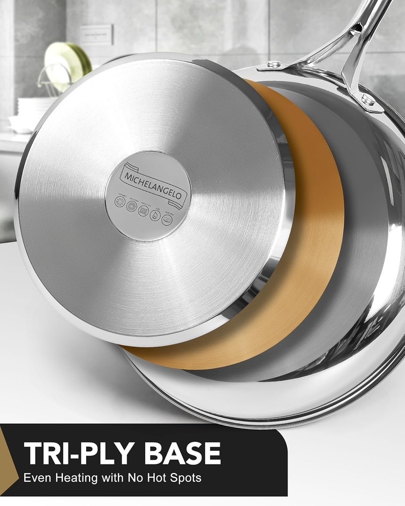 MICHELANGELO Stainless Steel Frying Pan Set with Lid, 8" 10" 8-10 Inch+Lid Product Details Material: Stainless Steel Brand: MICHELANGELO Size: 8-10 Inch+Lid Handle Material: Stainless Steel Is Dishwasher Safe: Yes Is Oven Safe: Yes With Lid: Yes Special Feature: Non Toxic Product Dimensions: 17.72 x 10.24 x 1.77 inches Item Weight: 6.34 pounds Country of Origin: China From Searing to Simmering in One Set – The 8 inch stainless steel pan handles quick tasks, while the 10 inch frying pan with lid excels at braising, steaming, and saucy dishes. Durable Construction: Crafted from high-quality 18/10 stainless steel, this frying pan set is built to last. Resistant to rust and corrosion, these pans ensure long-term performance for all your cooking needs. Healthy Cooking Made Easy: The 10 inch skillet with lid locks in moisture for perfect veggies, chicken, or rice—ideal for health-conscious cooks. Even Heat Distribution: Enjoy consistent cooking results with our stainless steel pans, designed for even heat distribution. Eliminate hot spots and enhance your culinary creations with perfectly cooked meals every time. Comfortable Handling: Featuring ergonomic, heat-resistant handles, these pans offer a secure grip for safe and comfortable cooking. Cook with confidence and ease, no matter the task. Effortless Cleanup: Cleaning is a breeze with our smooth, dishwasher-safe surface. Spend less time scrubbing and more time enjoying your meals, making it ideal for busy home cooks.