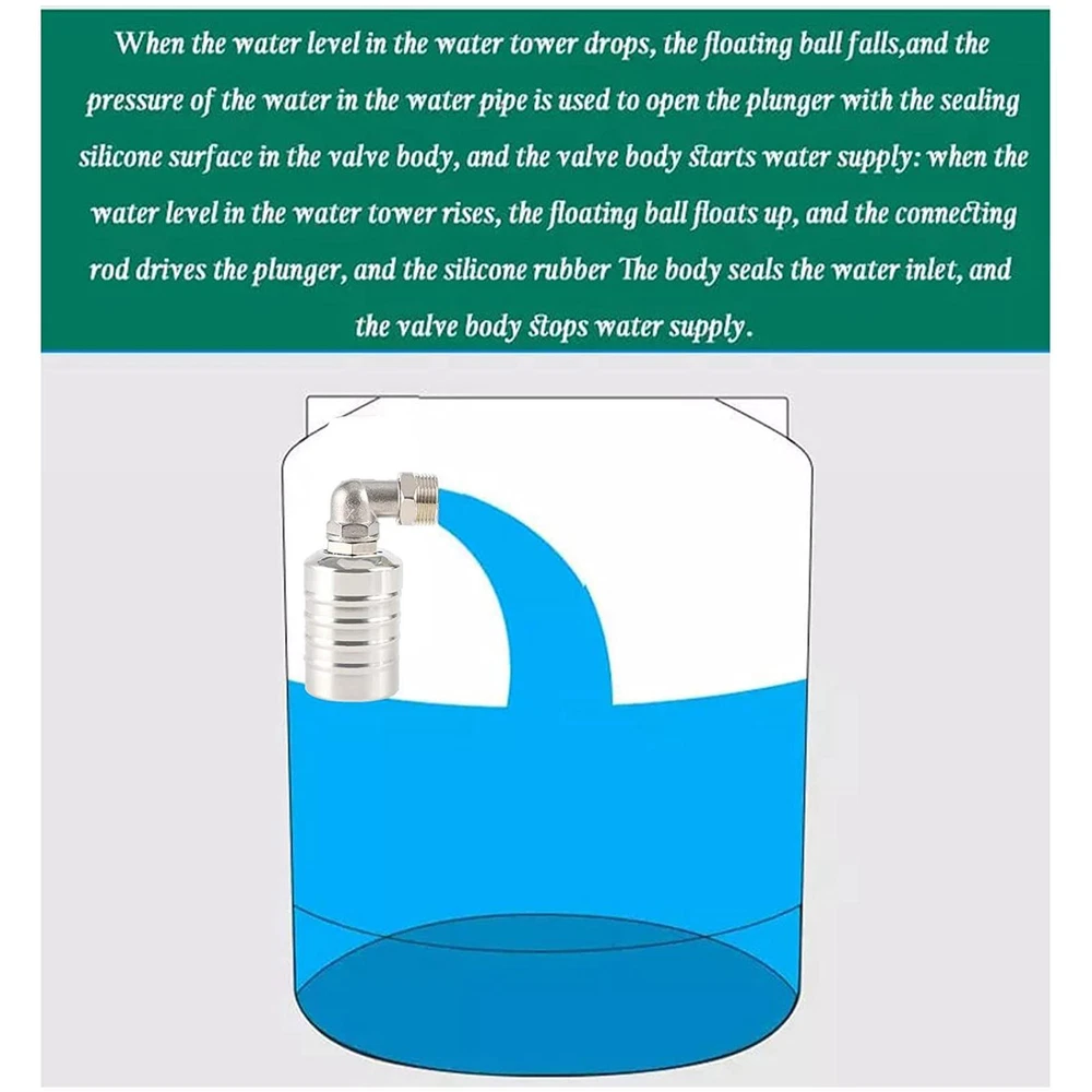 Save Space: With a small volume, the water float valves do not take up space in your tank or pool. It also has a large displacement, which can increase the water output and prevent overflow. Durable and Safe: Made of food grade 304 stainless steel, this water level control floating is anti-friction and impact resistant, ensuring a long use time and making drinking water safe. It is also strong and sturdy, withstanding high water pressure. Automatic Work: The float valves work automatically to maintain the water level. It has a sealed silicone face valves that can withstand high water pressure. When the water level drops, the plunger opens and fills the tank. When the water level rises, the float lifts up and closes the plunger. Widely Applicable: Whether you have water tanks, solar water tanks, pools, water towers, or cisterns, the automatic float valves can automatically control the water level and prevent overflow. High and Low-Temperature Resistant: The water level control valves are high-temperature resistant that is waterproof and fireproof. It can work in a wide range of ambient temperatures and has a higher melting point than other float valves. Description: These valves are made of high-quality material that is high and low-temperature resistant. They can automatically control the water level in solar water tanks without electricity or manual intervention. Enjoy the convenience and efficiency of these valves that are superior to traditional craft. Specification: Name: Float Valves Material: Stainless steel Size: (approx.) 6 points water inlet: 4.8*7cm/1.89*2.76in 6 points side water inlet: 4.8*9.5cm/1.89*3.74in Style: as the picture shown Packing List: 6 points water inlet*1 or 6 points side water inlet Notes: 1. Due to the different monitor and light effects, the actual color of the item might be slightly different from the color which is shown in the pictures. 2. Please forgive a slight measuring deviation due to manual measurement.