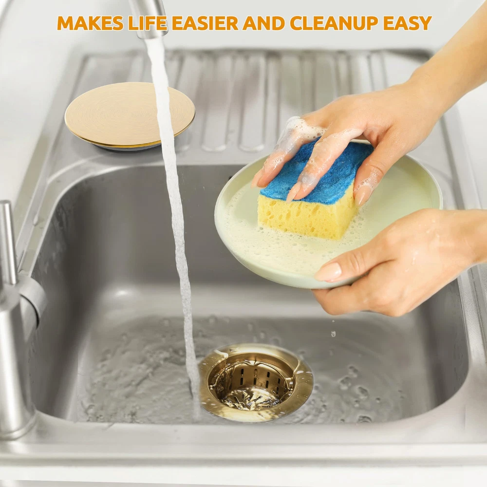 DURABLE STAINLESS STEEL: The gold kitchen sink drain is made of premium 304 stainless steel for durability and resistant to rust and corrosion to provide reliable filtration for years to come (NOTE: It can not be connected to the garbage disposal.) UNIVERSAL FIT: The kitchen sink strainer has a 3.5 inch opening that is compatible with most kitchen sinks. The kitchen sink drain assembly is 2-3/8 inches thick to fit a wide range of materials such as stainless steel, ceramic, marble and other sinks EFFICIENT DOUBLE FILTRATION: Stainless steel sink strainer with removable deep strainer basket has 56 drain holes to quickly intercept food debris and jewellery and prevent clogging. The bottom divider prevents knives forks from falling down the drain WITH HANDY SEALING LID: The kitchen sink drain kit comes with a flat lid with a sealing ring for great seal that prevents leaks and stores water for easy cleaning of items. Also, the sealing lid prevents odour spillage to keep your kitchen smelling fresh EASY TO INSTALL MAINTAIN: The kitchen drain assembly is designed to be easy to install for quick and easy setup into your sink. It's also easy to maintain - simply remove the basket strainer, pour out the debris and rinse with warm water and soap