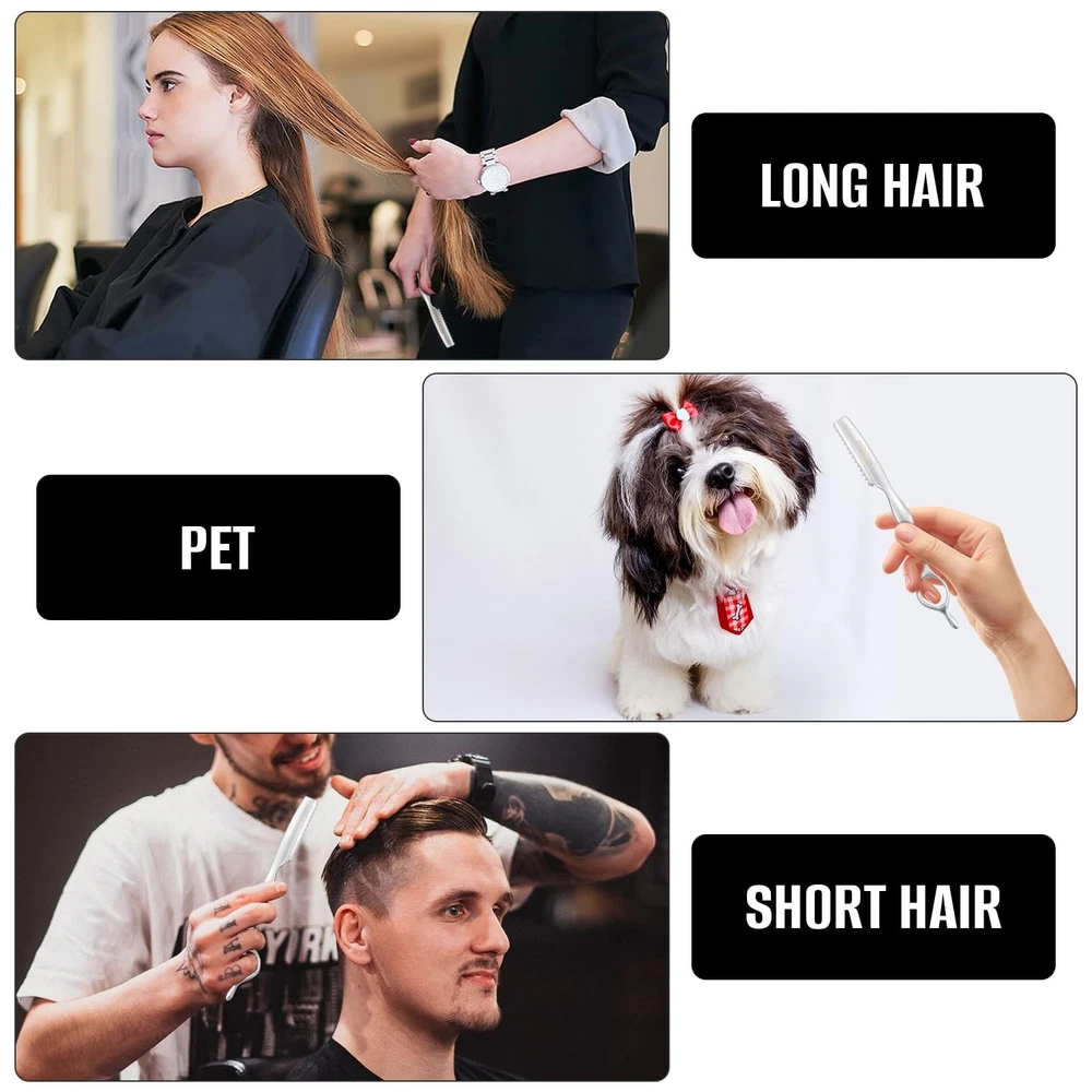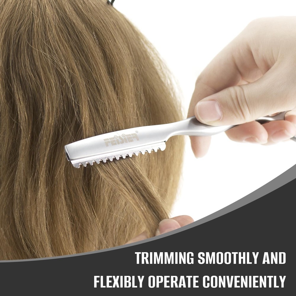 Stainless Steel Hair Thinning Styling Razors for Cutting Hair, Silver Product Details Product Dimensions : 7.28 x 0.98 x 0.28 inches; 4.16 ounces Manufacturer : FEISIER Brand: FEISIER Number of Blades: 10 Recommended Uses For Product: Hair Thinning Styling Age Range (Description): Adult Skin Type: Normal 【DURABLE MATERIAL】: The Hair thinning razor is made of stainless steel and inclued 10 replacement blades in a box. The quantity is enough to meet your daily use and replacement, and can provide you with long-lasting service. 【UNIQUE DESIGN】: The appearance of adopts matte finish,the frosted look more advanced. The handle is ergonomically designed and functional, reducing thumb and wrist hyperextension and relaxing elbows and wrists. 【EASY TO USE】: Hair thinning razor easy to install,quick blade insert and remove, thinning Razor is innovatively designed for smooth styling experience.Easy for anyone to use, suitable for salon, home and personal use, giving you a relaxing and shaving experience. 【SAFETY CUTTING HAIR】: Hair thinning knife with safety guard, better prevent skin from being scratched.Also note that it comes with sharp blades, should be handled with care. 【VARIOUS FUNCTION】: Slender razor edge can be used for thin bangs, shaving, trimming hair, etc, you can also use them to trim wigs and pet's bristle.Favorite hair thinning knife for stylists and barbers, suitable for all types of hair.