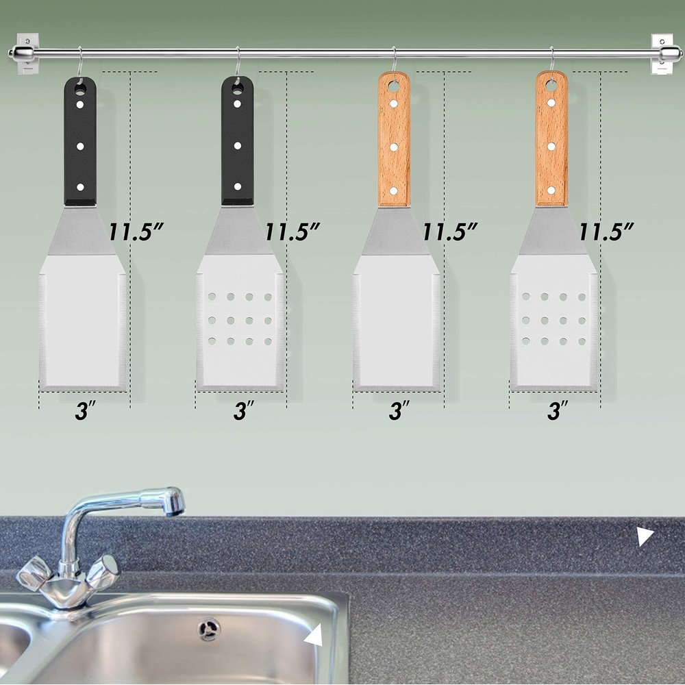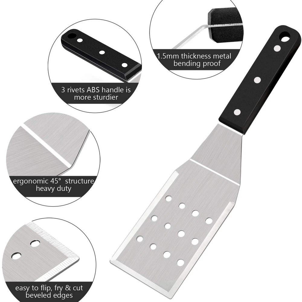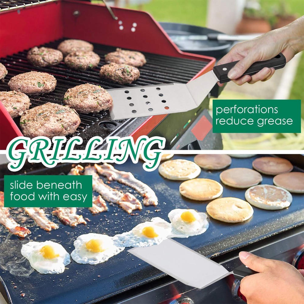HaSteeL Metal Spatulas, Stainless Steel Griddle Spatula Tools with Riveted Handle, Heavy Duty Burger Turner for Teppanyaki BBQ Flat Top Hibachi Cast Iron Grilling Cooking, Dishwasher Safe - (2Packs) GRIDDLE SET - Including a solid metal spatula and a perforated burger turner to meet different cooking needs, Size 11.5in and blade width 3in, Plus 2 hooks for convenient hanging and storage without mess, Dishwasher safe DURABLE & STURDY - Made of high quality stainless steel ensure a long service life, Up to 1.5mm thickness of heavy duty metal hold heavier stuff without bending, Matte finished and smooth metal for easy and safe cleaning RIVETED HANDLE - ABS plastic handle with triple rivets is more stable than those flimsy ones, Ergonomic handle fits perfectly into extended metal part and ensure a better use, Non falling nails and wobbling handles BEVELED EDGE - Advantage of 3-sided beveled edges make flipping, frying, transferring and lifting effortless, Sharp enough for great cutting and scraping, Perforated surface can filter extra grease or liquid A MUST HAVE - Multipurpose for indoor and outdoor, Like kitchen cooking and baking for homemakers, restaurant serving and preparing for chefs, backyard party, cookouts, camping, tailgating for BBQ fans HaSteel Metal Griddle Spatula Set of 2 is made of premium stainless steel with solid handle to make you feel like a grill pro. Built to last by 1.5mm thickness of heavy duty metal to ensure bending proof. Ergonomic ABS handles are heat proof to protect your hands from scalding and ensure a comfortable grip. 45° angled structure and beveled edge make cooking, flipping and frying much easier and reduce fatigue while use. Specifications: Content: 1 x Solid Metal Spatula, Size L 11.5in by W 3in 1 x Perforated Burger Turner, Size L 11.5in by W 3in 2 x Hanging Hooks Blade Material: High Quality stainless Steel Handle Material: Heatproof ABS Plastic Using tips: 1. Use warm soap water to wash thoroughly those residue left from manufacturing before first use. 2. Used mild detergent to clean up after each use, then dry it by soft rag immediately instead of air dry to avoid water stains. 3. Store it in a dry place to keep its beautiful surface and durability. Satisfaction guarantee: HaSteeL attach great importance to every customer’s complete satisfaction and shopping experience. Your support and trust in us are just what we are strive for. We’re always here to solve problem for you at the first time. Shipping We offer FREE shipping on all orders! We ship within Three business days of payment, usually sooner. We use a selection of shipping services such as UPS, FedEx, USPS etc. We only ship to the lower 48 states, no APO/FPO addresses or PO Boxes allowed. Local pickups and combined shipping options are not provided at this time. Return You can return a product for up to 30 days from the date you purchased it. Any product you return must be in the same condition you received it and in the original packaging. Please keep the receipt. Payment We accept payment by any of the following methods: PayPal Please pay as soon as possible after winning an auction, as that will allow us to post your item to you sooner! Feedback Customer satisfaction is very important to us. If you have any problem with your order, please contact us and we will do our best to make you satisfied. Contact Us If you have any queries, please contact us via ebay. We usually respond within 24 hours on weekdays. Please visit our eBay store to check out other items for sale! Thank you for shopping at our store.