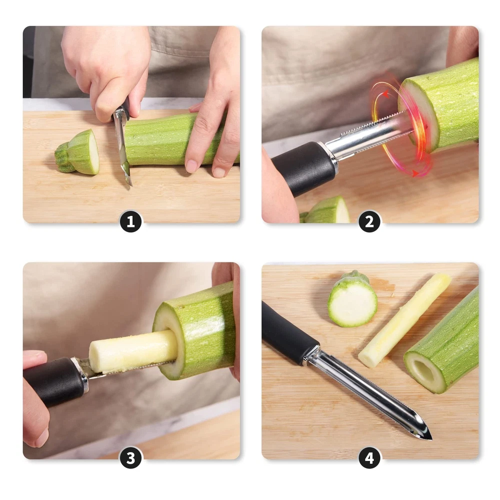 Newness Jalapeno Pepper Corer & Zucchini/Cucumber Corer can work well for pepper, zucchinis, cucumbers, pumpkins, eggplants and other vegetables and fruits. Do a great job to pull out the seeds. Not only removed the seeds but also removing the spines of vegetable interior. It was a thorough process!Traditional knife or spoon treatment is cumbersome, unsafe, and inefficient. Newness Jalapeno Pepper Corer & Zucchini/Cucumber Corer is easier, safer and faster to use than a knife! Just push and turn it, a clean pepper is done.Warm hint: Use this two kinds of tools together, will be more quick and convenient! 【Durable, Will Last Long】Made of food grade high quality stainless steel, durable and strong, not easy to bent. 【Practical Tools】Easy to use and makes hollowing out peppers SO MUCH EASIER AND FASTER! This corer is perfect for people that cannot eat seeds, opens up doors to enjoying these foods again. 【Simple and Easy to Operate】You just need to push and rotate it, a clean pepper or zucchini is done. It's a perfect accessory to help you quickly fill the pepper, such as smoked sausage, cream, cheese and more. Let's say goodbye to dangerous knives and troublesome forks. 【Two Different Blade Design】The rotating serrated blade design of pepper corer can help you to remove the core of the pepper perfectly. The 4.61 inch vertical serrated blade of zucchini/cucumber corer is designed to reach the depth of the vegetables and fruits. Combination of the two works will be better, make the treatment of each vegetable is clean, complete and fast. 【Great Kitchen Gift】Jalapeno pepper & zucchini corer is an essential tool in the home kitchen. A great gift for mum, chefs, or cooking lovers.