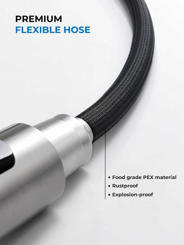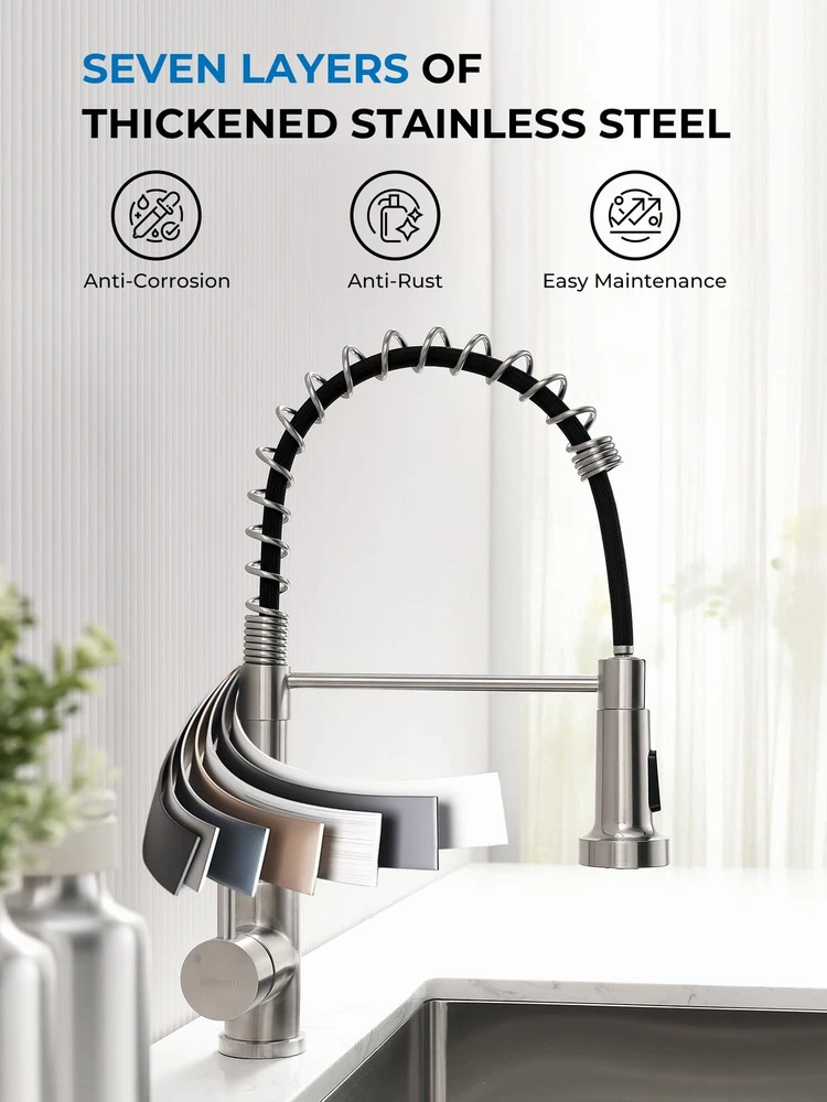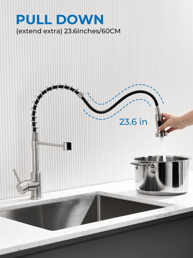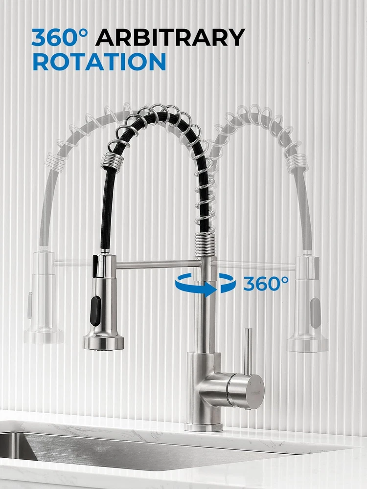 This kitchen faucet is a game-changer! The pull-down sprayer makes cleaning a breeze, reaching up to 23.6 inches for extra flexibility. The 360° swivel spout smoothly covers every corner of my double sink, and the dual water modes—stream and spray—handle any task effortlessly. The sleek stainless steel design adds a modern touch, and installation was surprisingly simple. No more struggling with hard-to-reach spots—this faucet makes kitchen work so much easier!