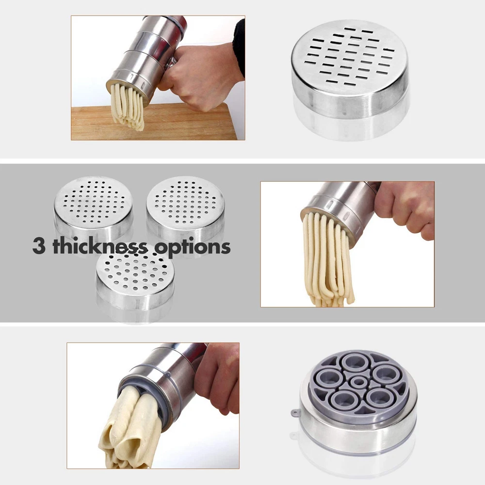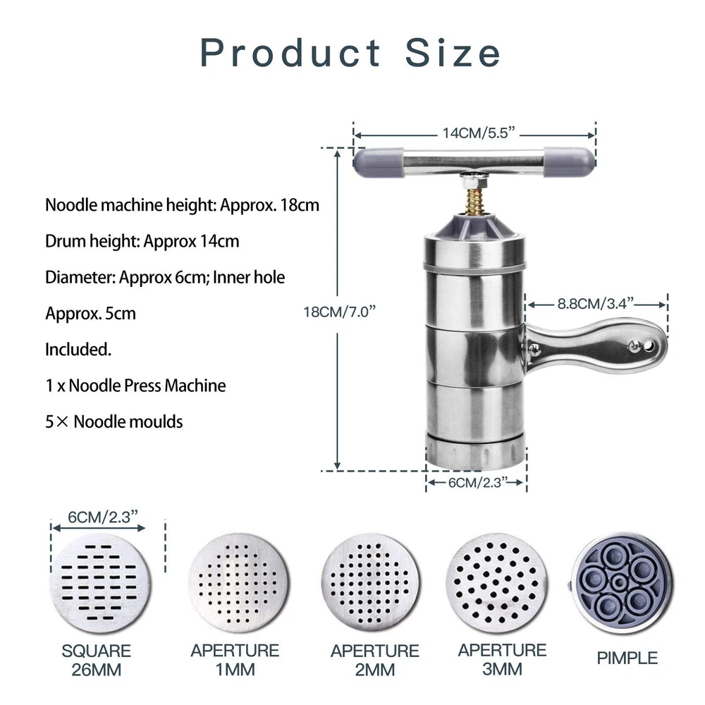 Stainless Steel Manual Noodle Pasta Maker Spaghetti Press Kitchen Press Machine Simply unscrew and change the moulds discs then you can make spaghetti fettuccine pasta noodle by yourself and it is easy to unscrew all the components for hand washing By using a simple turning motion that you can instantly change regular dough into different sizes of noodle or juicing the fruits with the handle, work smoothly and durable Helpful kitchen tool for making noodle, pasta and squeezing the fruits into juice; As creative gift for your cooking friends, mother and even a chef, cooker Control the proper mix of water and flour when you make a dough in order to avoid noodle breaking or sticking and exerting the machine's function to the best extent 100% Brand new and high quality Main function: Make dilicious noodle and extract juice Easy operation, save time Natural and harmless, tasteless and non corrosive Can be cleaned by water and keep as bright as when new Flat noodle width: 5mm; Round noodle diameter: 1mm/2mm/3mm Making noodle: 1. Knead dough with water to make it soft(Add some edible oil would be better) 2. Unscrew the cover and put the dough, vegetable or have cut fruits into the drum, then screw the handle and noodle or juice will come out 3. Put the bottom of machine close to water for easy coming out 4. After usage, disassemble it and wash with water Color: As shown in the picture Material: Mainly Stainless steel Noodle machine height: Approx. 18cm; Drum height: Approx. 14cm; Diameter: Approx. 6cm; Inner hole:Approx. 5cm Included: 1 x Noodle Press Machine 5 x Noodle Moulds operate :Twist the rotation rod after fill a soft dough inside the main cylinder of the noodle press, then the noodle will come out from the mould; Help you making thin, middle, thick paste, udon, spaghetti, fettuccine and etc A useful home kitchen noodle press maker, helping you to make different size of noodle and it can also be used for little lemon, lime, citrus pressing Package includes: 1 * Noodle maker 5 * Module ergonomic grip on the rotation rod and a stainless steel holding handle, one hand to hold the middle handle and the other hand to rotate the rod; Easily squeezing dough and use less effort Simply unscrew and change the moulds discs then you can make spaghetti fettuccine pasta noodle by yourself High Quality and Brand New Easy to operate and wash with water Perfect for home or restaurant use Natural and harmless, tasteless and non corrosive