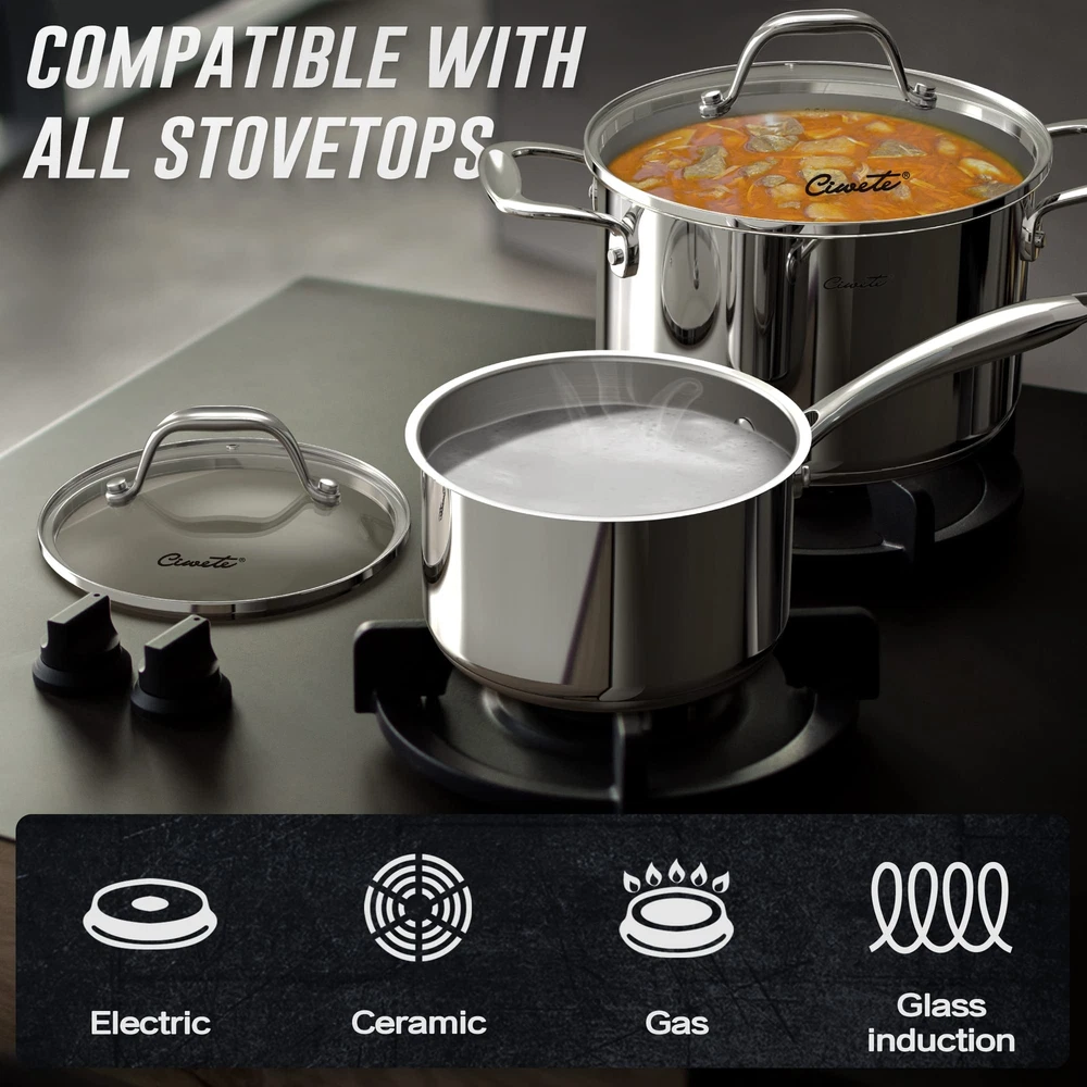 【10 PC Cookware Set】Include: 8'' & 10'' Nonstick Frying Pan, 1.5 Qt Saucepan with Lid, 3 Qt Saucepan with Lid, 3 Qt Saute Pan with Lid, 9 Qt Stock Pot with Lid. Daily stir-frying, party and dinner preparation is a must need kitchen help, is the family pots and pans set 【3 Ply Stainless Steel Construction】Professional aluminum core, inside and outside advanced stainless steel wrap design, so the steel pot is heated more evenly, compared to the thin stainless steel pot is also more sturdy. 【Precise & Practical Design】The ergonomic handle of integrated molding, the V-shaped design of the handle and the pot body, maximizes the user's feeling, improves the grip feeling and reduces the heat conduction. This is true not only of our pans, but also of the handle of the lid. 【Nonstick coating frying pans】In order to reduce the trouble of frying sticking, we introduced a new set of non-stick coating frying pan. The bottom of the pan is still Tri-ply of stainless steel design. If you are not used to it, we also provide 11PC full Tri-Ply stainless steel pots and pans set for you (Asin: B09P5XGQN3) 【Use & Care Tips】 Suitable for all stove tops(electric, gas, ceramic, glass) ; Oven safe up to 400 ℉ (lids upto 350 ℉); Dishwasher safe; PFOA, lead and cadmium free 【Sincere Service & Quality Assurance】 Lifetime Limited warranty. is committed to providing good purchase and after-sales experience, any questions please contact us anytime :)