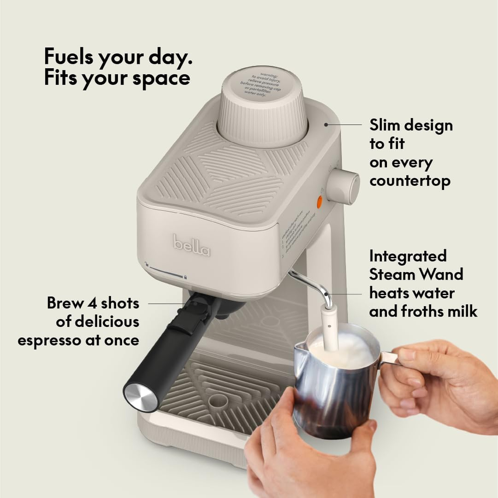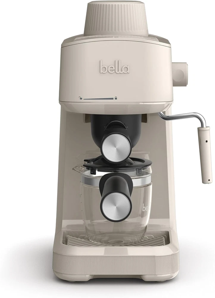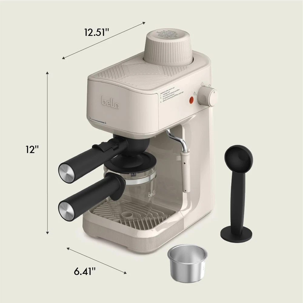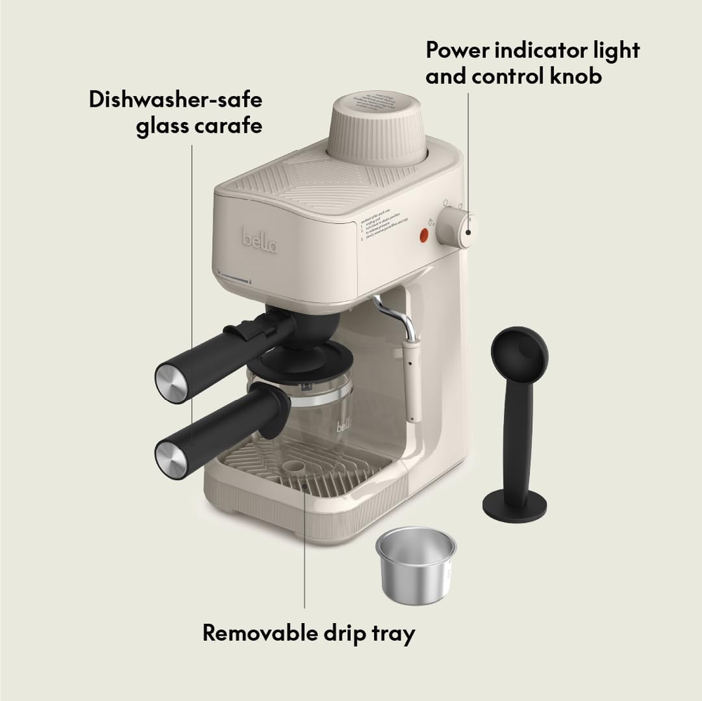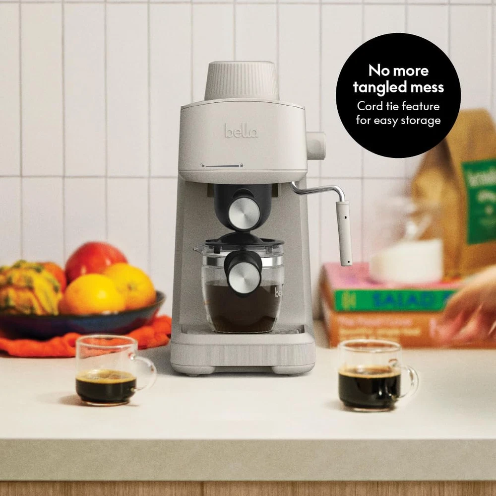 Brew Like a Barista: Make up to four shots of rich, strong espresso with one pull, perfect for crafting café-quality drinks at home. The bella Steam Espresso Maker delivers full-bodied coffee with a layer of beautiful crema, every time Steam & Froth with Ease: The built-in steam wand of the coffee maker heats water and froths milk for delicious lattes, cappuccinos, and flat whites. Create creamy microfoam effortlessly, elevating your coffee experience to café-level quality at home Perfect Espresso Temperature: The espresso machine 0.24L die-cast aluminum alloy boiler heats water to the optimal temperature, ensuring smooth, flavorful coffee with every brew. Say goodbye to bitter or weak coffee with this precision heating Eco-Friendly Filter: Brew with the portable coffee maker reusable 4-cup stainless steel filter, designed for durability and excellent taste. It’s a safe, cost-effective way to enjoy your daily espresso without the waste of single-use filters Barista-Approved Tools: The espresso coffee maker includes a 2-in-1 measuring cup and tamper for precise coffee prep. The glass carafe and removable drip tray are dishwasher safe, making cleanup easy, so you can enjoy your coffee without the hassle Transform your coffee routine with the bella Steam Espresso Maker, a stylish and compact addition to any kitchen. Designed for both performance and elegance, this slim-profile brewing system delivers the rich, full-bodied coffee you'd expect from a high-end coffeehouse. The 3.5 bar pressure ensures each shot is pulled with perfect crema, while the integrated steam wand of these coffee machines creates silky smooth microfoam for lattes, cappuccinos, and more. Engineered for convenience, the bella electric moka pot features a cord tie for a neat, clutter-free countertop. The portafilter, which holds up to 4 shots of espresso grounds, along with the glass carafe, are both dishwasher safe for easy cleanup. The removable drip tray simplifies maintenance, ensuring that your espresso experience is always effortless and enjoyable. Beyond its sleek design, our kitchen appliances excel in precision. The included 2-in-1 measuring scoop and tampering tool guarantee that your grounds are prepared perfectly every time, leading to consistently delicious results. With built-in safety features like overheating and overpressure protection, you can brew with confidence. Whether you're a coffee enthusiast or new to the world of espresso, the bella single cup coffee maker offers a chic and reliable way to enjoy barista-quality coffee at home.