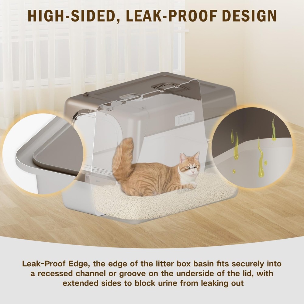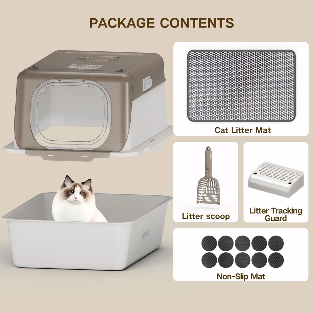 Cat Litter Box with Lid,Front Entry Top Exit Kitty Litter Box,Extra Large Enclosed Metal Litter Box with Litter Scoop & Litter Mat,stainless steel cat litter box, covered litter box for cats, large cat litter box with lid, enclosed cat litter box for odor control, splash-proof litter pan, magnetic door cat box, easy to clean litter box, odor free litter box, litter box with activated charcoal filter, modern cat litter box, anti-stick litter box, litter box for large cats, no smell litter box, high wall litter box, cat potty box, metal cat litter tray, semi enclosed cat box, full enclosed litter box, durable litter pan for cats, cat litter box for apartments, luxury litter box for cats, heavy-duty cat litter box, litter box, cat litter box with ventilation Premium Stainless Steel Litter Pan – Scratch Resistant & Hygienic Unlike traditional plastic trays, this cat litter box features a high-quality stainless steel bottom with a durable powder-coated finish. It’s scratch-resistant, non-stick, and easy to clean—no more lingering odors or trapped litter clumps. Designed to stay cleaner for longer, offering both durability and hygiene for your feline friend. Magnetic Flap Door – Effortless Entry, Superior Odor Control Equipped with a magnetic front door, this litter box allows your cat to enter and exit freely while locking odors inside. The strong seal helps trap smells and prevents litter tracking, making it ideal for indoor use. Keeps your home fresh and clean with every use. Splash-Proof Design – No More Messes Around the Box Thoughtfully designed with raised walls and a smart splash guard system that blocks both scattered litter and high-aiming urine. Perfect for cats that dig or spray. Say goodbye to litter trails and messy cleanup—this kitty litter box keeps your floor spotless. Large Capacity – Suitable for Multi-Cat Homes With a 40-liter internal volume, this litter box offers ample space for one or more cats. Whether you have a kitten or a full-grown feline, the roomy design ensures comfort and convenience. Ideal for busy households or multi-cat families. Dual Mode – Semi-Enclosed or Fully-Enclosed Flexibility Customize your cat’s privacy by using the litter box as either a semi-open or fully enclosed system. The upper lid features ventilation holes to improve airflow and reduce moisture buildup. Comes with a charcoal filter to neutralize odors and purify the surrounding air. Easy to Assemble & Clean – Includes All Accessories This large cats litter box comes with everything you need, including a charcoal filter, litter mat, Litter Trap Step and all necessary fasteners. Simple installation takes just minutes, and the smooth stainless steel base resists sticking and residue. Less time cleaning, more time playing with your pet.