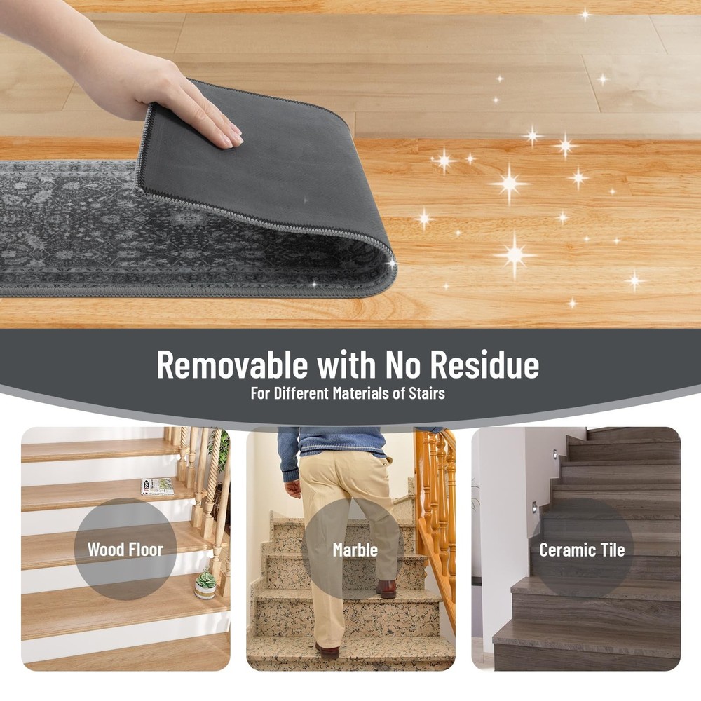Stair Treads Non Slip 15PCS 8"x30" Stair Treads for Wooden Steps, Rubber Backing Stair Runner Washable Carpet Stairs Treads, Indoor Safety Stair Runners for Kids Elders Dogs Product Details Size: 8"x30" Color: Grey Number of Items: 15 Brand: Tiveney MPN: ZY-HHboho-Grey-15 UPC: Does not apply EAN: Does not apply Material: Polyester (PET) Brand: Tiveney Item dimensions L x W x H: 30 x 8 x 0.3 inches Color: Grey Shape: Rectangular Item Thickness: 0.3 Inches Grade Rating: Residential Number of Items: 15 Item Weight: 10.5 pounds Product Dimensions: 30 x 8 x 0.3 inches Country of Origin: China Date First Available: June 10, 2024 Soft & Comfy: Our carpet treads for wood stairs are crafted from plush faux wool to create a soft, gentle surface that feels like walking on a cloud. With a 0.3" thickness, these stairs carpet non slip reduces noise by 80% and provides excellent cushioning for all your loved ones, ensuring a comfortable surface to walk on. Ultra Non-Slip Stair Treads indoor: The stair runners for wooden steps non slip with rubber backing can be firmly attached to the floor and stays in place, providing extra non-slip support and friction, allowing you to enjoy a more relaxed and safe experience up and down the stairs. Sturdy & stylish: Made with 100% low-pile faux wool and reinforced edges, our carpet runner for stairs can stand up to daily foot traffic and paw scratches. The abstract color patterns add a touch of modern style, enhance the aesthetics of any staircase. These indoor stair treads are the perfect choice for all. Easy Install & No Residue: Clean the floor, dry it, and place it. Without using any tape or permanent glue, this stair carpet strips leaves no residue after repositioning or removal, protecting your wooden floor. It can be used on various floors such as wood, tile, marble, metal and glass. Machine Washable: Maintain the carpet for stairs non slip 15 pack with ease by shaking or vacuuming, for a deep clean, toss them in the washing machine. The microfiber doesn't shed or fade after multiple washes and air drying, and the anti-slip property remains intact.