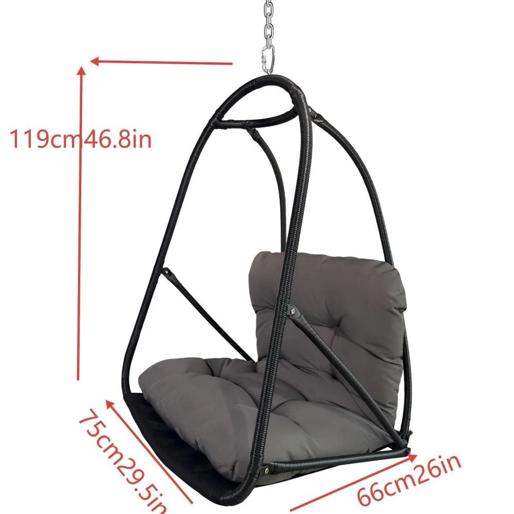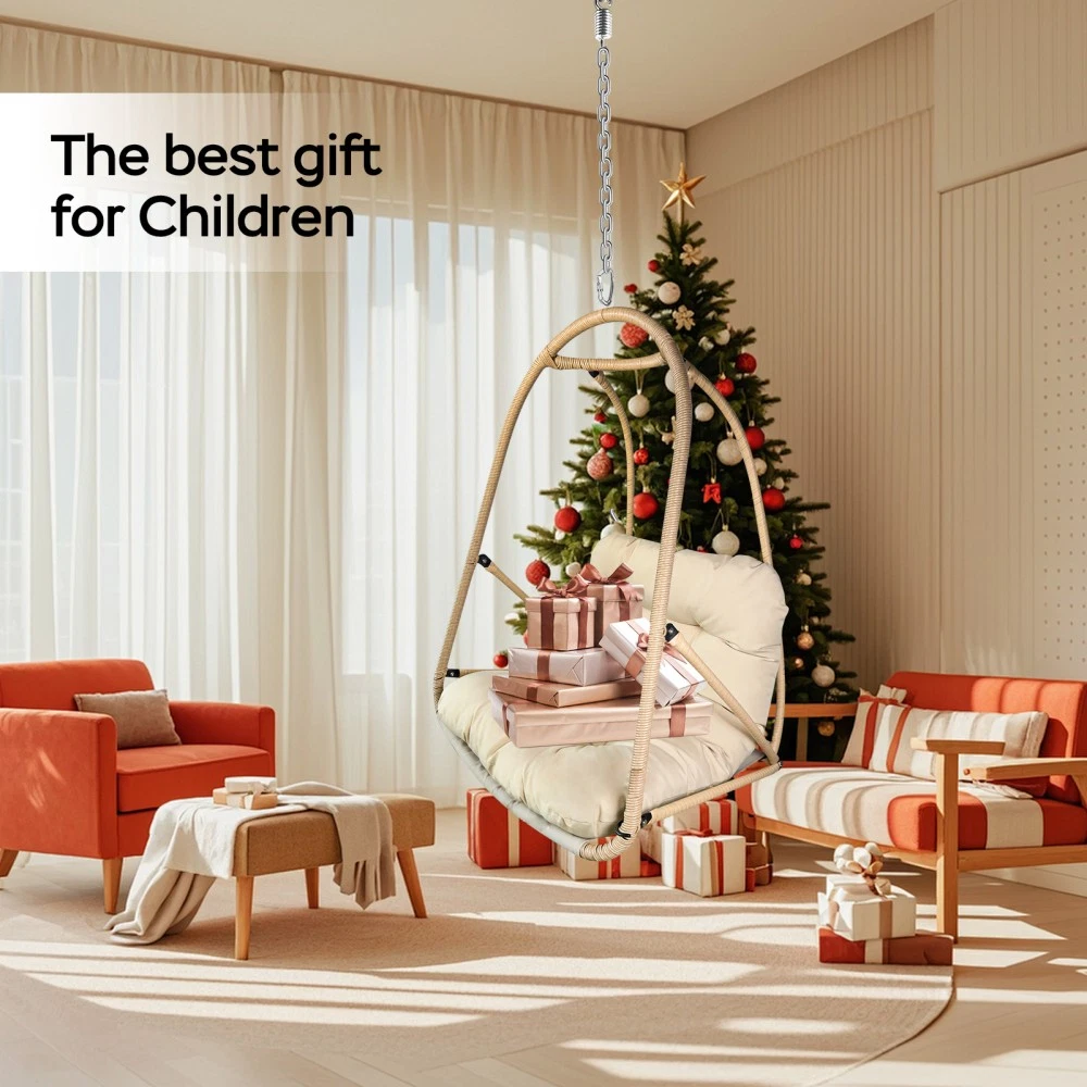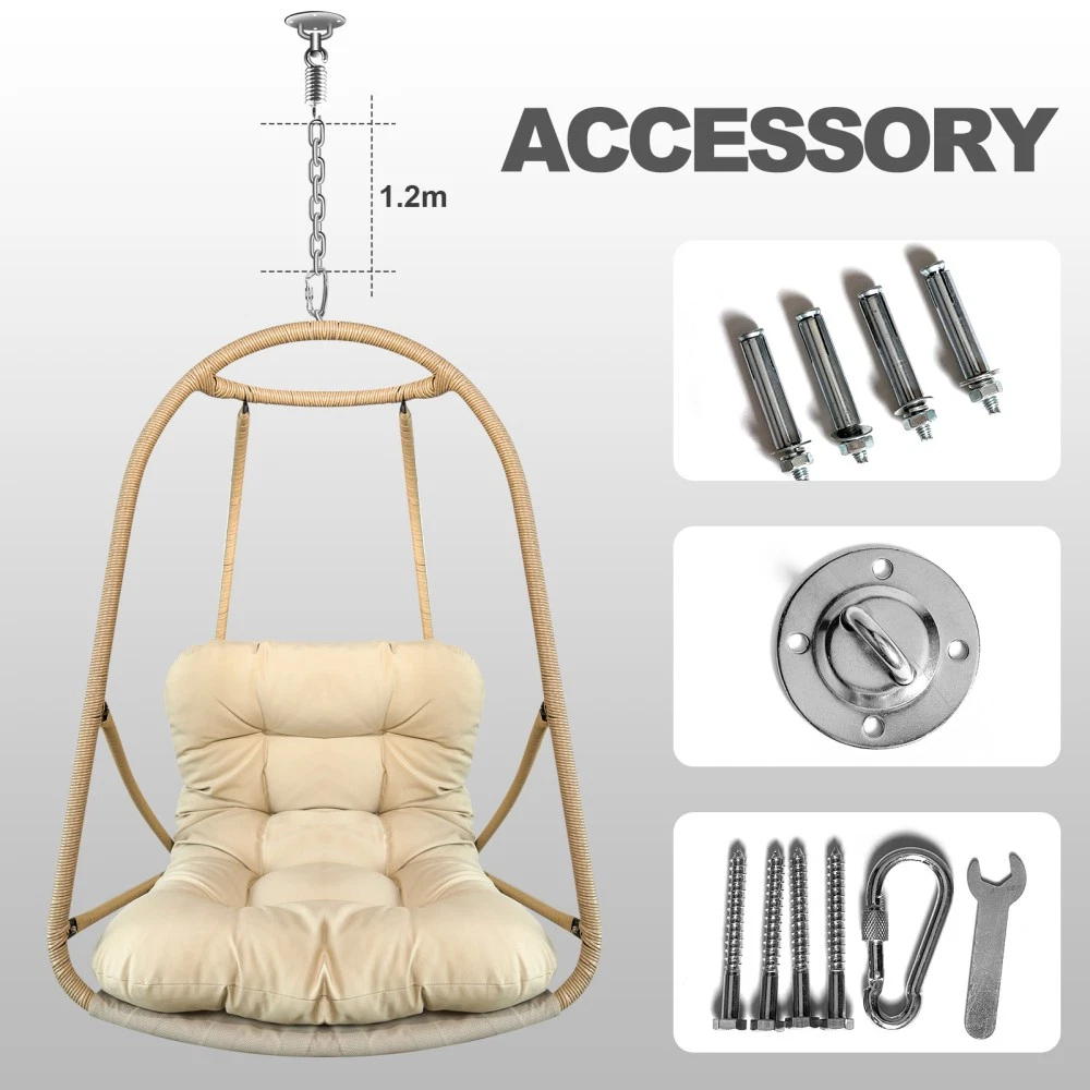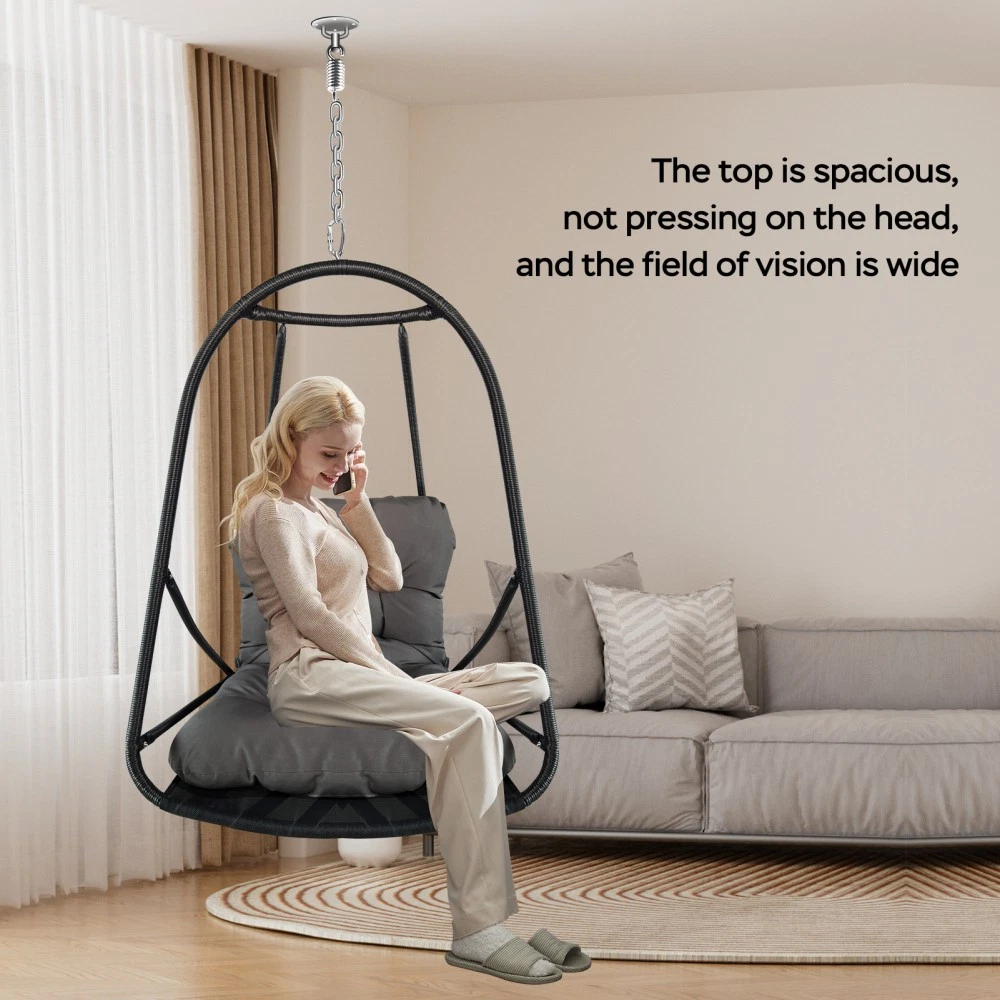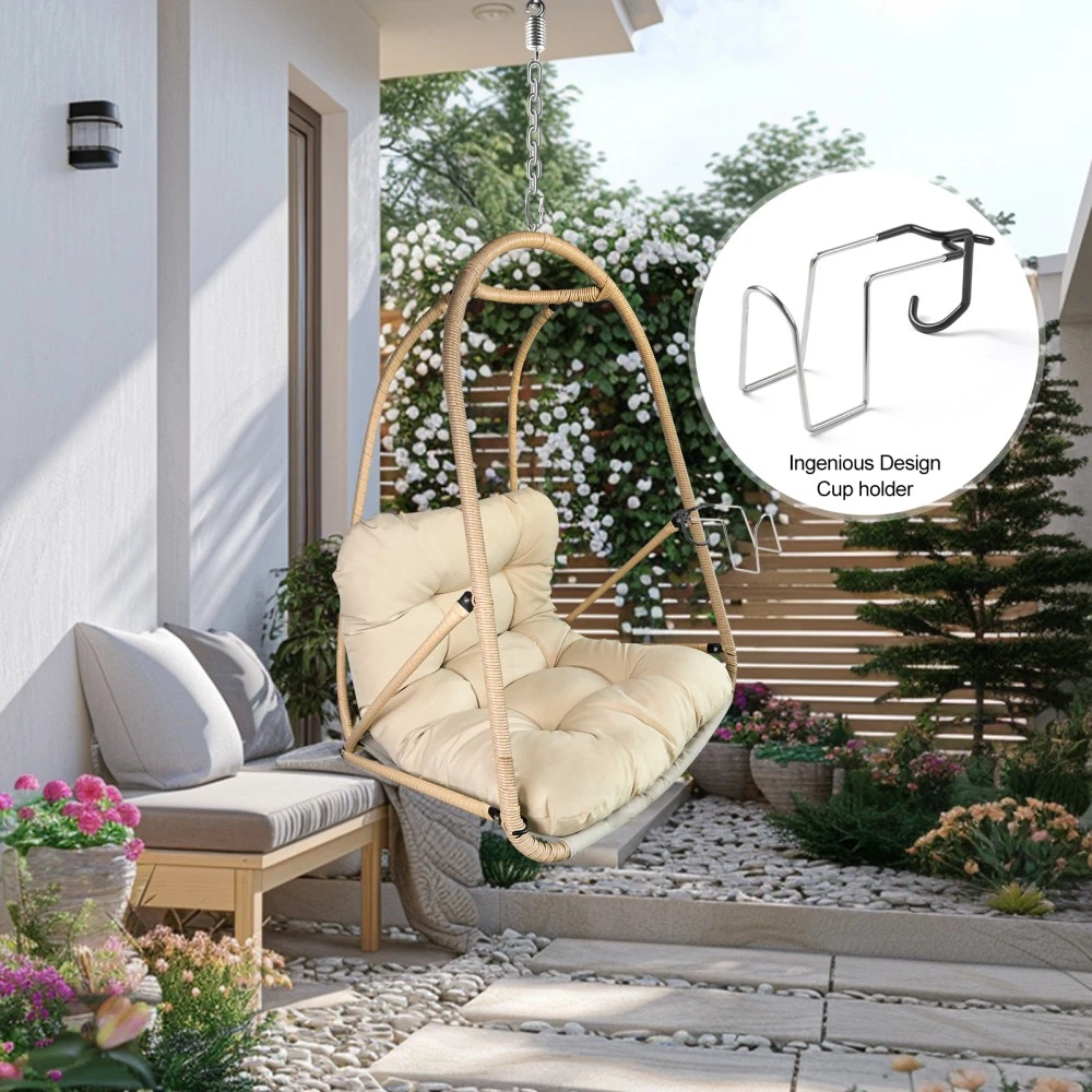 1-Year Warranty & 30-Day Free Return! Shop with confidence knowing your purchase is protected by our hassle-free warranty and return policy. If you have any issues, we've got you covered. Product Dimensions Assembled Length: 38.00 inches Assembled Width: 38.00 inches Assembled Height: 78.00 inches Product Weight: 18.00 lbs Weight Capacity: 350 lbs Packaging Dimensions Length: 43.30 inches Width: 29.50 inches Height: 6.69 inches Package Weight: 22.00 lbs Key Features ✅ Special Design with Built-in Cup Holder Keep your favorite drink within arm's reach with our uniquely designed cup holder. Perfect for enjoying coffee, iced tea, or soda while relaxing—no more balancing cups on nearby surfaces! ✅ Sturdy & Weather-Resistant Construction Crafted with a powder-coated metal frame to prevent rust and corrosion, ensuring long-lasting use both indoors and outdoors. The frame and seat are wrapped in high-quality resin wicker that offers 3-year anti-aging protection against sun, rain, and wind. Equipped with 304 stainless steel hooks and hardware, plus a 4-point support system for maximum safety and reliability. ✅ Ergonomic Comfort & Foldable Design The curved mid-back follows your body's natural shape, providing full-body support. Soft, UV-resistant thick cushion and headrest pillow reduce head and spine pressure, delivering ultimate comfort for hours of relaxation. Foldable design adds safety (prevents unsupervised play by kids) and saves space for storage or transport. ✅ Easy Assembly & Portable Everything you need is included in the box: chair, headrest pillow, seat cushion, safety strap, and all hardware. With the provided tools, one person can assemble this hanging chair in just a few minutes. Lightweight design makes it easy to move between your patio, backyard, living room, or bedroom. ✅ Perfect Gift Choice This stylish and comfortable egg swing chair is an ideal gift for kids, family, or friends on Christmas, New Year, birthdays, or other holidays. It's a great addition to any home or outdoor space! Note: This product does not include a stand. Customization services are available—please contact the seller for specific requirements.