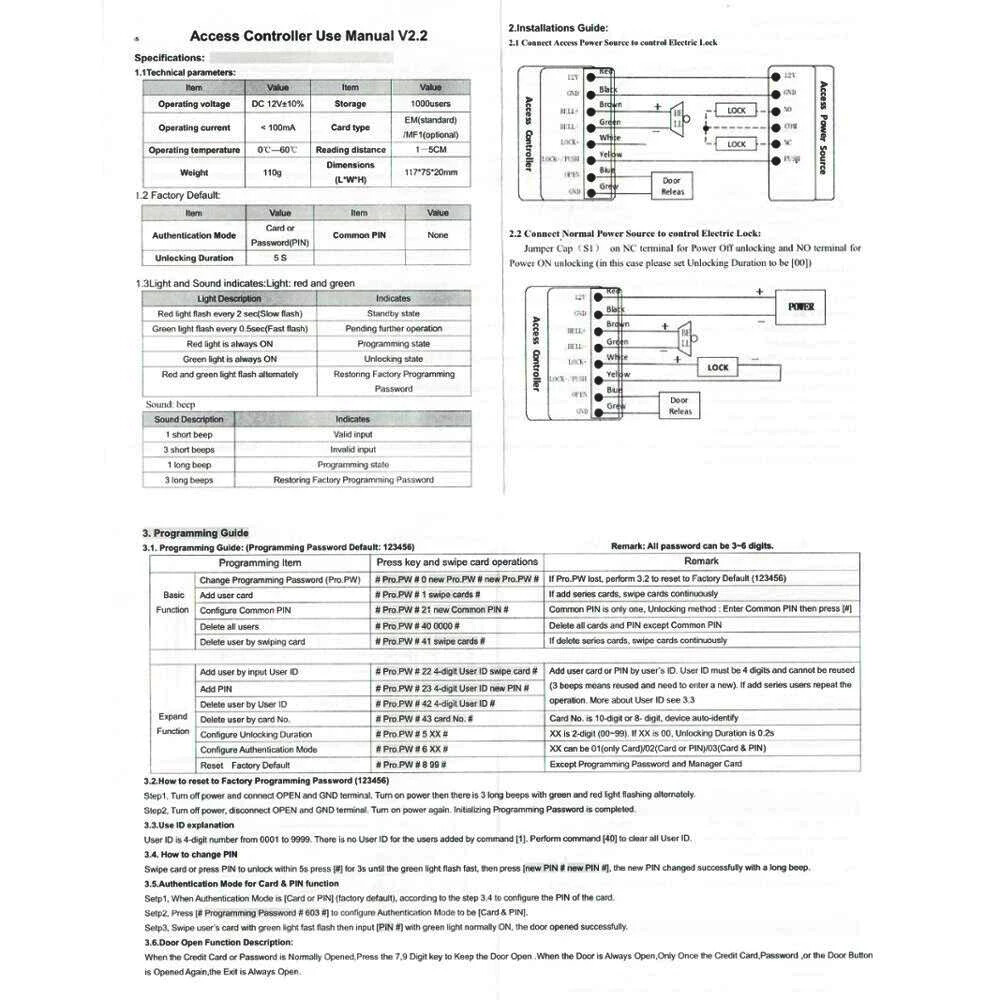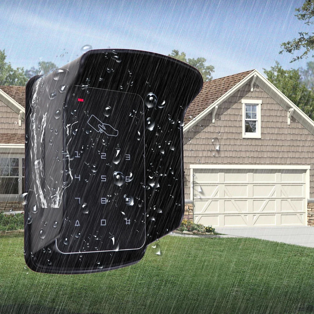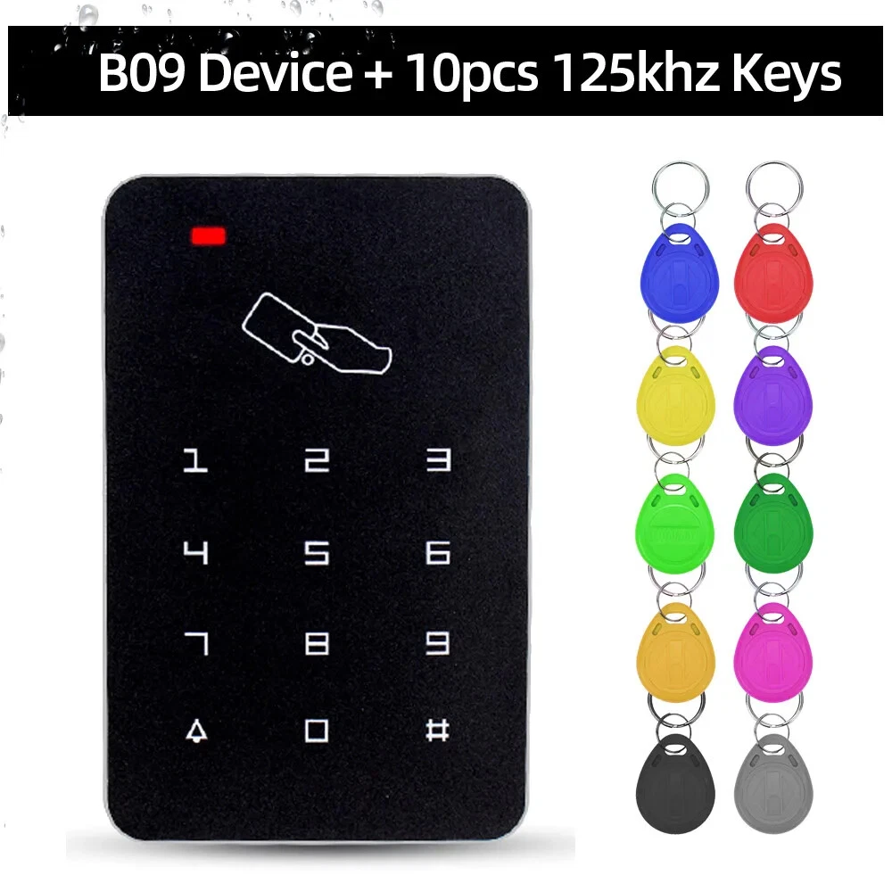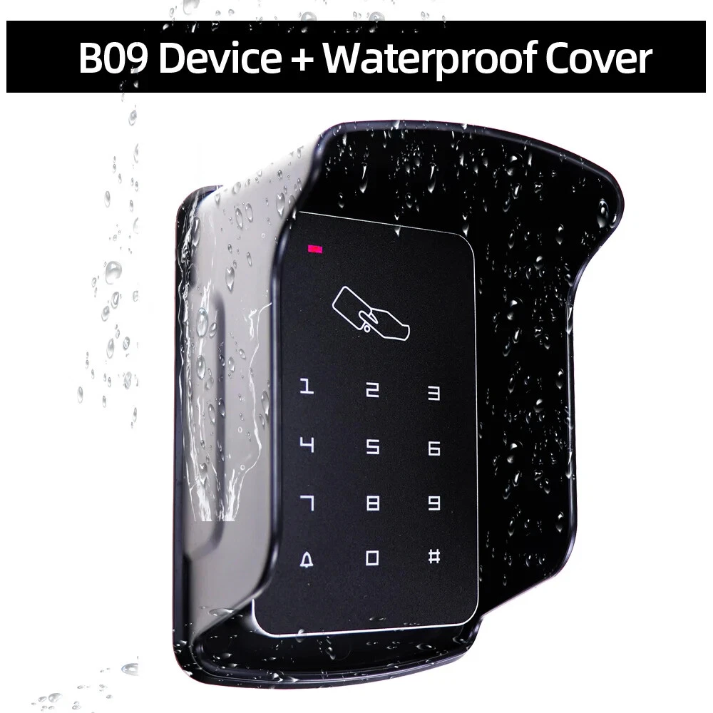 B09 125KHz RFID Standalone Access Control Features: High quality and high security. Sensitively and response quickly. 1000 standard users optianal. Support card, password, password plus card to open the door With door bell button Classical Appearance with useful function. Professional design for Home and Office. Support one-door Can be used as a stand alone keypad Doesn't need to connect on the computer, can works alone Application: Home/ hotel/ office/ apartment/ foctory, etc Specifications: User Capicity: 1000 user Dimension: 75*117*22mm(L/H/W) Working Frequency: 125KHz Working Voltage: DC12V Working Current: <100mA Working Temperature: -10 to +70 Reading Distance: 0-10cm Relative Humidity: 20%-90% Support 1000 user cards. and 3-6 digits password. Has 3 different unlock method It can be installed outdoor with Rainproof cover Made of High quality material, safe and durable ABS fireproof material, make the product more secure and durable, anti-vandal, anti-tamper, suitable for different enviromental installation. (The surface is waterproof, but not IP65 waterproof, can't be used under the heavy rain) 10pcs RFID Keyfobs Material: ABS Dimensions: Approximately 35 x 29 x 50mm Response frequency: 125 KHz, Chip type: EM4100, TK4100 Operation Temperature : -40 - 85°C Waterproof Each comes with Key ring included. Each token pre-programmed with unique ID which is Laser printed Colors : 10 colors are available (we will send with random colors, if need speciafy the colors, please leave message in the order note) Rainproof Cover This waterproof shell is suitable for fingerprint device, access controller, standalone rfid door access controller, which length is less than 13cm, width is less than 8cm. Dimension: Outside: 15cm*10.4cm*9cm (L*W*H) Inside: 13.5cm*8.9cm*8.4cm (L*W*H) Wiring Diagram The power supply and electric lock, exit button, door bell is not included in the package, if you need it, please contact us