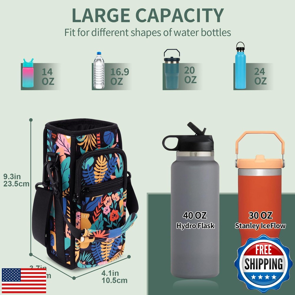 Desing Wish Water Bottle Carrier Bag for Stanley Iceflow Cup 17-30 oz, Large Opening Water Bottle Holder with Strap for Hydro Flask 24 32 40 oz Neoprene Insulated Water Bottle Sling (Jungle Leaf) Features π SQUARE MOUTH DESIGN - This water bottle holder with strap is different from other water bottle bag in that it has a square appearance and can stand on a flat surface more stably. Keep drinking water to stay hydrated when going outdoors without holding a heavy bottle with hands all the time. Compatible with Stanley Iceflow Cup 17 20 22 30 oz and Hydro Flask 24 32 40 oz water bottles. π TWO CONVENIENT POCKETS - There are two pockets outside of the water bottle carrier with strap so that you are able to take something necessary with you for walking. Large pocket (7 x 3.8 in) for storing cell phone, keys, earphones, passports, etc. Small pocket (5 x 3.5 in) for holding ID, credit cards, cash, etc. Large pocket fits most smartphones up to 6.5'' height with cases. π TWO WAYS TO CARRY - Designed with adjustable shoulder strap and padding handle strap, our water bottle sling has two ways of carrying for you to choose. Free your hands and very comfortable to wear. Always remember to keep hydrated wherever you go. Suitable for stainless steel bottles, sports bottles, soft drink, travel coffee mugs, etc. π COMFORTABLE FABRIC - Made of premium thicker neoprene material, this water bottle carrier has high softness, elasticity and comfortable hand feeling. It can protect your bottle well and prevent water bottle from dings and dents during long-term use. π WIDE APPLICATION - Our water bottle holder for walking is very useful for your life. Ideal for daily commuting, work, hiking, walking, fitness, camping, going to the beach, traveling and so on. Suitable for all kinds of people such as office workers, mothers, sports enthusiast. All teens, adults and the aged can easily use the water bottle bag. Shipping Free & Fast Shipping: We offer free shipping to most of the USA with a normal delivery time of 3-7 days. However, due to the current situation, additional delivery time (up to 3 weeks) may be required for some items. Alternative Carriers: We may use alternative carriers (e.g., USPS, FedEx, UPS) to ensure your package arrives safely and on time. Due to the use of multiple carriers, we are unable to provide a tracking number automatically. Handling Time: Orders are processed and shipped within 1-2 business days of receiving cleared payment. Shipping Restrictions: Shipping to Alaska, Hawaii, Puerto Rico, Guam, and other US territories may incur shipping charges or delivery restrictions. Please contact us before ordering, or your order can be refunded/cancelled. State Restrictions: Certain items may not be shipped to California due to state regulations. Contact for Tracking Updates: If you require tracking updates or have any concerns about the delivery of your order, please feel free to contact us, and we will be happy to assist you. Return Policy 30-Day Hassle-Free Returns: If you are not completely satisfied with your purchase, you can return the item for free within 30 days of receiving it for a full refund or exchange. Easy Return Process: Contact us, and we will provide you with a prepaid return shipping label and detailed instructions. No Restocking Fee: There are no restocking fees for returns. However, the buyer is responsible for return shipping costs if the return is not due to a seller's error. Refund Processing: Refunds will be processed within 1 business day of receiving the returned item in its original condition. Payment We accept all major credit cards, PayPal, and Apple Pay for your convenience. Your payment information is secure and encrypted to ensure a safe and seamless transaction. Please complete your payment within 3 days of purchase to avoid any delays in shipping. Feedback Your feedback is extremely important to us. We strive to provide the best products and customer service possible. If you are satisfied with your purchase, please take a moment to leave us a positive review. If you have any concerns or issues with your order, please contact us before leaving negative feedback. We are committed to resolving any problems and ensuring your satisfaction. Contact Us If you have any questions or concerns, please feel free to reach out to our customer support team. You can contact us through the eBay messaging system. We are available Monday to Friday, 9:00 am to 5:00 pm EST, and we will do our best to respond to your inquiry within 24 hours. Thank you for supporting our small family business!