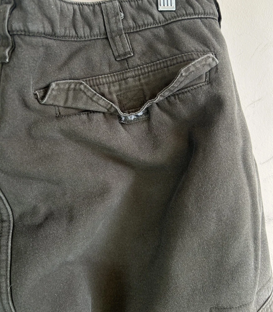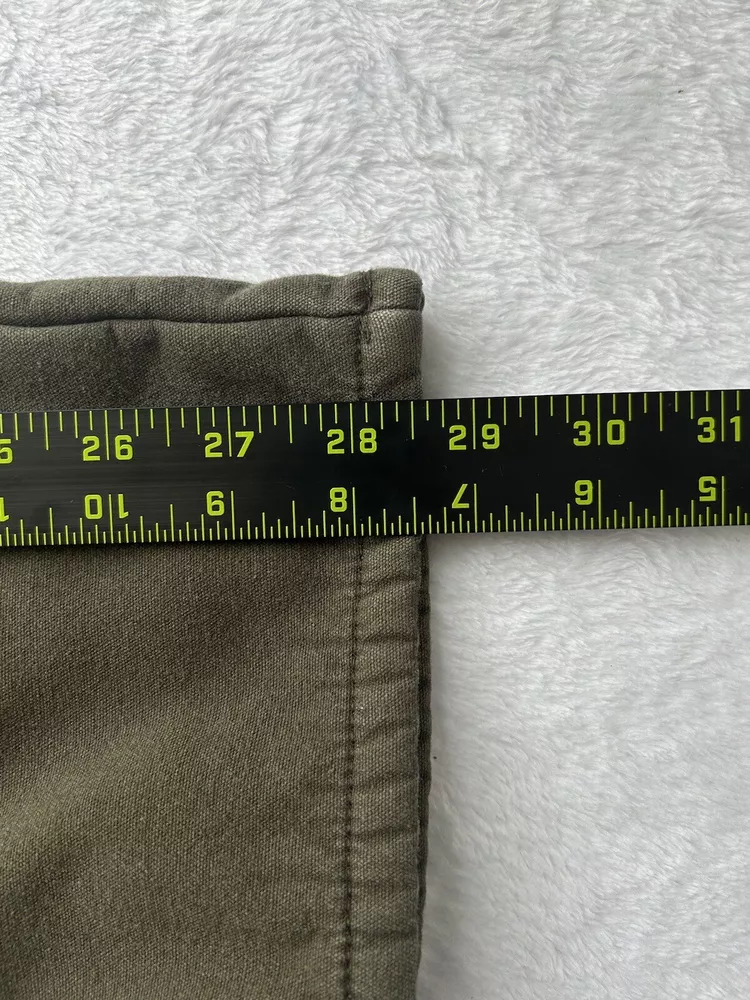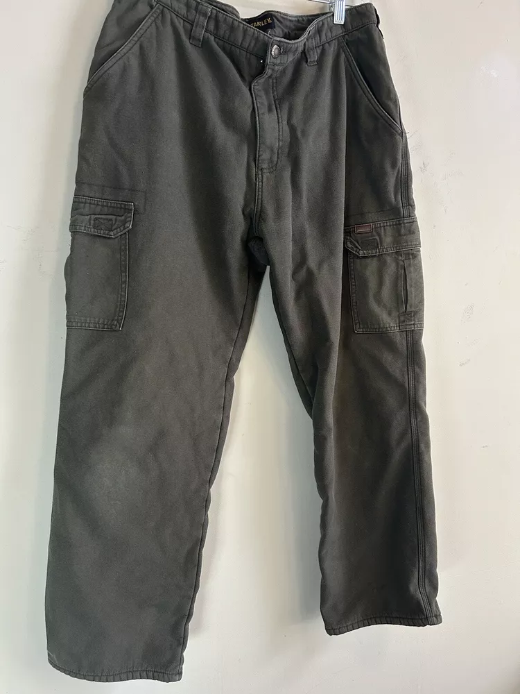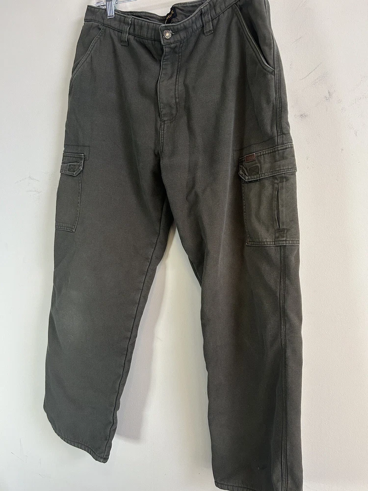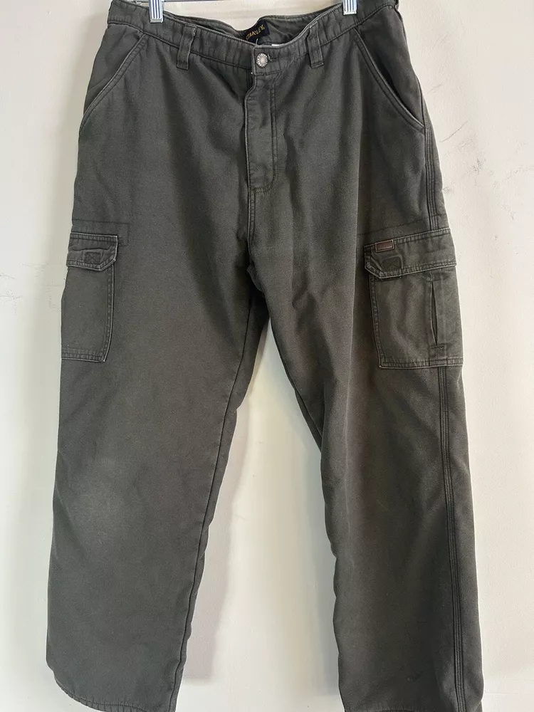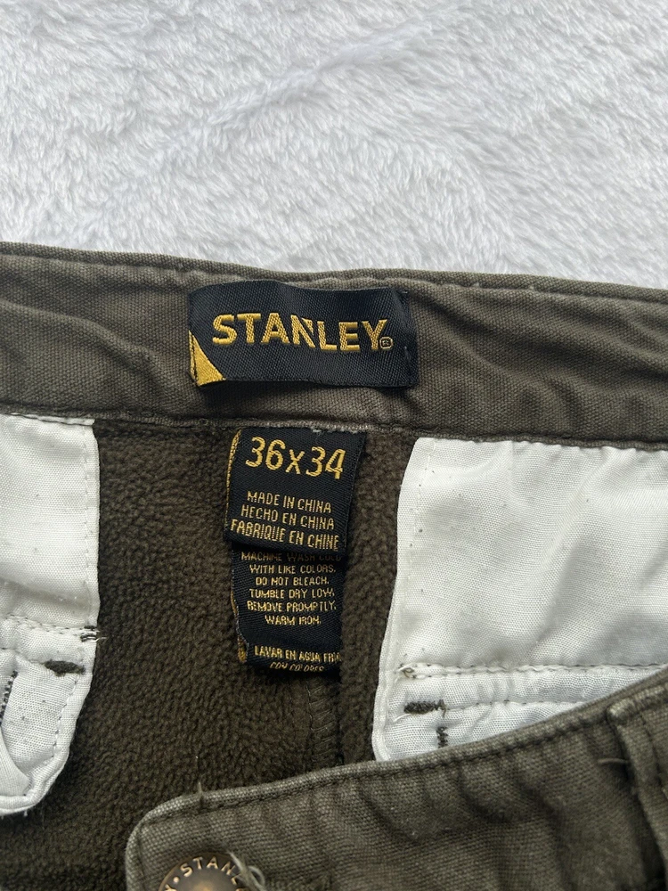 Upgrade your workwear with these Stanley pants gray(greenish) color and carpenter style. Made of a cozy blend of polyester and cotton, these pants have a flat front and straight leg style, with a mid-rise waist of 36 inches. They feature a zip and button closure, and are lined with fleece for added warmth, making them perfect for fall, winter, and spring seasons. These pants have pockets for practicality, and are machine washable for easy care. The size type is regular, with a fit that's just right for everyday wear. Get these solid-colored pants for your next work project, without worrying about their condition. Tag says 36/34 but measures 34/30