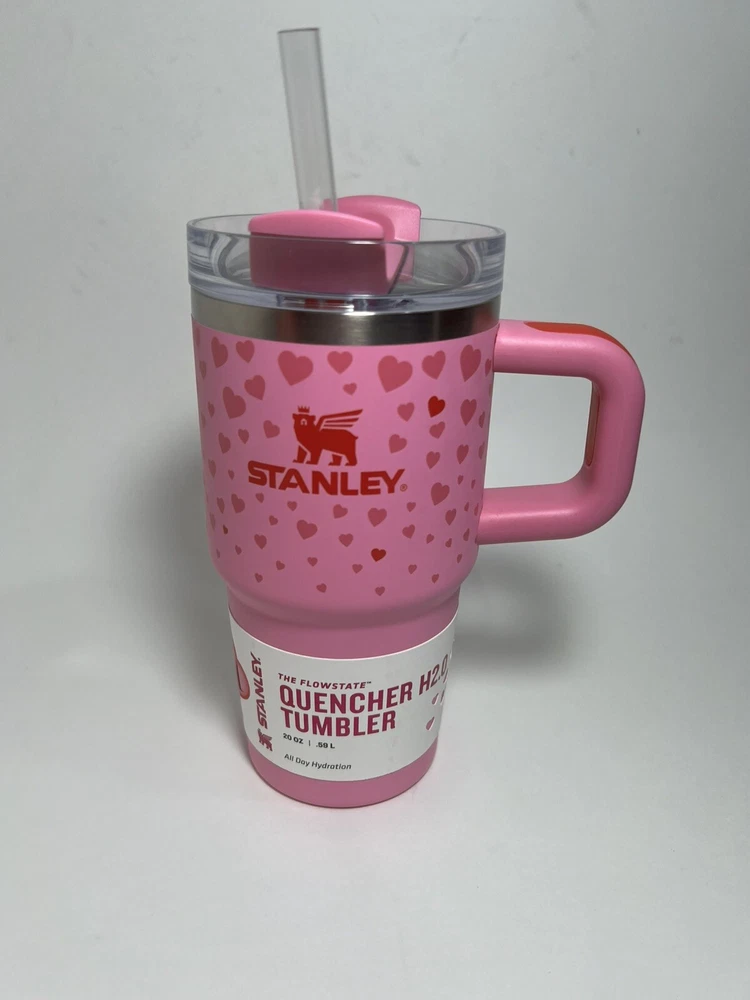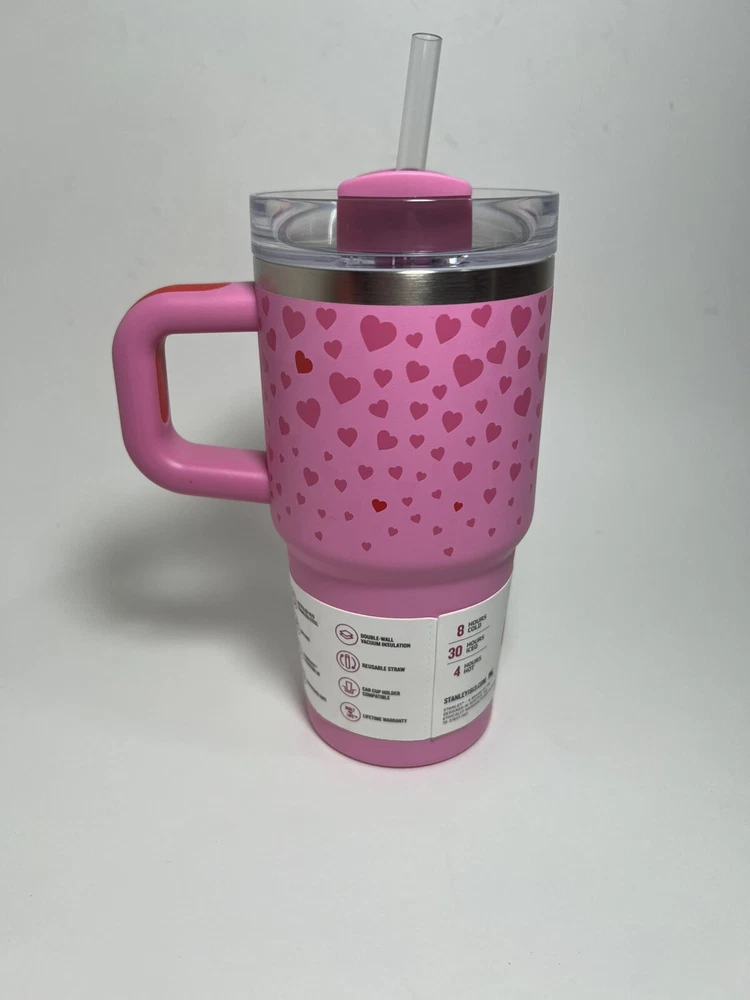 The Stanley Target Valentine's Day 20oz Tumbler features a charming design with sweet hearts, perfect for celebrating love on Valentine's Day. The tumbler is in the shape of a heart and is adorned with a pattern of hearts, making it a delightful choice for enjoying your favorite beverages. This item is currently in hand, ready for immediate use or gifting. Ideal for Target enthusiasts and those looking to add a touch of love to their drinkware collection.
