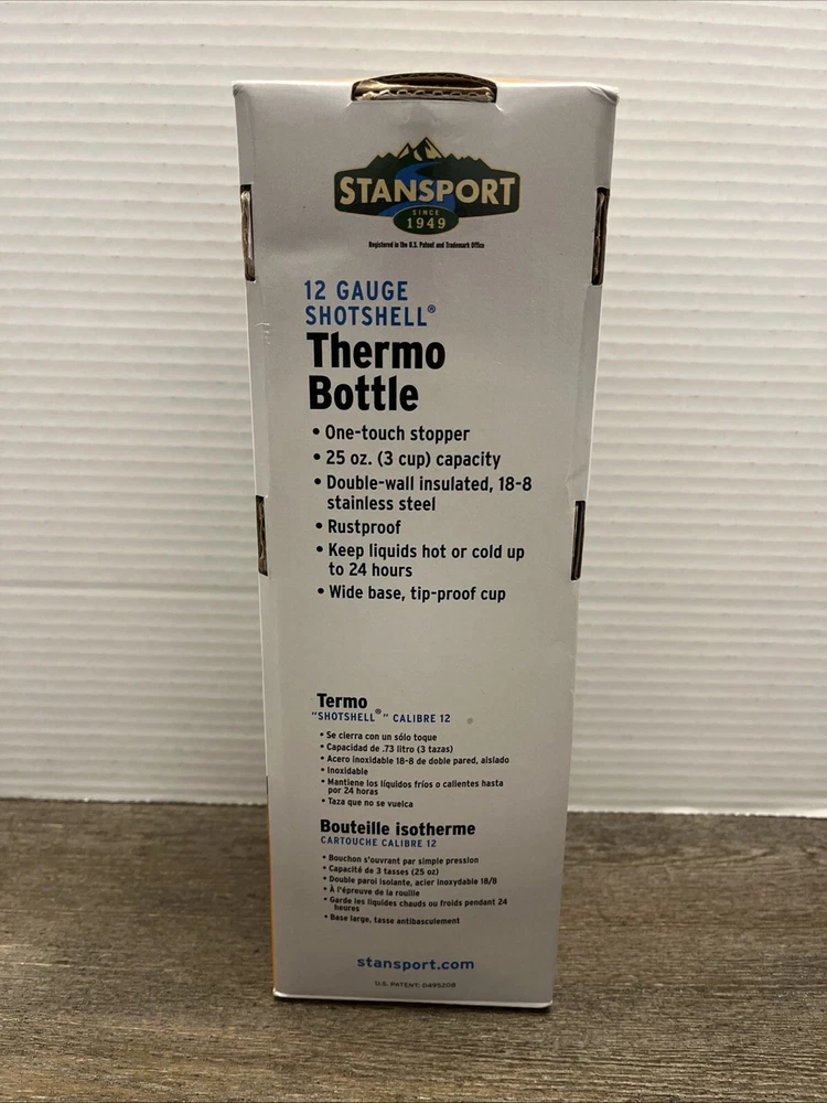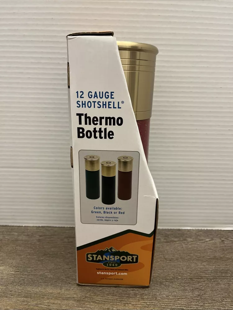 The Stansport 12 Gauge Shotgun Shell Red Thermo Bottle is a 25 oz stainless steel bottle with a screw-on lid. It features a double wall design and is suitable for hot beverages. The bottle is themed around activities like fishing, hunting, camping, and hiking, making it a practical and fun accessory for outdoor enthusiasts.
