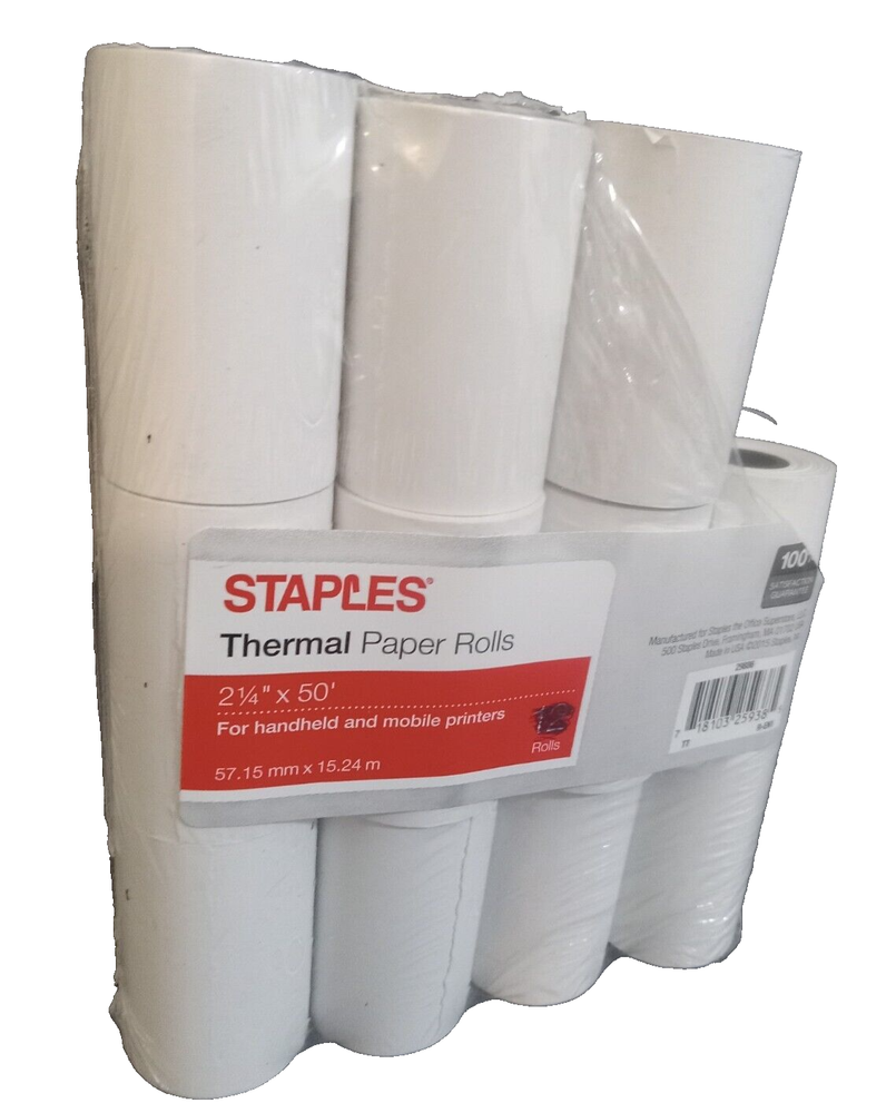 Staples Thermal Paper 2 1/4 x 50 11 Rolls Credit Card POS Cash Register Open *** Item Specifics *** Brand - Staples Condition - New Open Type - Thermal Paper Color - White Size - 2 1/4 x 50 Material - Paper Style - Traditional Gender - Unisex Adults Pattern - Solid Made In - USA Vintage - No Width - 2 1/4 x 50 PLEASE READ CAREFULLY !!! *** All Photo's Are Of The Actual Item(s) That You Will Receive Guaranteed *** *** Please Inspect Your Items That You Receive To Assure That They Arrived Safely *** We Ship From The U.S ***(1 Or Same Day Handling Time) If Item(s) Are Purchased On Or Before 1 PM EST Your Item(s) Will Be Shipped The Same Day Of Purchase.. We Offer FREE 30 Day Money Back Guarantee Returns On All Items . Thank You For Stopping By And Have A Great Day !!