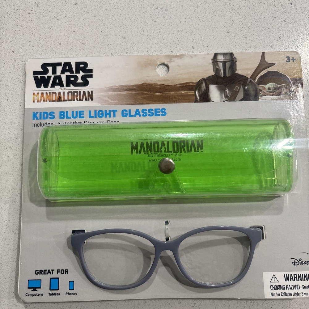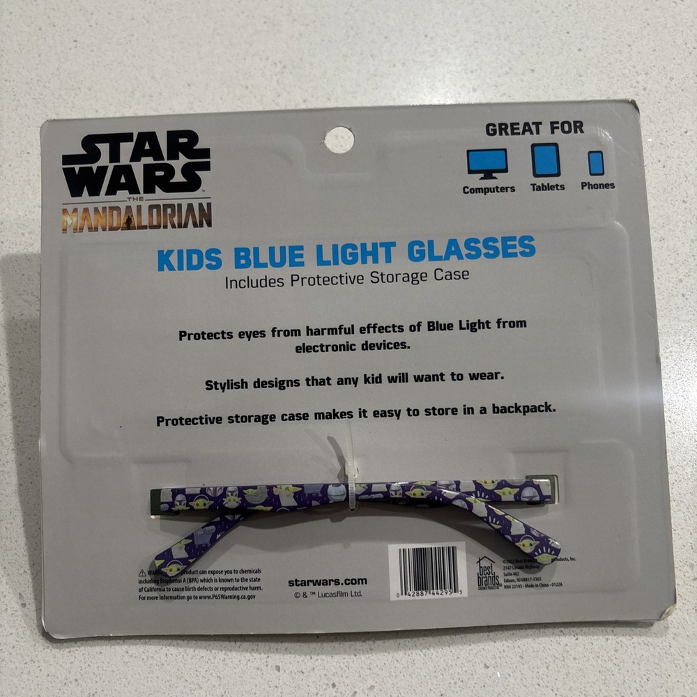 The Star Wars The Mandalorian Kids Blue Light PROTECTION Glasses are designed with a stylish gray purple frame featuring the iconic Mandalorian character. These blue light blocking glasses are great for protecting young eyes from the harmful effects of screens while allowing them to enjoy their favorite Star Wars-themed activities. With a durable plastic frame and clear glass lenses, these glasses are perfect for computers, tablets, and phones. The product also comes with a convenient storage case, making it easy to keep the glasses organized and safe when not in use.