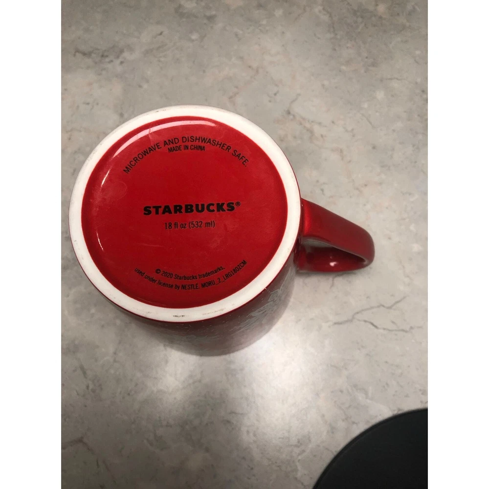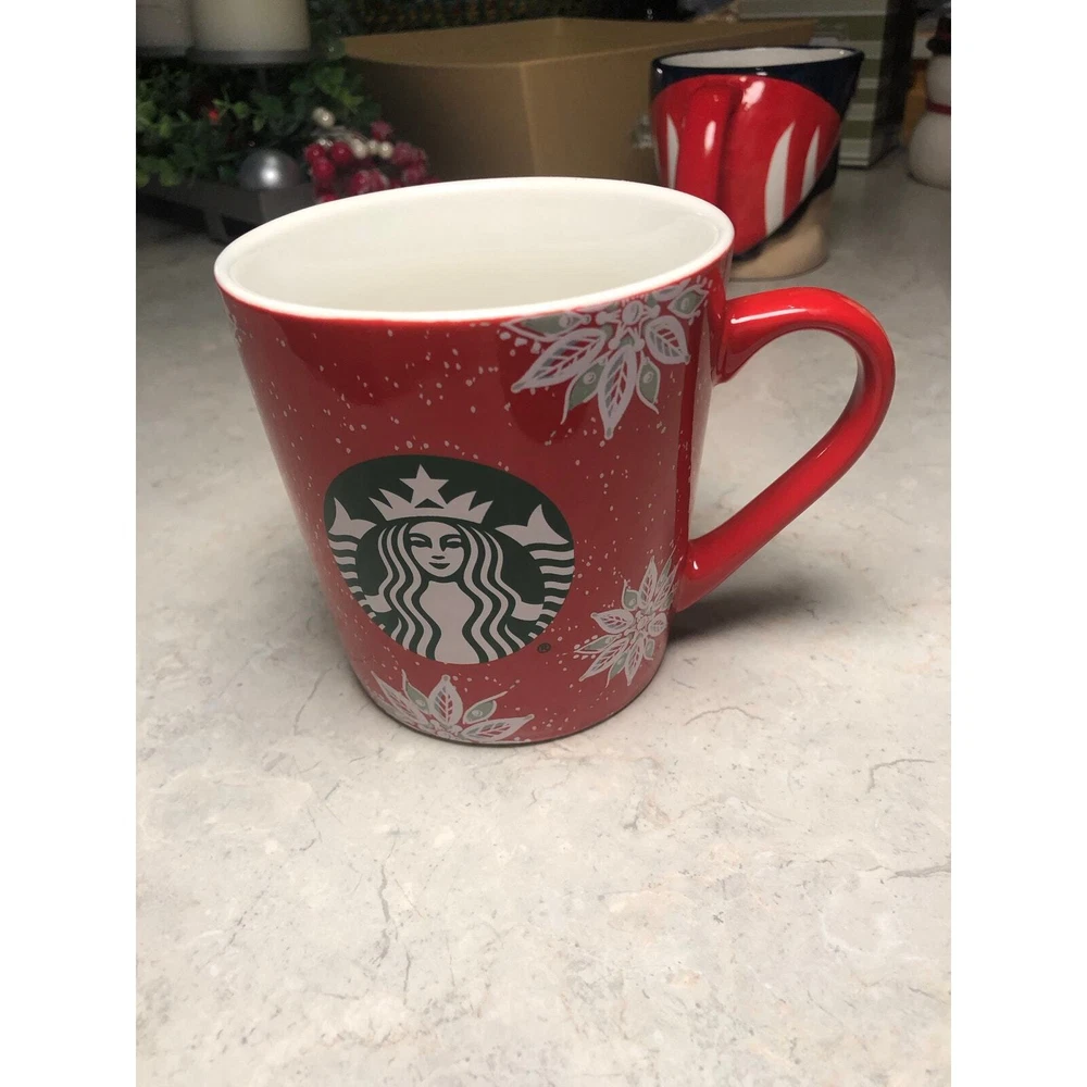 Starbucks Large 18oz Christmas Coffee Mug Red with snowflake and white and green Poinsettias New without tags