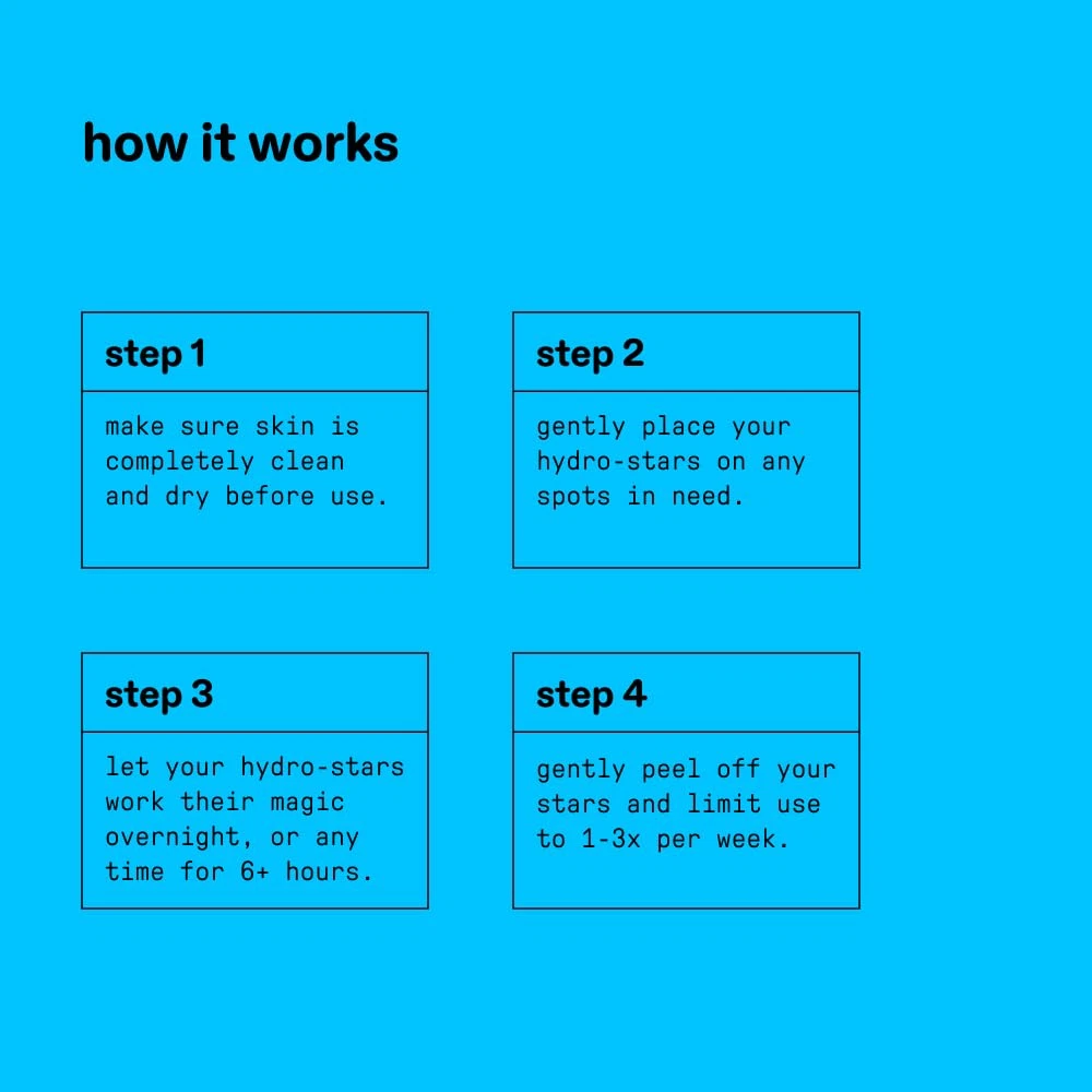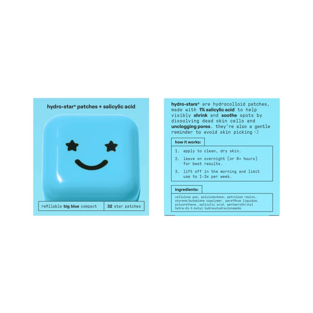 Store New Arrivals Add to Favorite View Feedback Contact Starface Hydro-Star + Salicylic Acid Pimple Patches and Big Blue Compact, Helps Shrink and Soothe Deeper Spots, Cute Star Shape, Vegan, 32 Count Description Color Big Blue Compact Hydrocolloid + Salicylic Acid Item Form Patch Brand Starface World Country of Origin China Product Benefits Shrinks Spots Manufacturer Starface Scent Unscented Package Dimensions 2.36 x 2.32 x 1.34 inches; 3.17 ounces Material Type Free Paraben Free NEW LOOK: Your favorite refillable compact with a mirror inside, now in the cutest blue color. Big Blue is filled with 32 Hydro-Star + Salicylic Acid patches that help visibly shrink spots. CUTE & EFFECTIVE: These star-shaped spot protectors are made with hydrocolloid and 1% salicylic acid to help dissolve dead skin cells and unclog pores while looking cute. STAR INGREDIENTS: Salicylic acid, a powerful beta hydroxy acid, is combined with hydrocolloid to help soothe spots, absorb fluid, and reduce redness. FOR EVERYONE, ALWAYS: Hydro-Stars are vegan, cruelty free, and dermatologist tested. EASY TO USE: Apply to clean, dry skin. Leave on overnight (or 6+ hours) and limit use to 1-3x per week. When you run out of stars, refill your compact with a new pack of Hydro-Star + Salicylic Acid. Product Description ABOUT US We offer the best prices around on high quality products. Our E-store includes media such as books, movies, music and games while offering electronics, toys, sporting apparel, clothing, tools, general home, garden items and more. SHIPPING We are always working hard to ensure your package arrives as soon as possible. Please understand that some factors like weather, high postal traffic, and the performance of shipping companies are outside of our control. We offer free shipping to the lower 48 states and ship within 2 business days of payment, usually sooner. We do not accept P.O. Boxes. Please provide a physical address. RETURNS We offer a 30-Day Return Policy on items which you are not completely satisfied with. You have the option for a full-refund or an exchange of the item. No returns are available on items shipped outside of the USA. PAYMENT We accept PayPal. CONTACT US This page content is yet to come Please ad us to your favorite seller and visit again later Thank You CUSTOMER SATISFACTION We try our very best to make sure every customer is completely satisfied. If there's a problem, message us! We're happy to help.