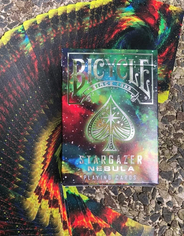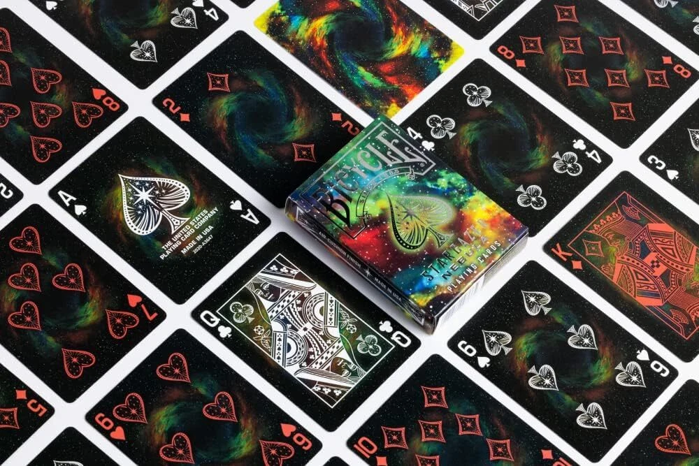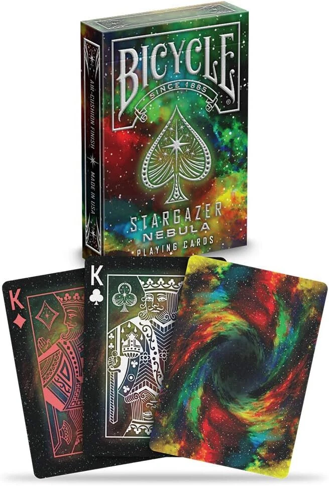 SPACE THEMED PLAYING CARDS: With our Bicycle Stargazer Nebula Playing Cards, you'll not just play a game, but journey through cosmos. The backs of these black playing cards showcase swirling gases, transforming this deck of cards into a celestial vista FOILED COSMIC CARD TUCK: Encapsulated in a nebula themed foil tuck box, this cool deck of cards provide an outer space experience. It's not merely a container, but a gleaming portal, inviting you to traverse the galaxy within TRUSTED BICYCLE QUALITY: Experience the feel of perfection in every game with these high quality playing cards. Each card boasts an Air Cushion Finish, providing an easy handling and shuffling experience VERSATILE GAMING: These cards open the door to countless games of skill and chance. From poker and blackjack to euchre, pinochle, rummy, and canasta. Unleash your inner gamer with this versatile deck of playing cards ECO-FRIENDLY & MADE IN USA: Crafted in the USA with 100% recyclable FSC paper, our Bicycle Cards embody an unparalleled blend of sustainability and quality. Feel good about your purchase knowing these premium playing cards contribute to a greener planet Step into a cosmic realm with Bicycle Stargazer Nebula Playing Cards. Each card in this deck of playing cards features a mesmerizing image of nebulae, with swirling gases painted on the back, turning every hand dealt into a celestial spectacle. These Poker cards glide through your fingertips, their Air Cushion Finish echoing the sensation of drifting through outer space. Encased in an alluring, nebula-themed foil tuck box, this cool deck of cards opens like a portal to distant galaxies, beckoning explorers at heart. Printed on premium Bicycle cardstock, these unique playing cards showcase an elegant blend of stellar beauty and quality. Crafted with pride in the USA, each deck of cards melds cosmic charm with high quality American manufacturing, making the Stargazer Nebula Playing Cards a universe of fun right at your gaming table.