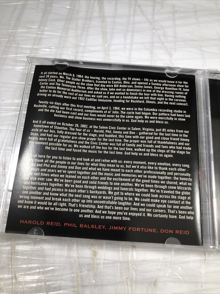 This CD features the best performances from the Statler Brothers' farewell concert, held in 2013. The album includes a compilation of their greatest hits, with live recordings of some of their most popular songs. The CD comes in a standard jewel case, with a mint (M) grading for the case and inlay conditions. The album is produced by Doug Grau, and features a Christian style with English language lyrics. The CD is the perfect addition to any gospel music collection, and is an excellent way to remember the incredible performances of the Statler Brothers.